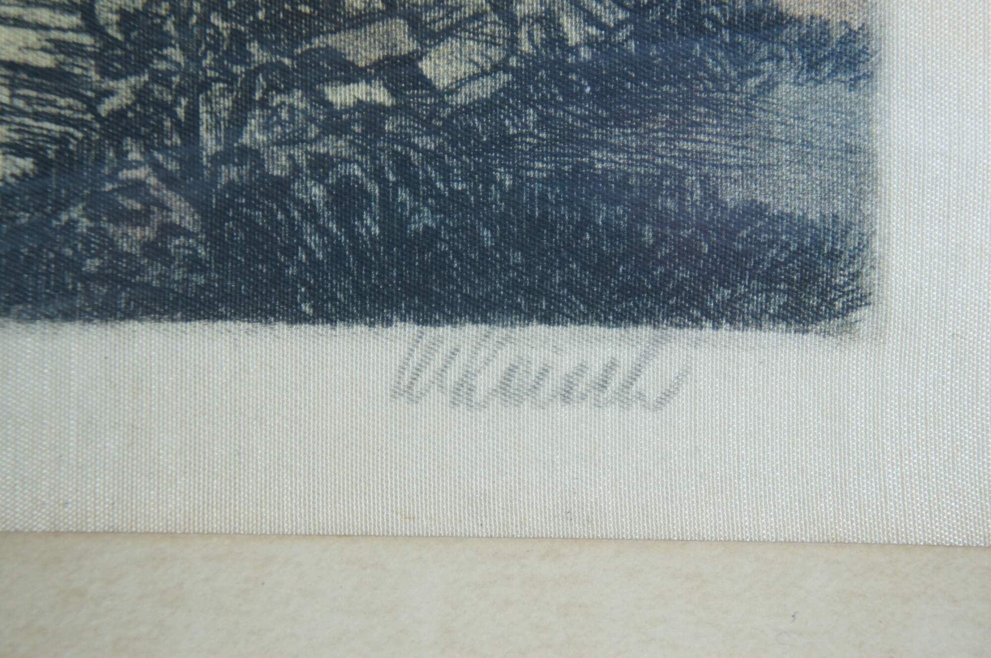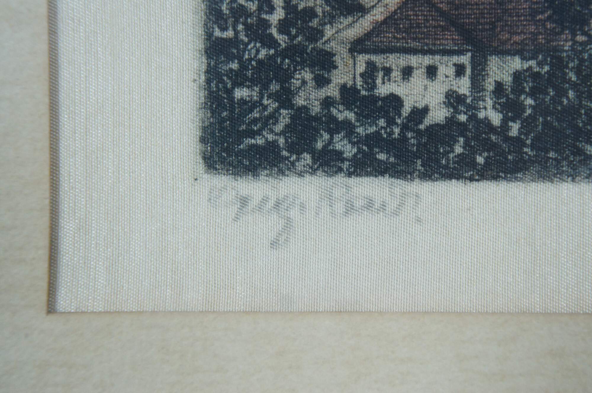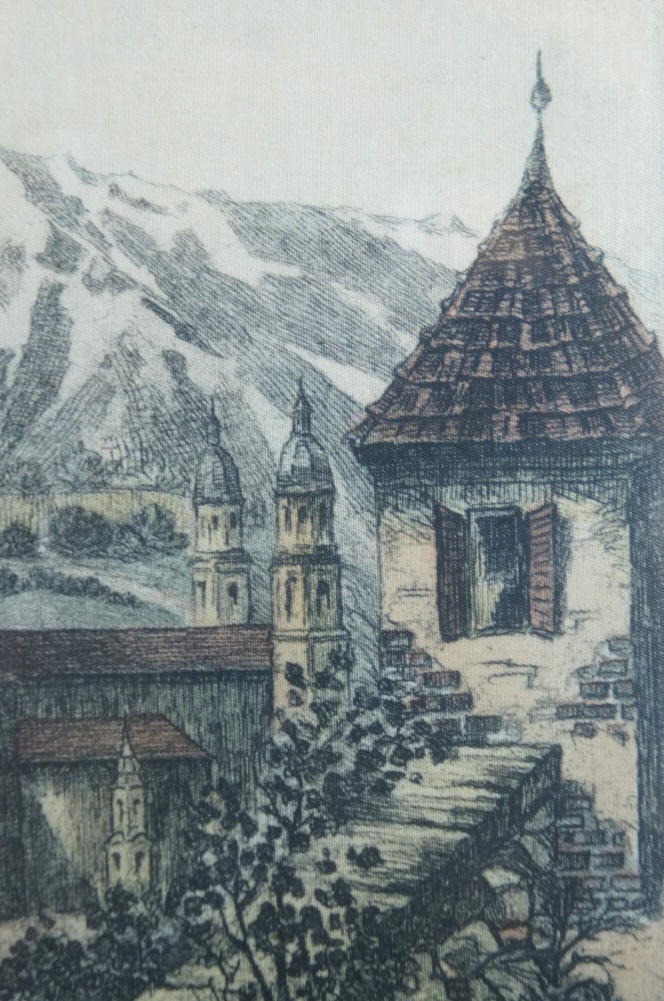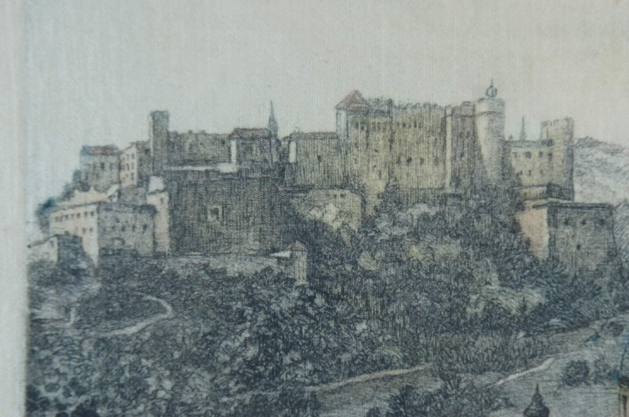 Mid to late 20th century colored etching on silk depicting a view of the city of Salzburg, Austria. Pencil marked "Orig. Rad. (Original Radierung) - Salzburg - H (W?) Leisch" along lower edge. Attributed to 20th century Austrian artist Hans Leisch. Black painted wood frame; beige mat.