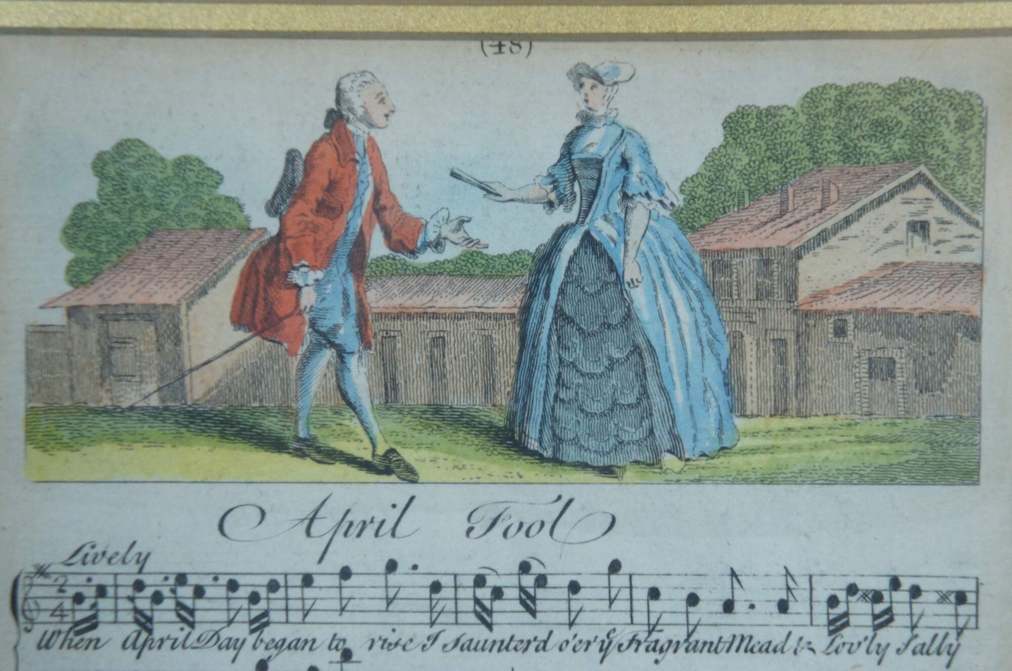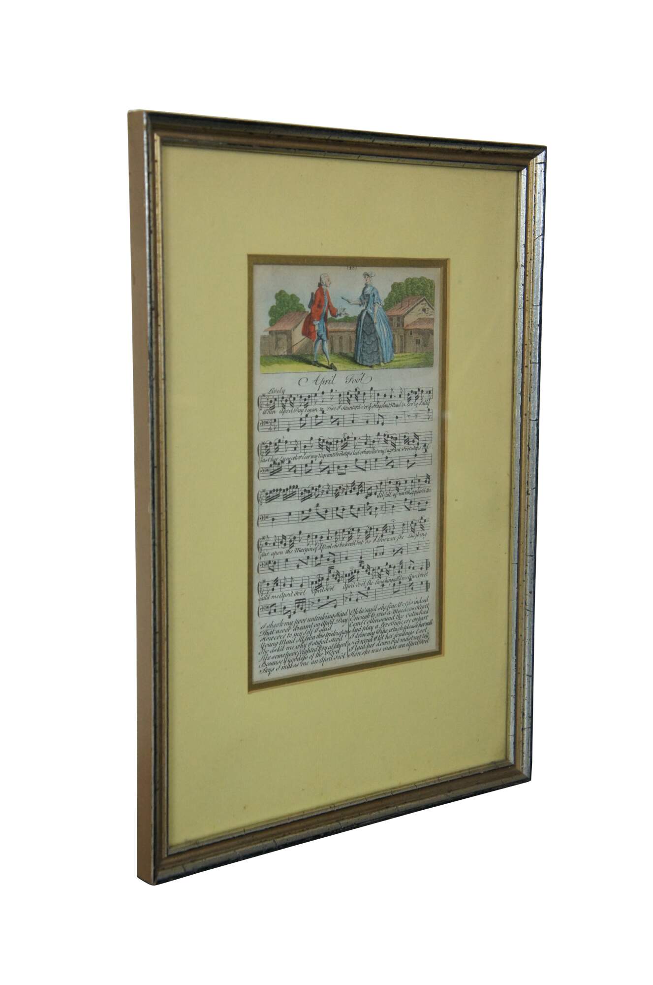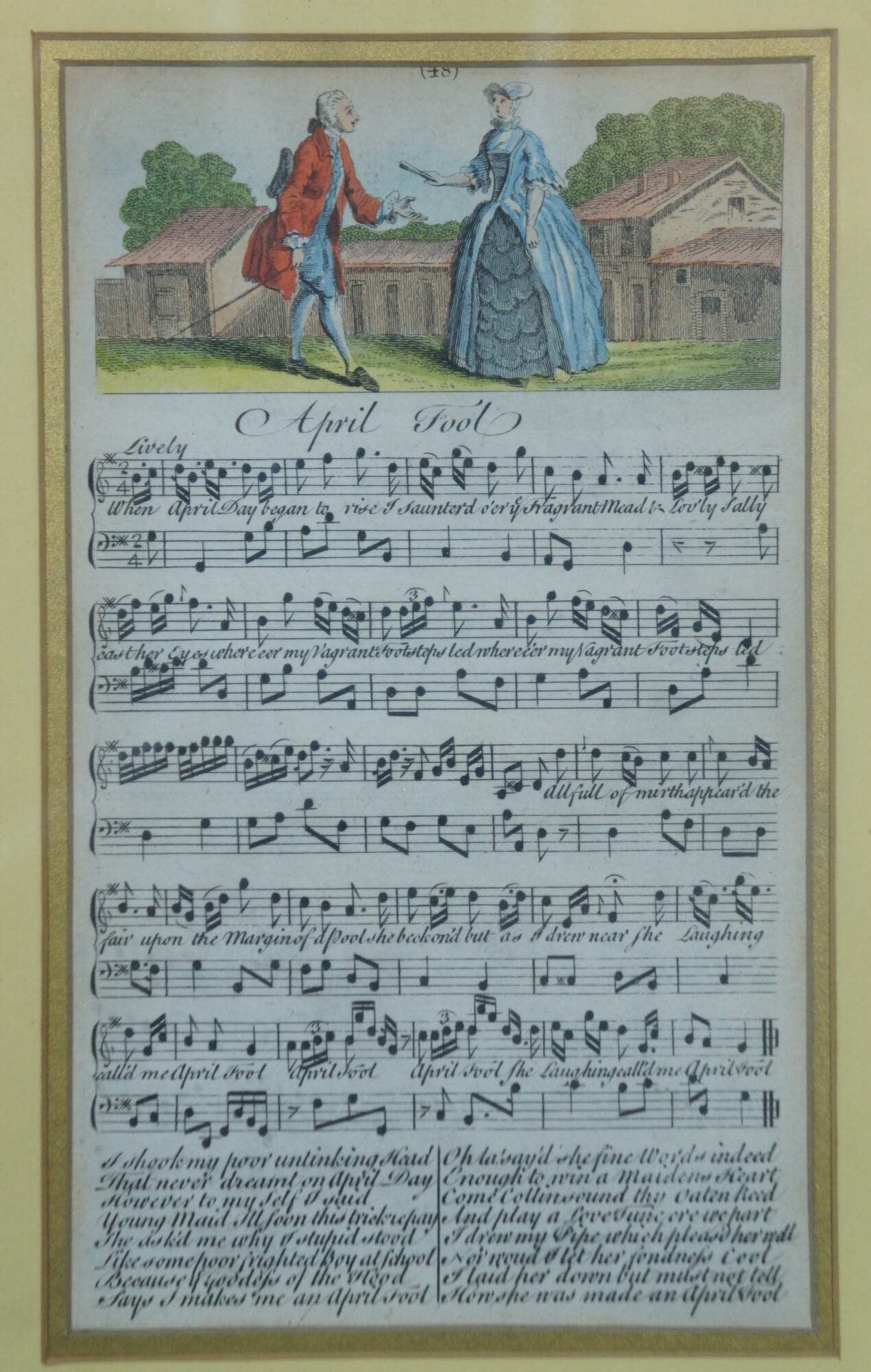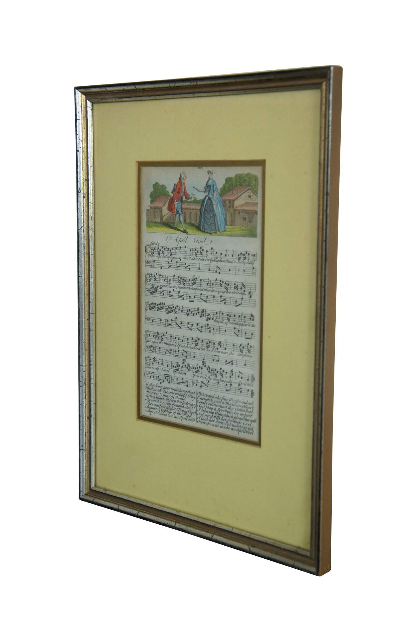 Antique circa late 18th century sheet of music for a song titled April Fool, illustrated at the top with a colored engraving of a gentleman and lady in front of a house / outbuildings. Framed in 1950 by the Rike-Kumler Company. Beveled champagne gilt frame; yellow mat.
