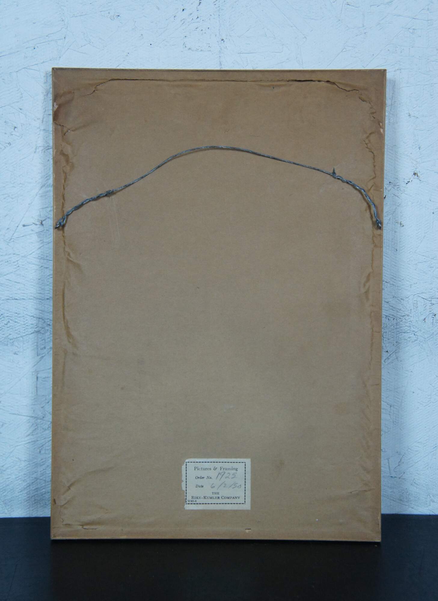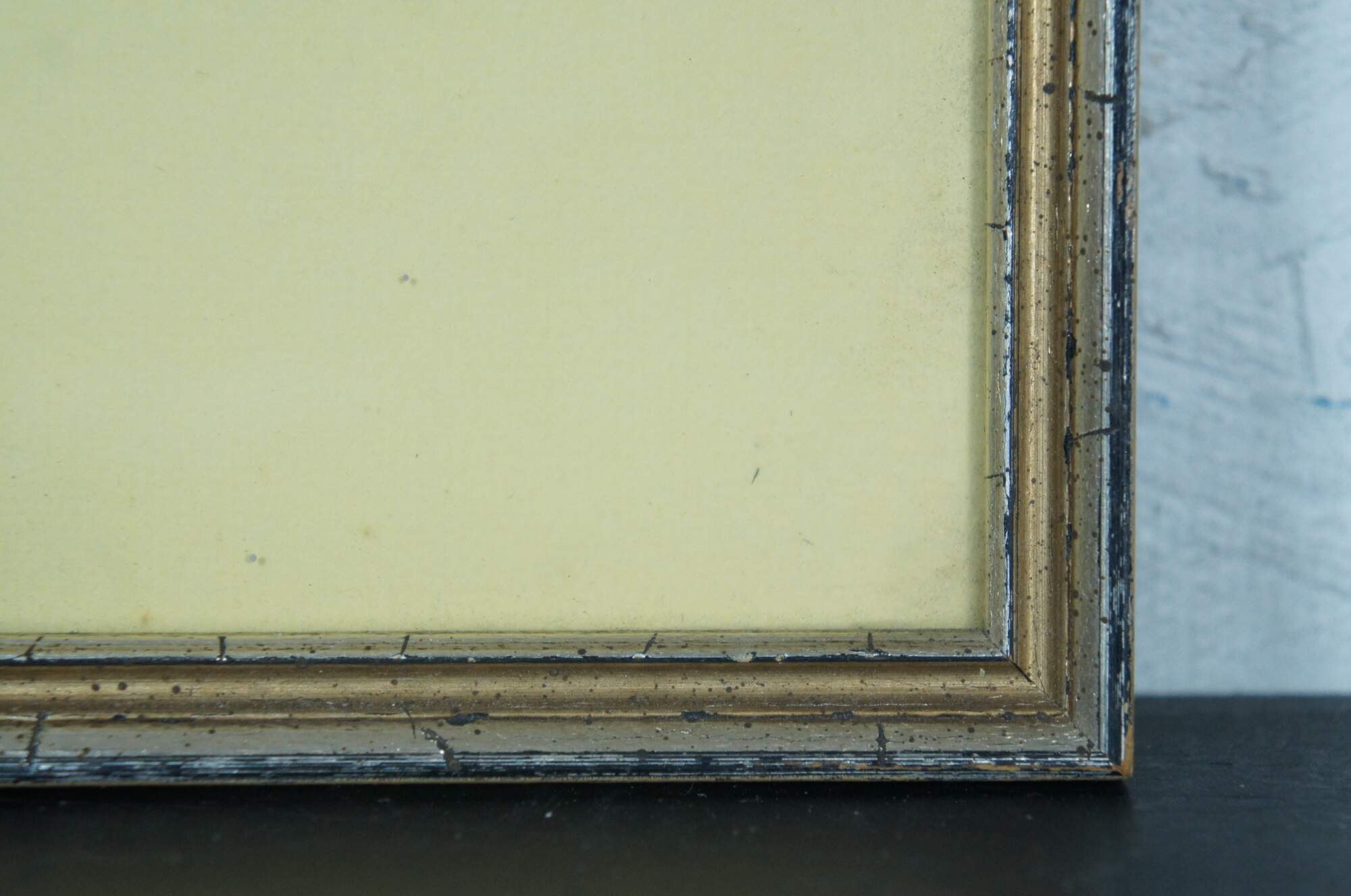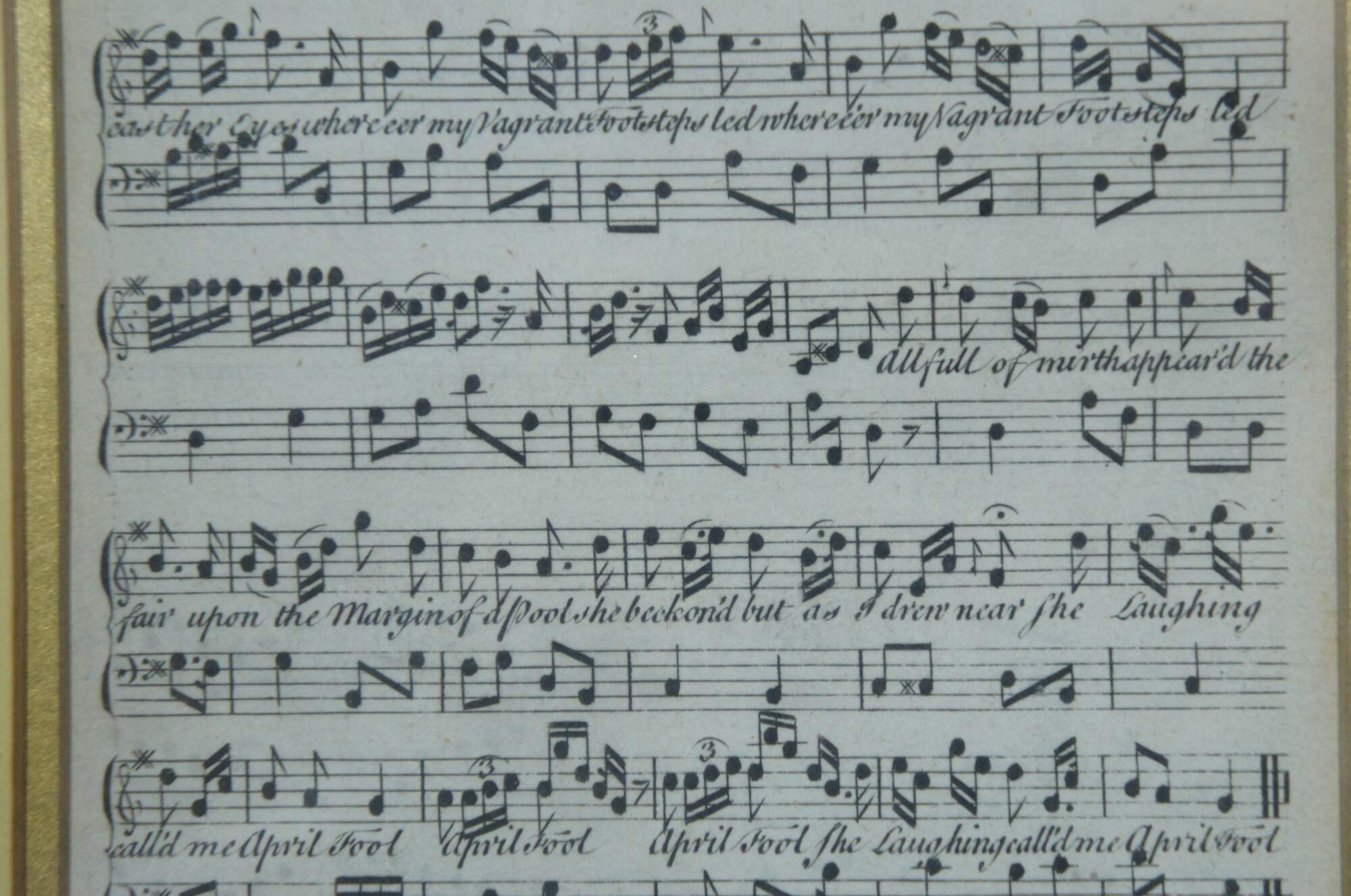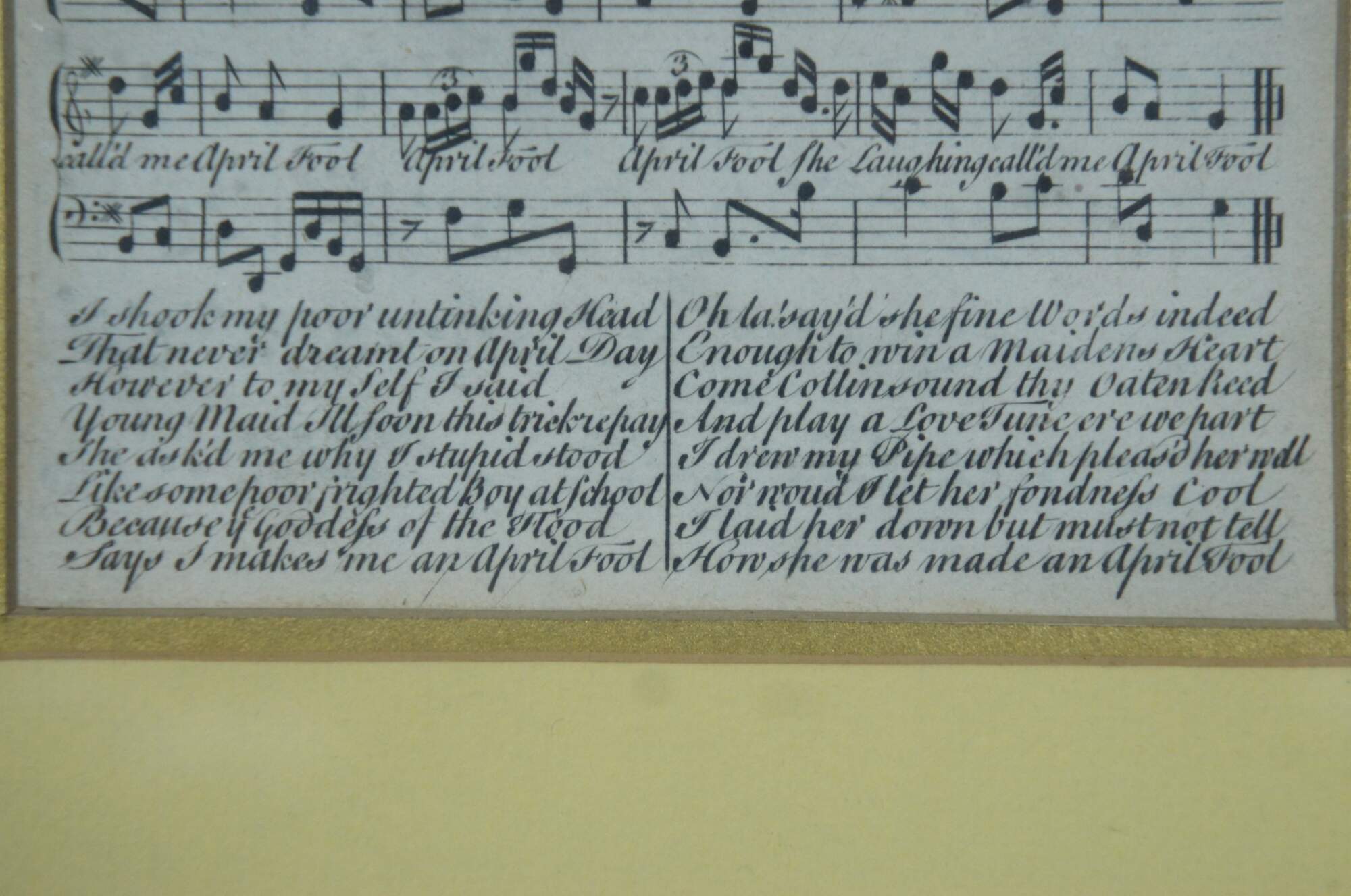 Antique circa late 18th century sheet of music for a song titled April Fool, illustrated at the top with a colored engraving of a gentleman and lady in front of a house / outbuildings. Framed in 1950 by the Rike-Kumler Company. Beveled champagne gilt frame; yellow mat.