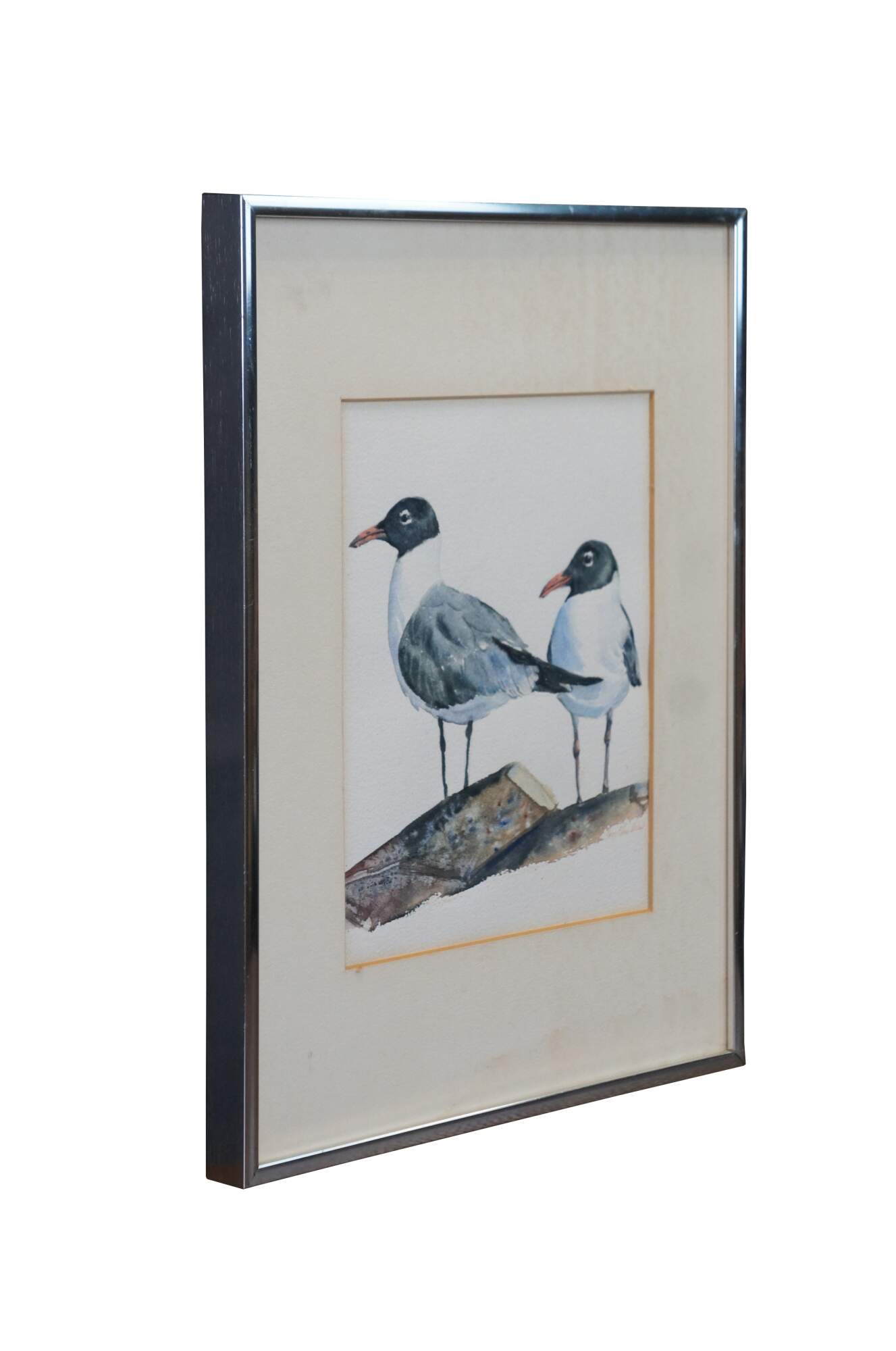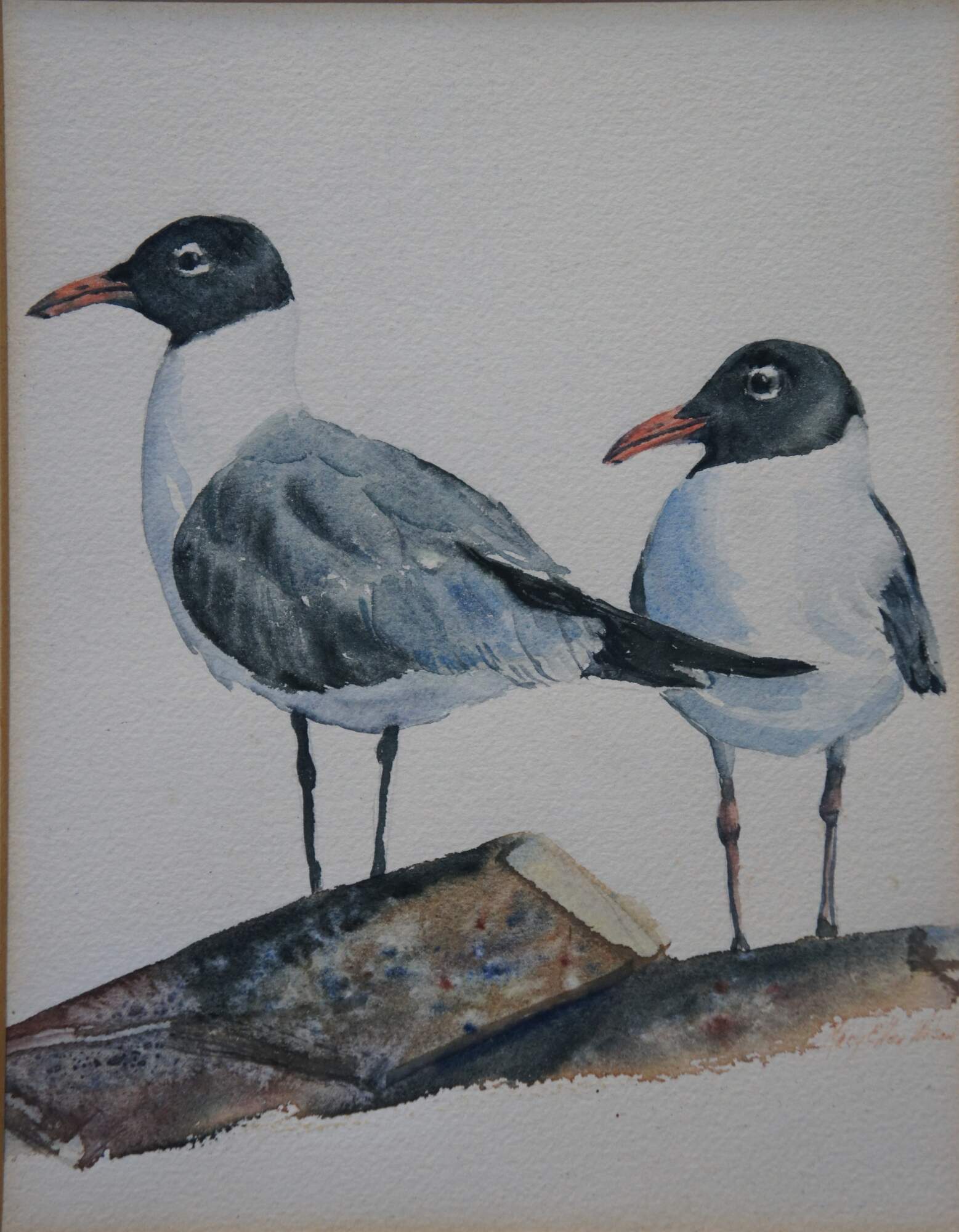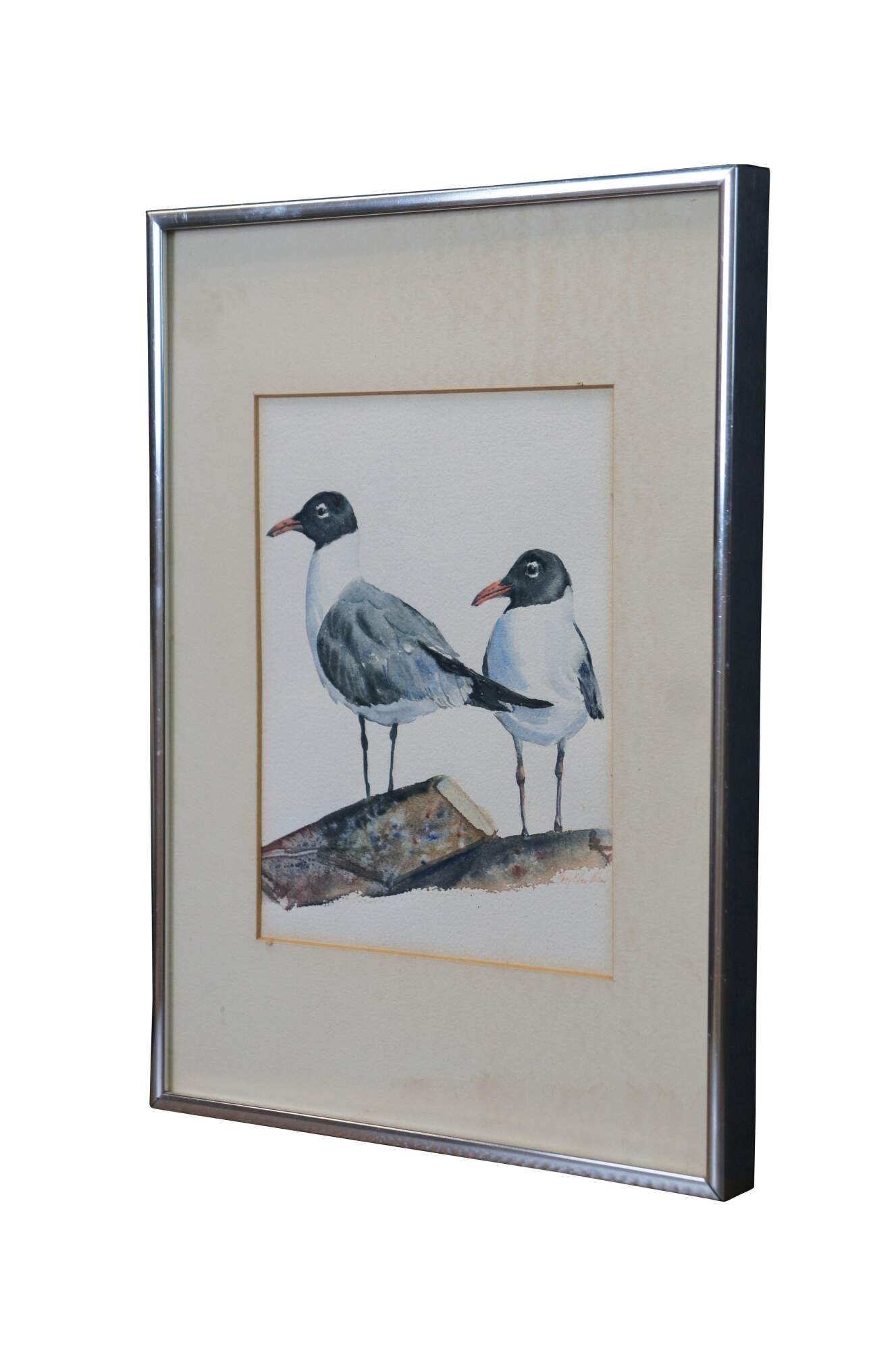 Mid to late 20th century watercolor on paper painting by Dayton artist Mary Ellen Wilson depicting a pair of Laughing Gulls standing on rocks. Signed in lower right. Silver tone metal frame, white mat.
