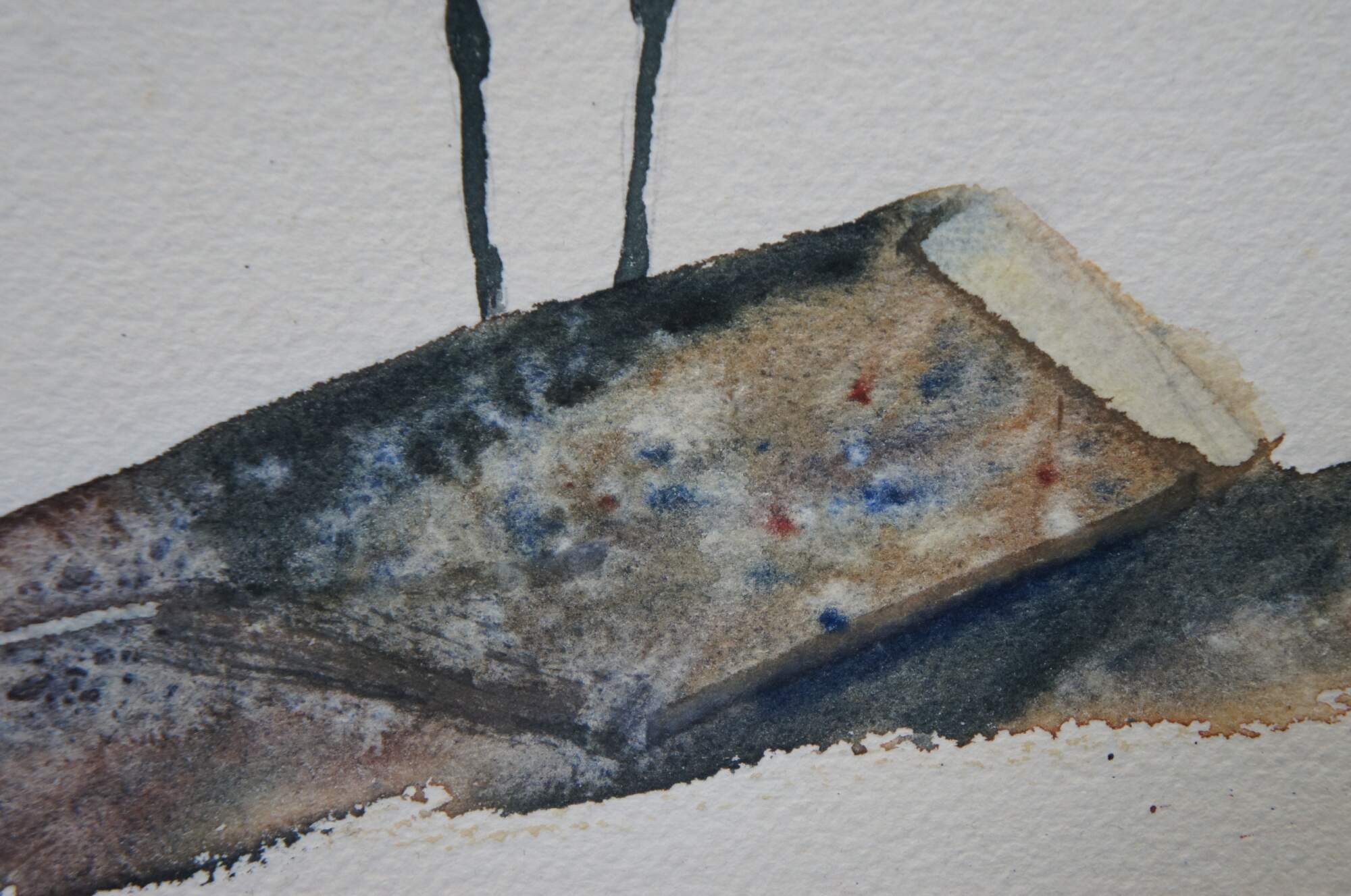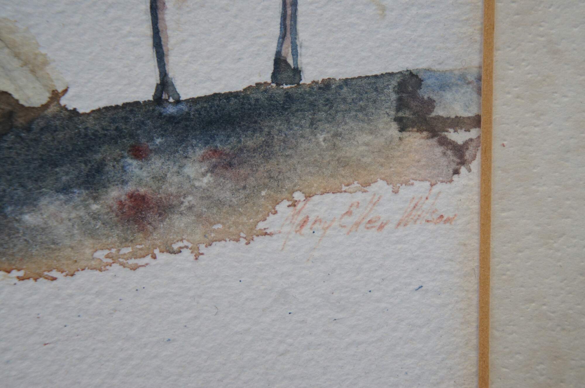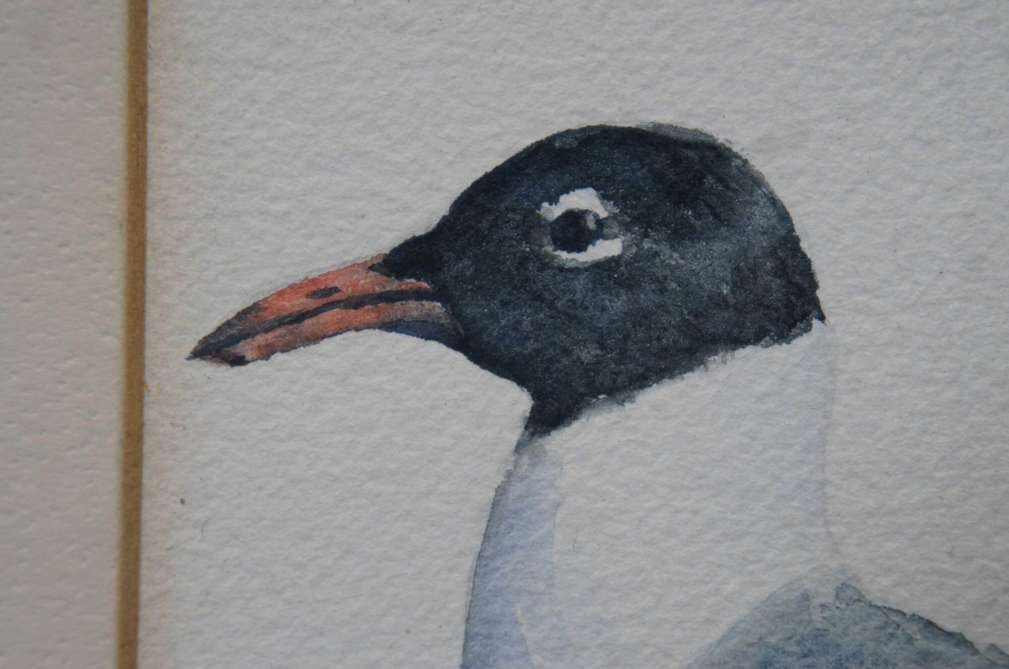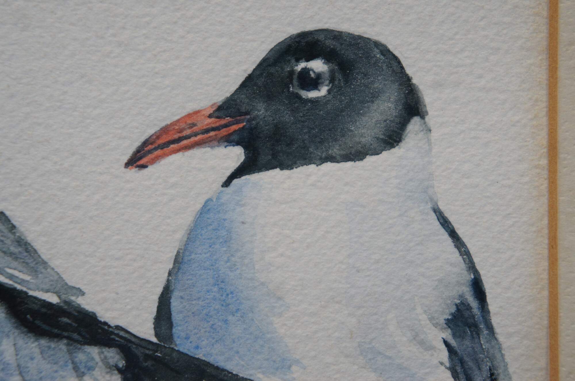 Mid to late 20th century watercolor on paper painting by Dayton artist Mary Ellen Wilson depicting a pair of Laughing Gulls standing on rocks. Signed in lower right. Silver tone metal frame, white mat.