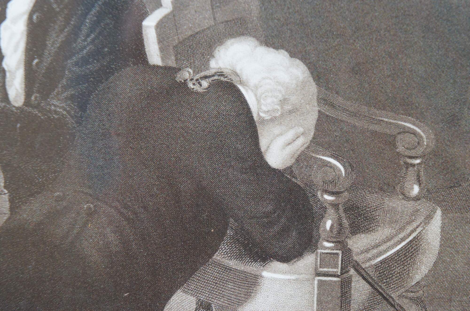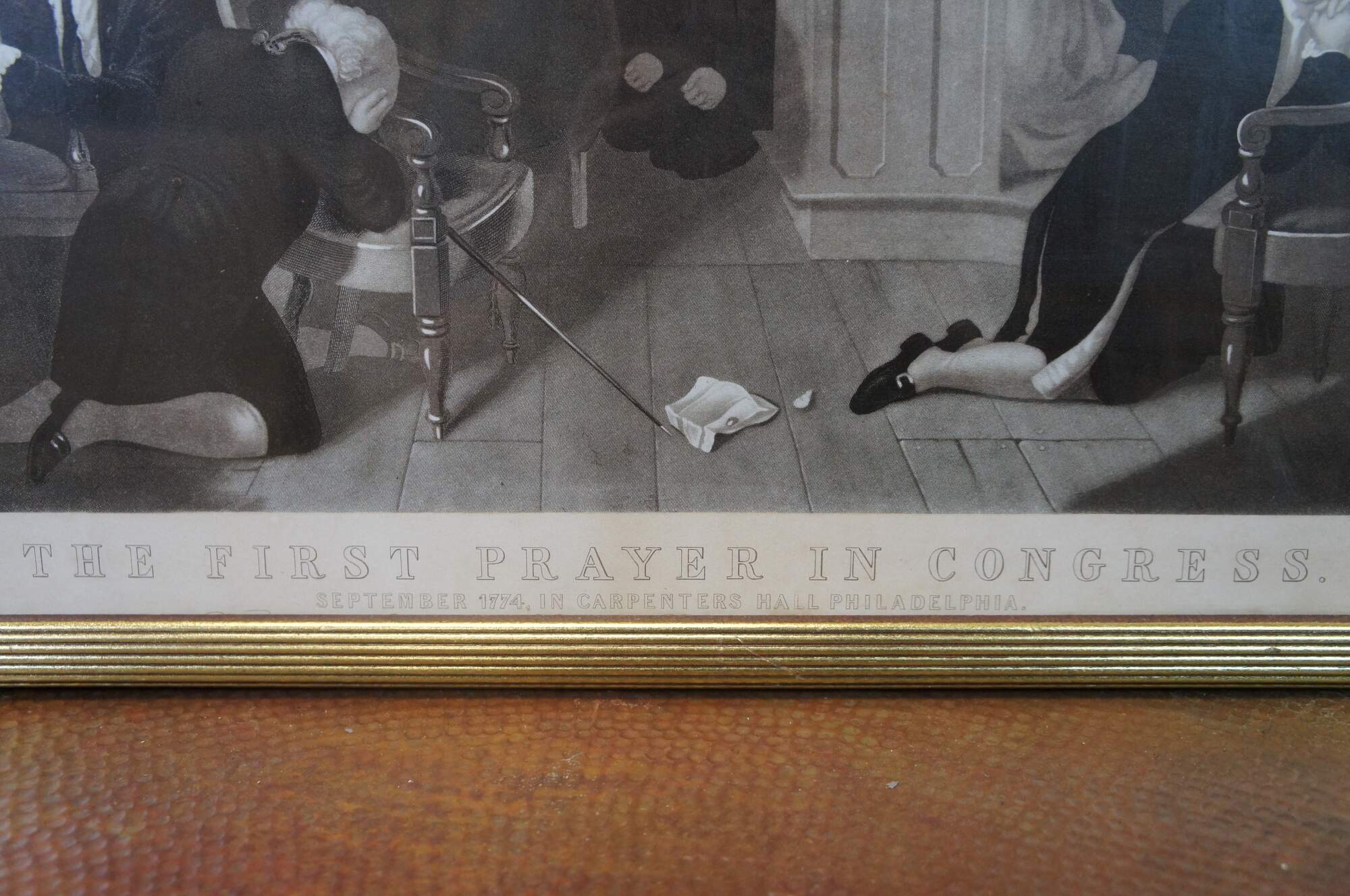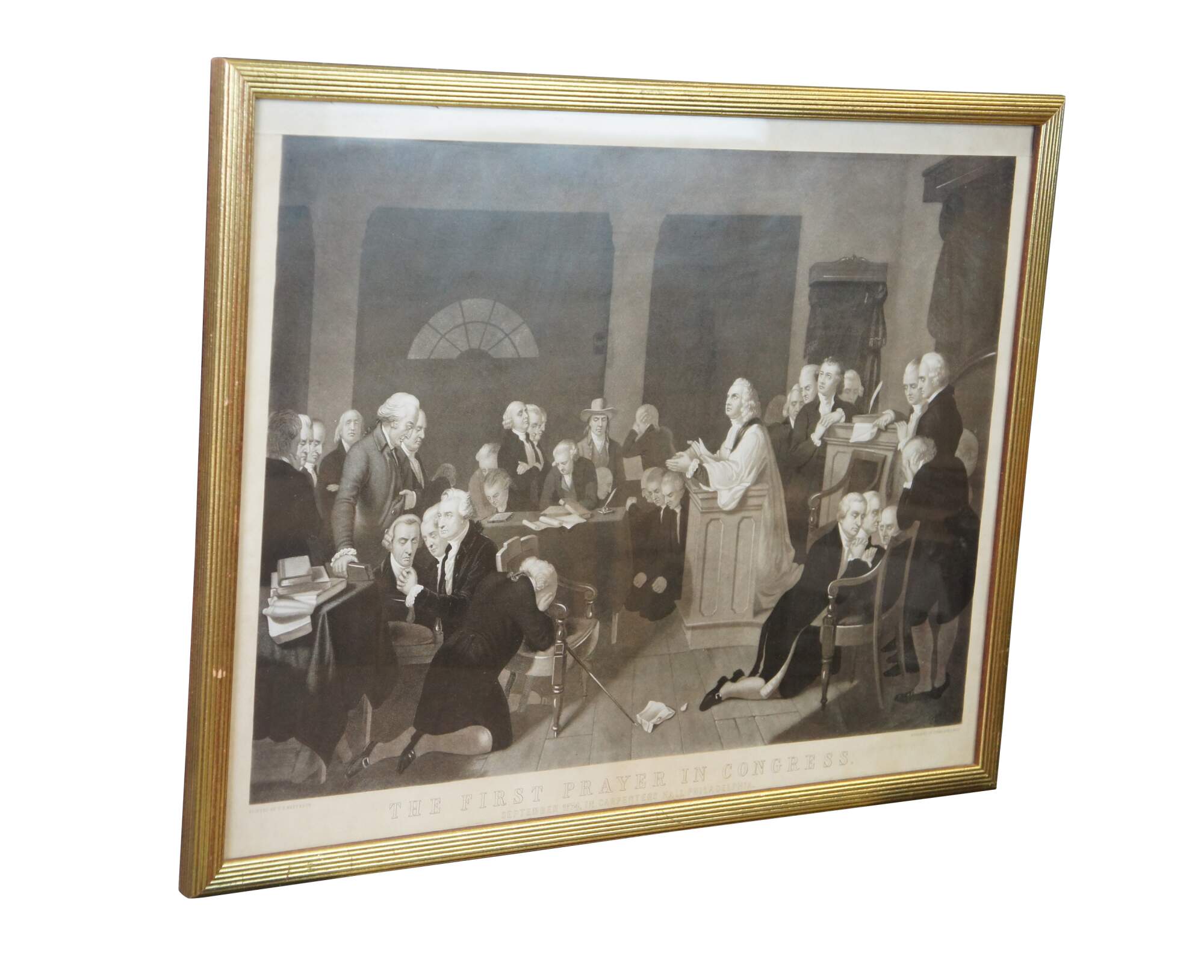 The First Prayer in Congress - September 1774, in Carpenters Hall Philadelphia." A reproduction of an 1850's etching, originally painted by Thompkins Harrison Matteson and engraved on steel by Henry Samuel Sadd. Grooved giltwood frame; no mat.