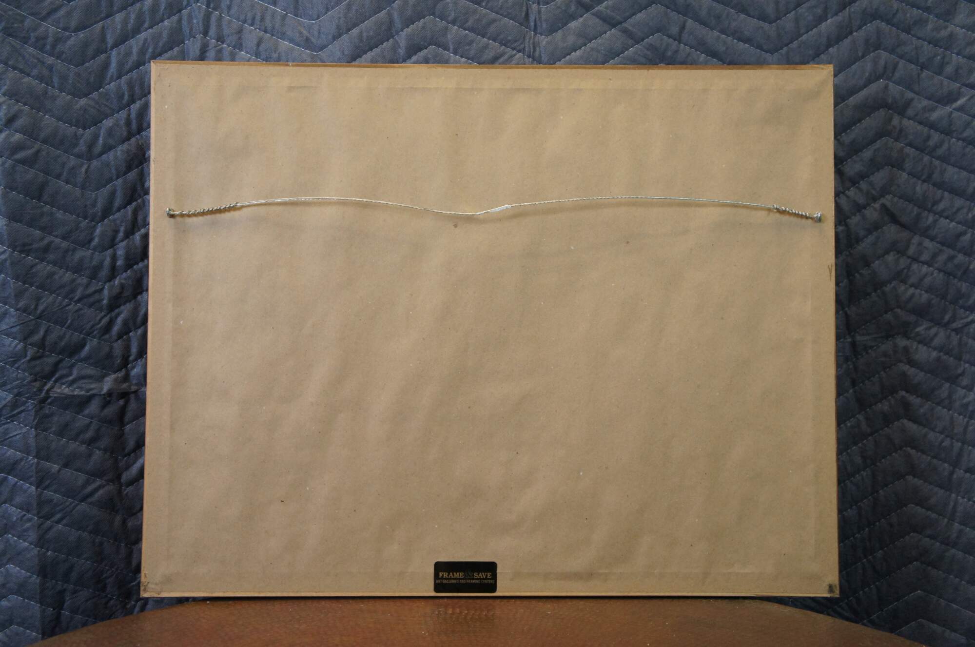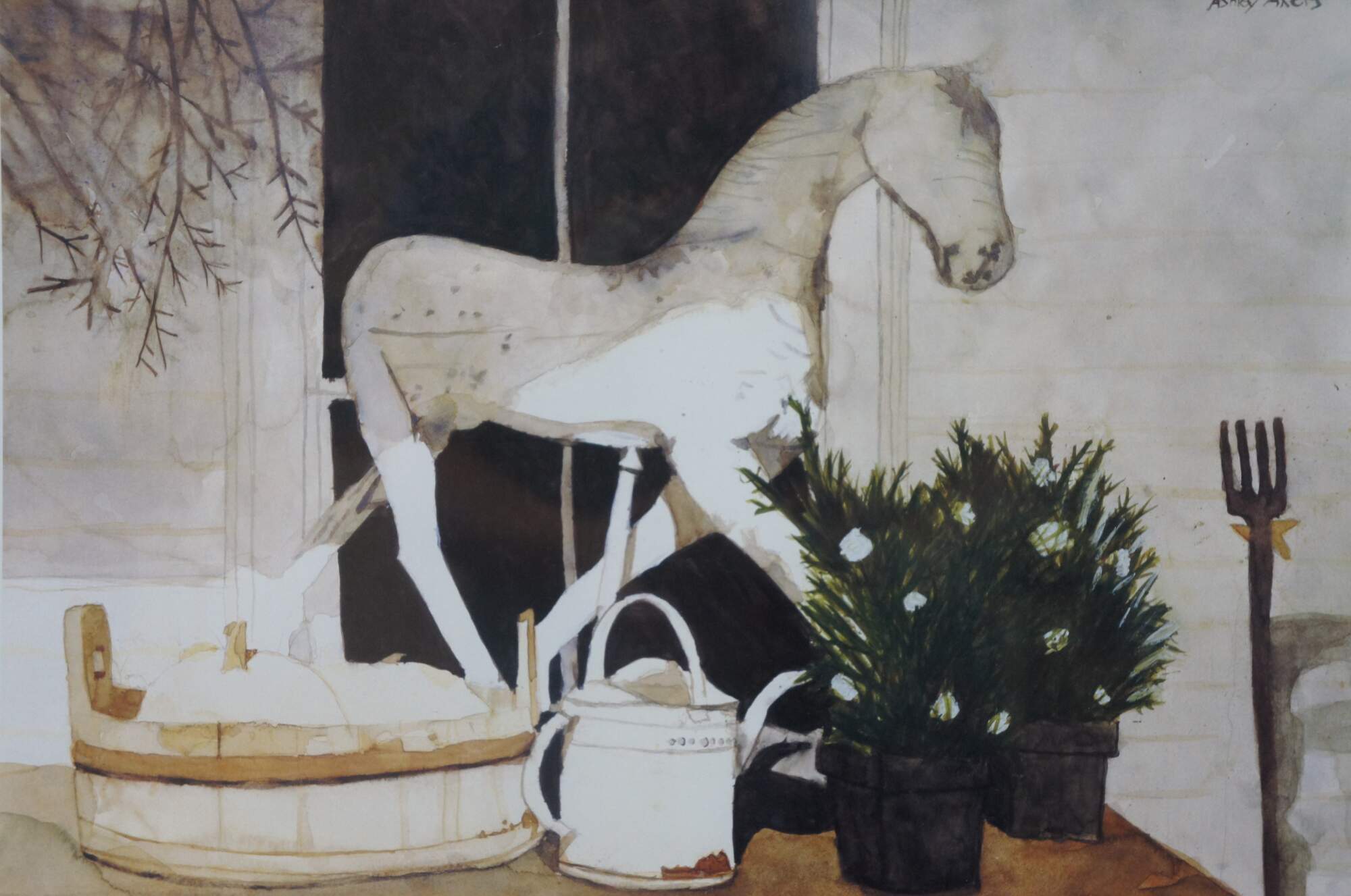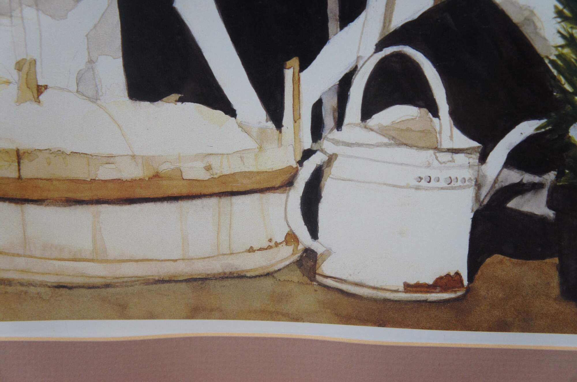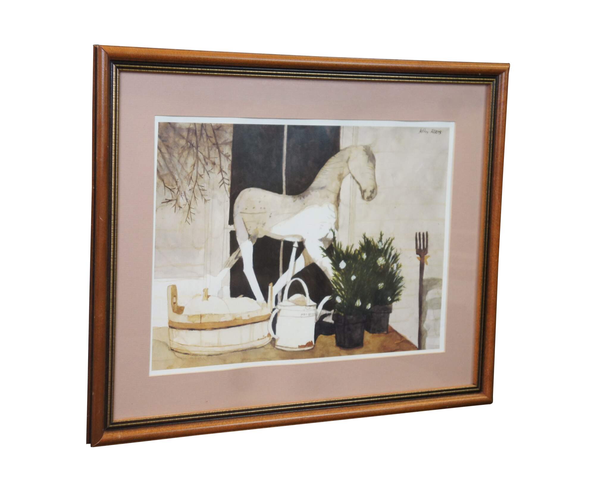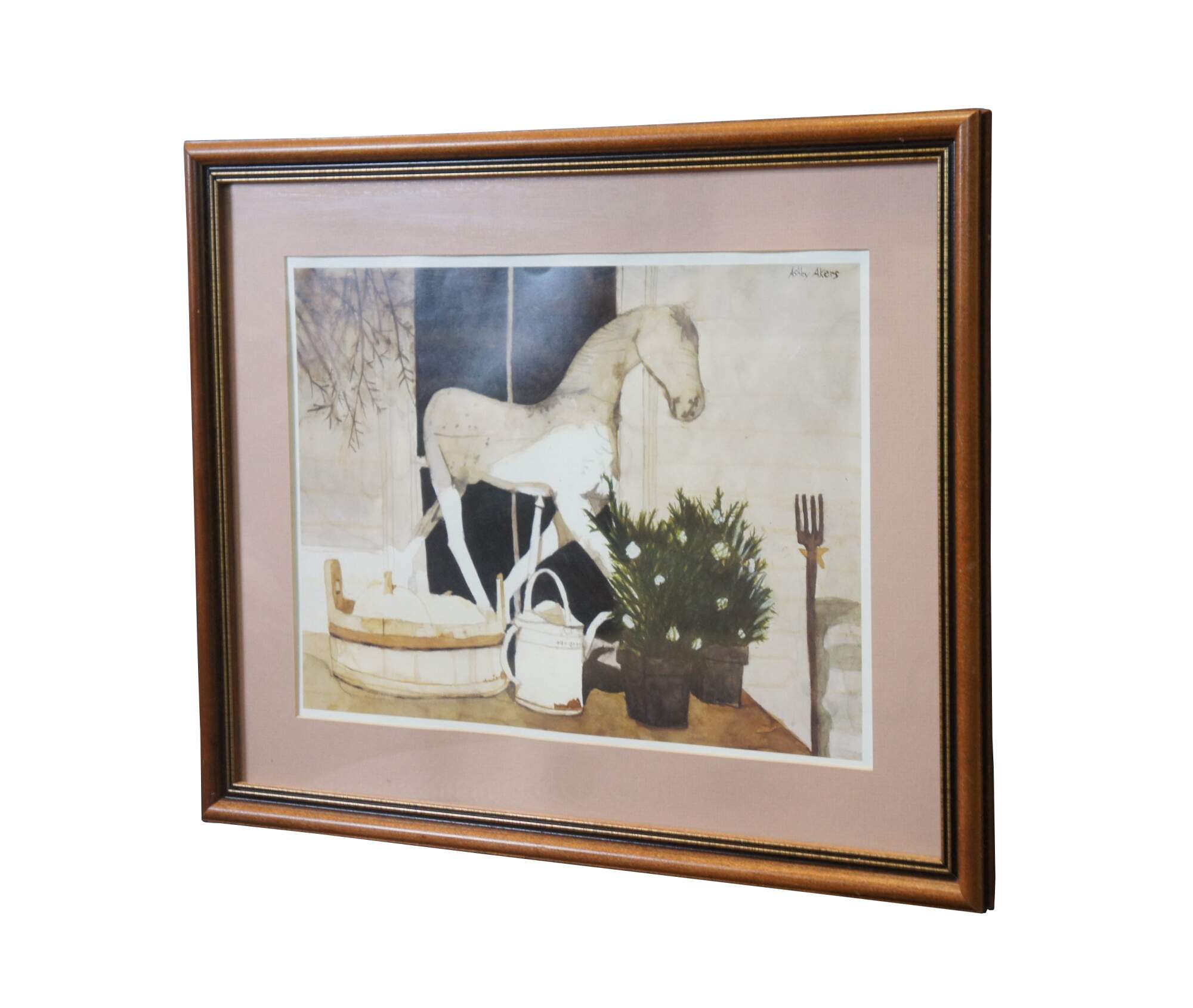 Late 20th century lithograph print of the still life "Natural Charms" by Ashley Akers. Depicts an array of rustic objects including a toy equestrian horse, potted plants, a watering can, and wooden basin on a table by a window. Rounded wood frame with black painted bevel; light pink mat.