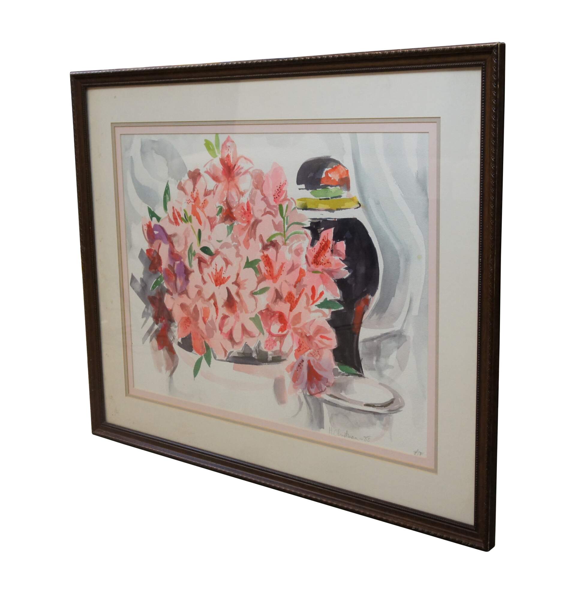 Vintage 1988 watercolor on paper still life painting by H. Christman. Depicts a bouquet of pink alstroemerias in a white vase with a red and black ginger jar in the background. Signed at lower right. Carved and beveled wood frame; off white, beige, and pink layered mat.