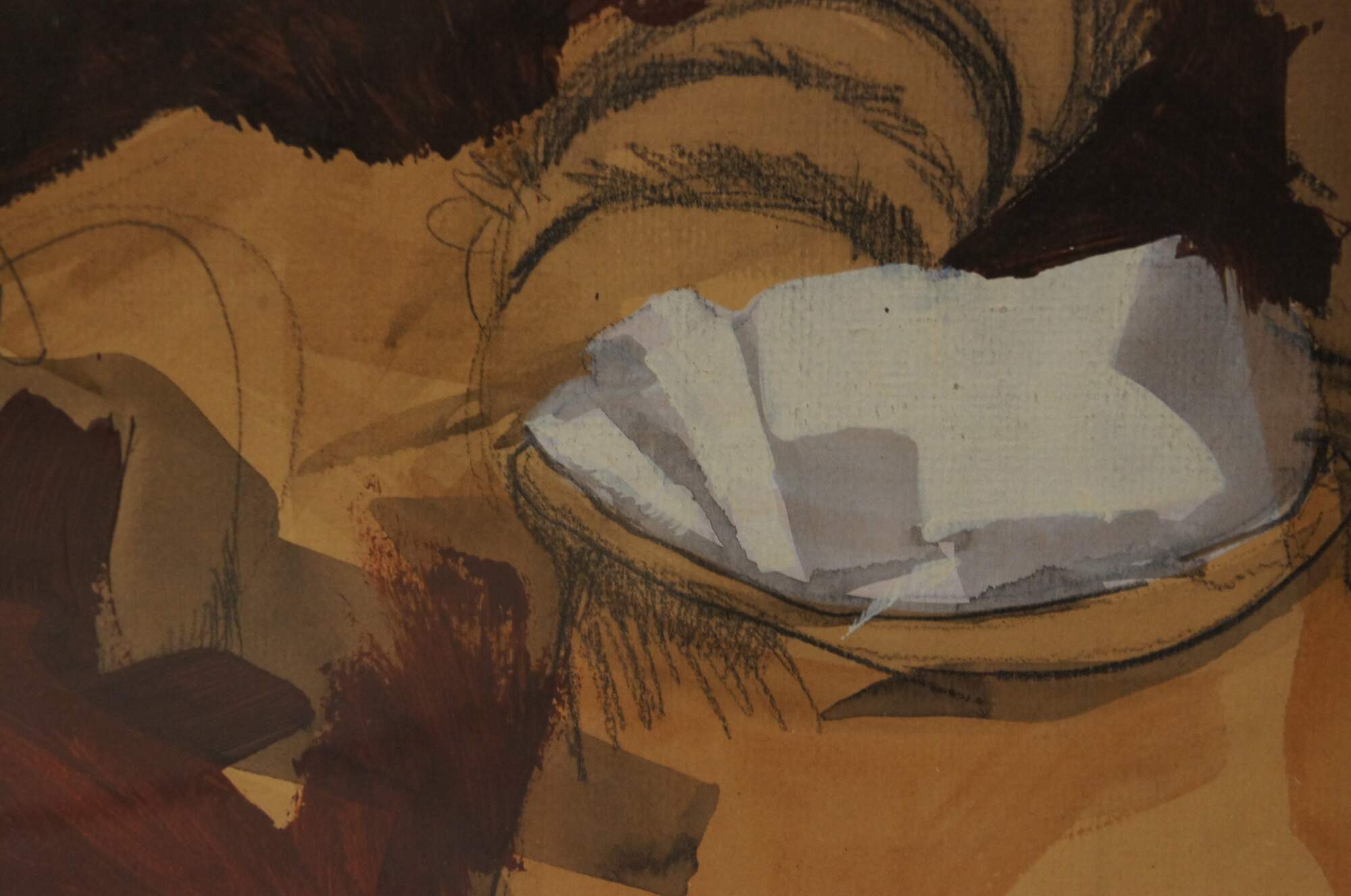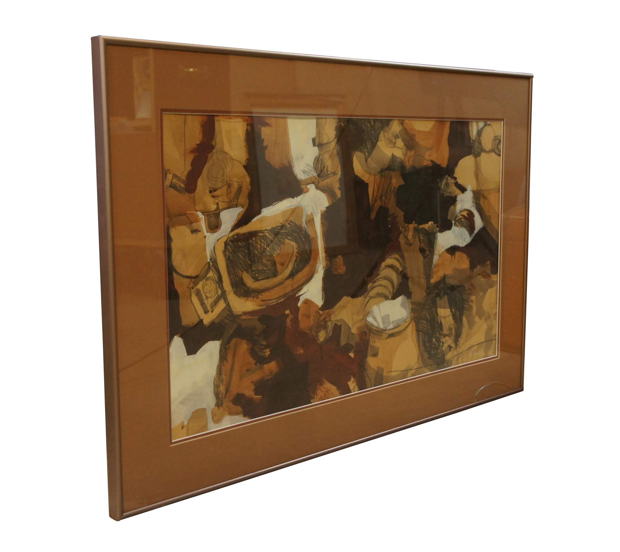 Mid to late 20th century abstract artwork depicting a jumble of semi-recognizable objects and figures, sketched in pencil with painted sections, all in shades of brown and rust-orange. Bronze tone metal frame; brown and rust layered mat.