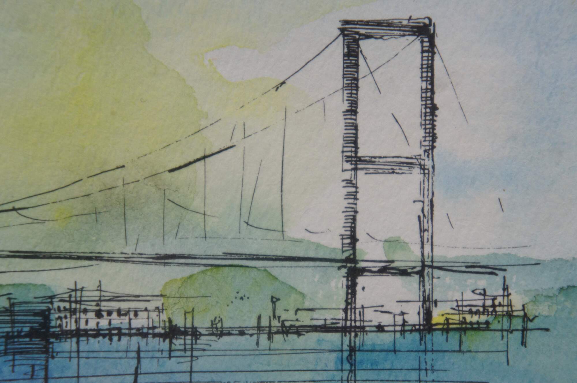Vintage Isil Ozisik 1976 watercolor on paper painting depicting a view of the Bosphorus Bridge and Ortakoy Mosque in Istanbul, Türkiye, by Isil Ozisik. Rounded gilt wood frame; white and blue layered mat.