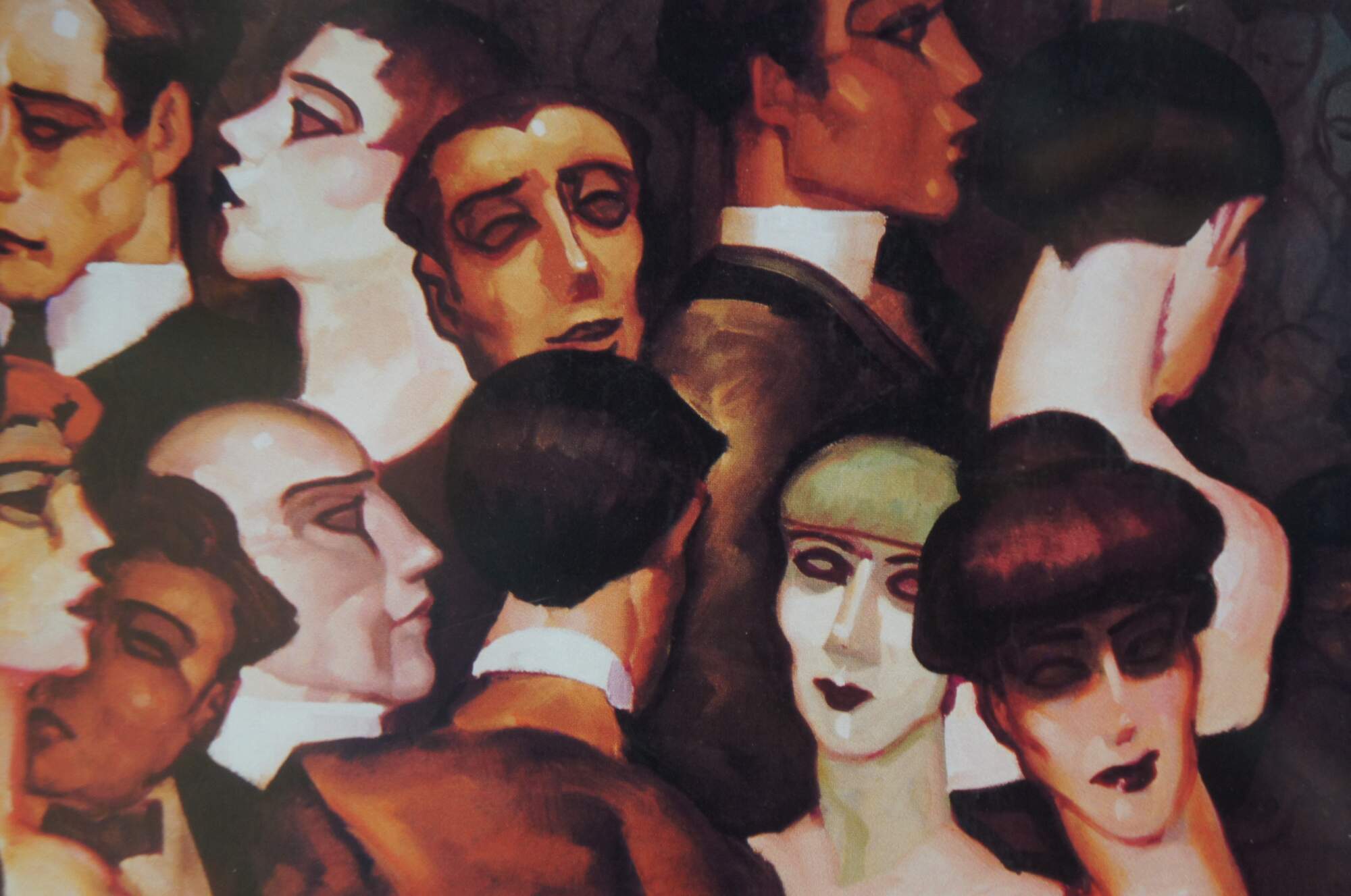 Late 20th century print of "The Gallery" by Jaurez Marchado. Depicts a crowd of party goers being served champagne by a butler. Rust clored velvet and black layered mat. Sealed.