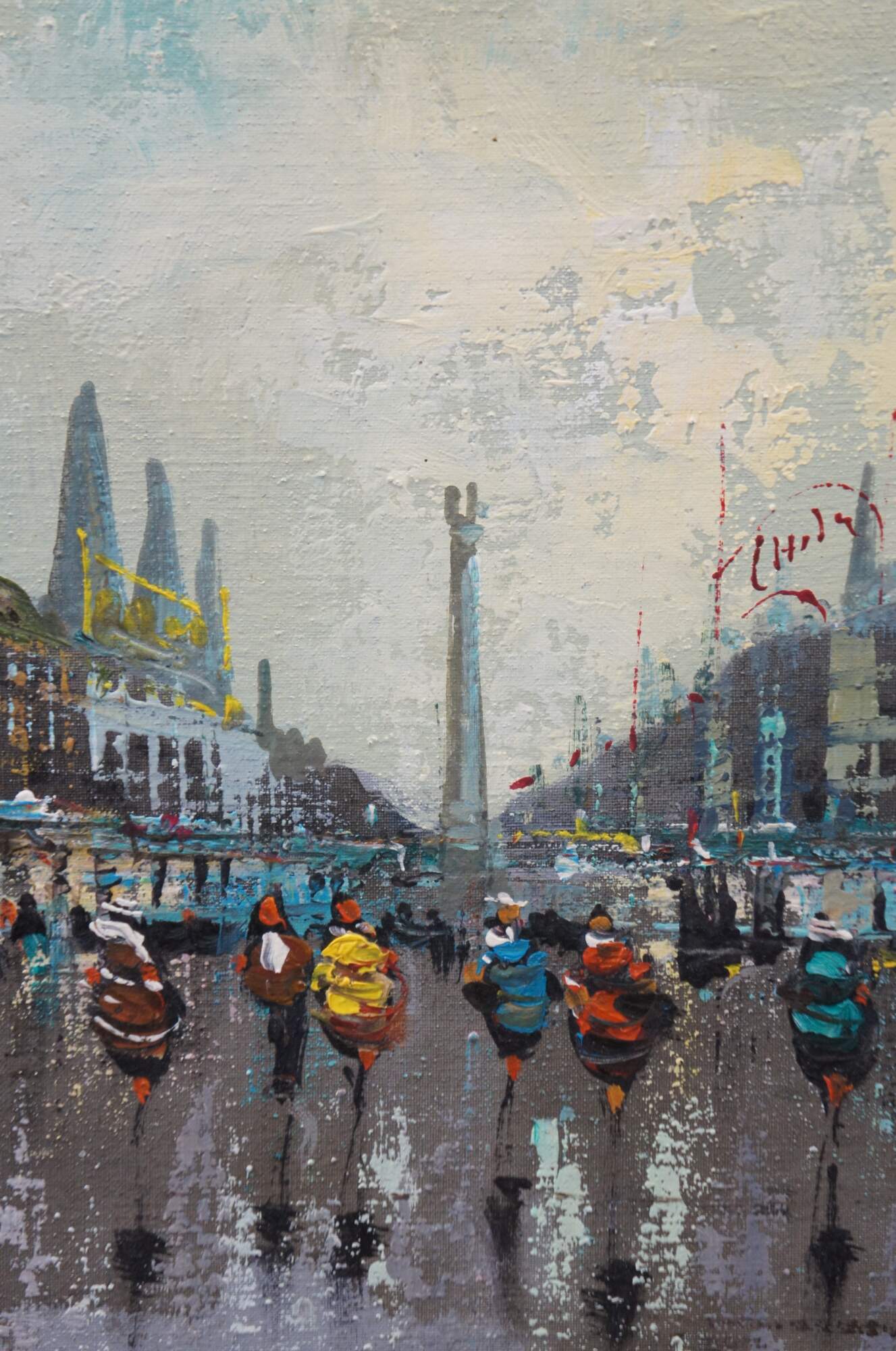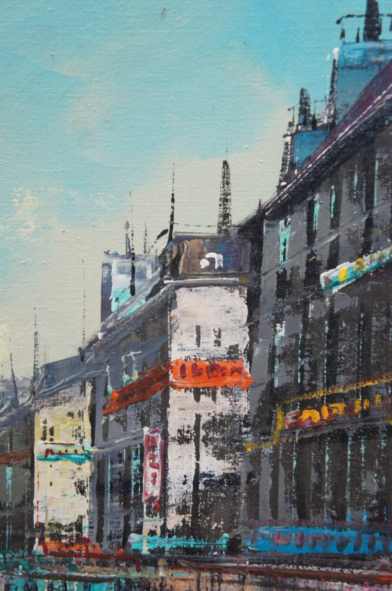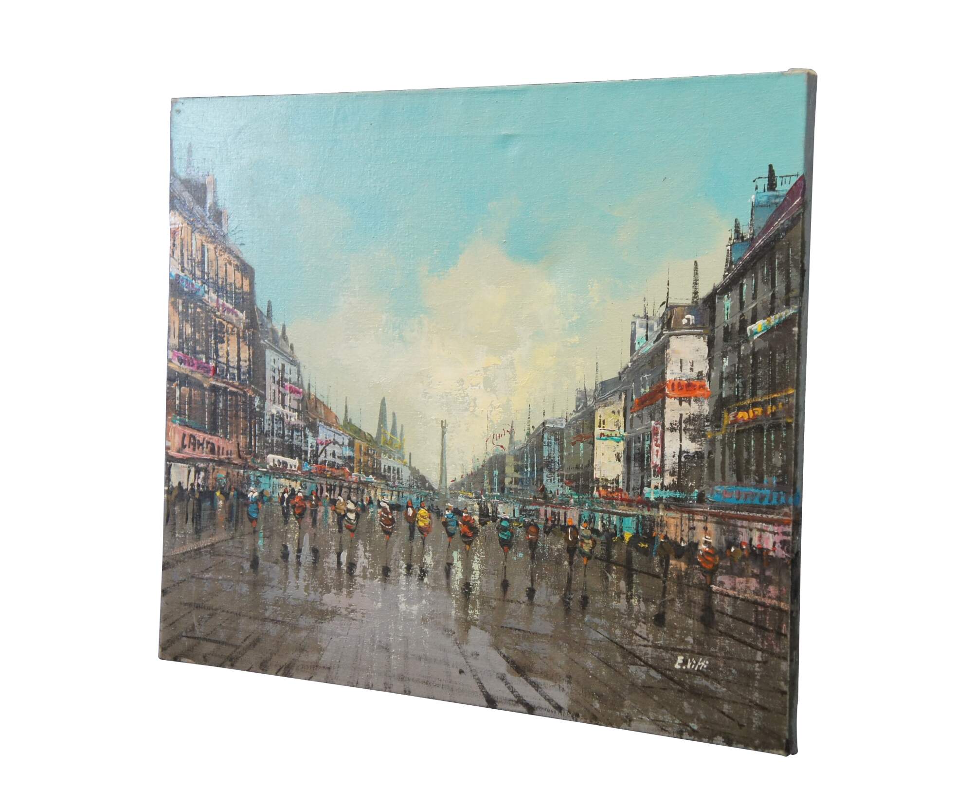 Mid to late 20th century French impressionist oil painting on canvas cityscape by E. Vitti. Depicts a broad Paris (France) boulevard filled with figures. Signed in lower right.