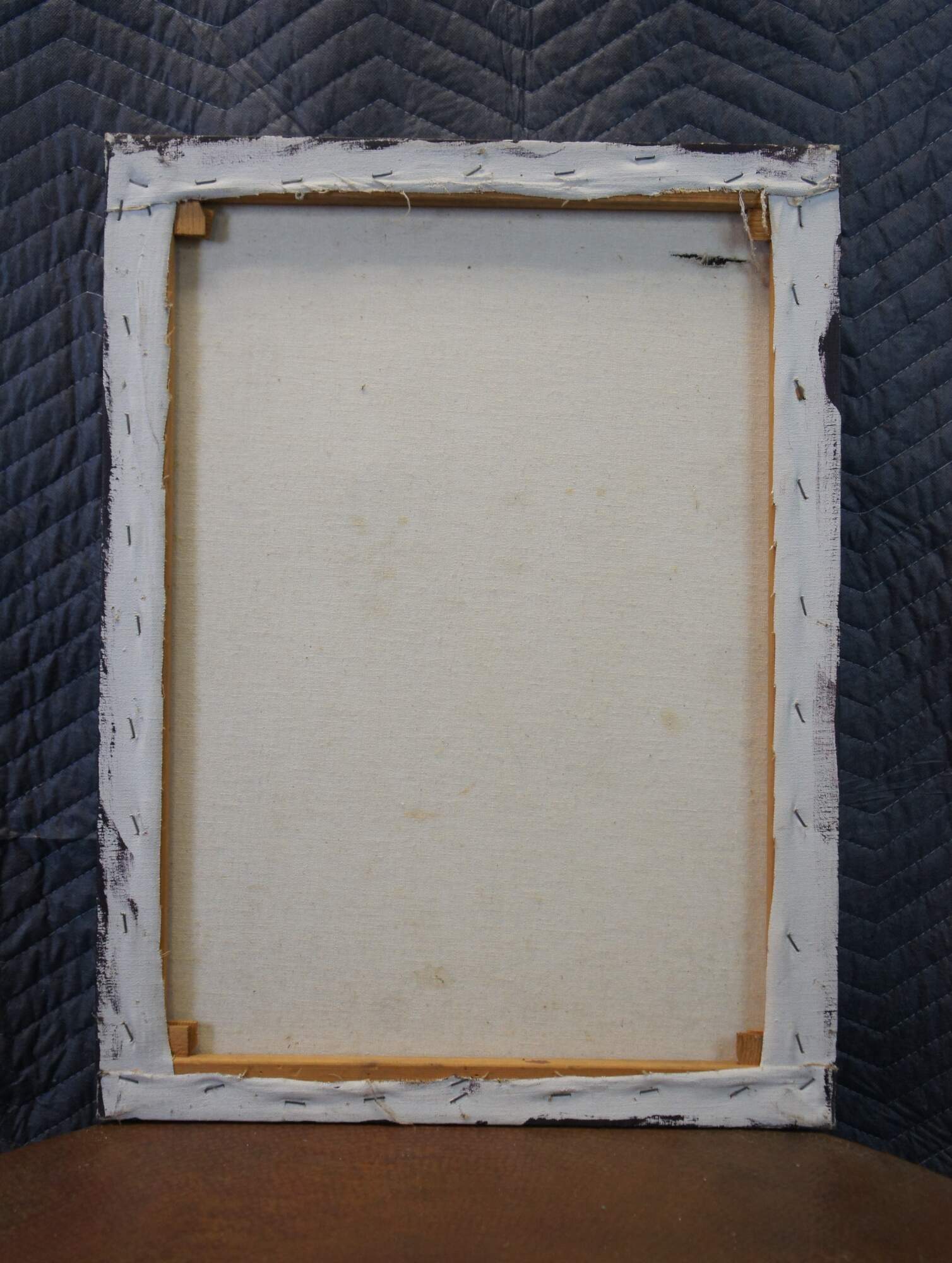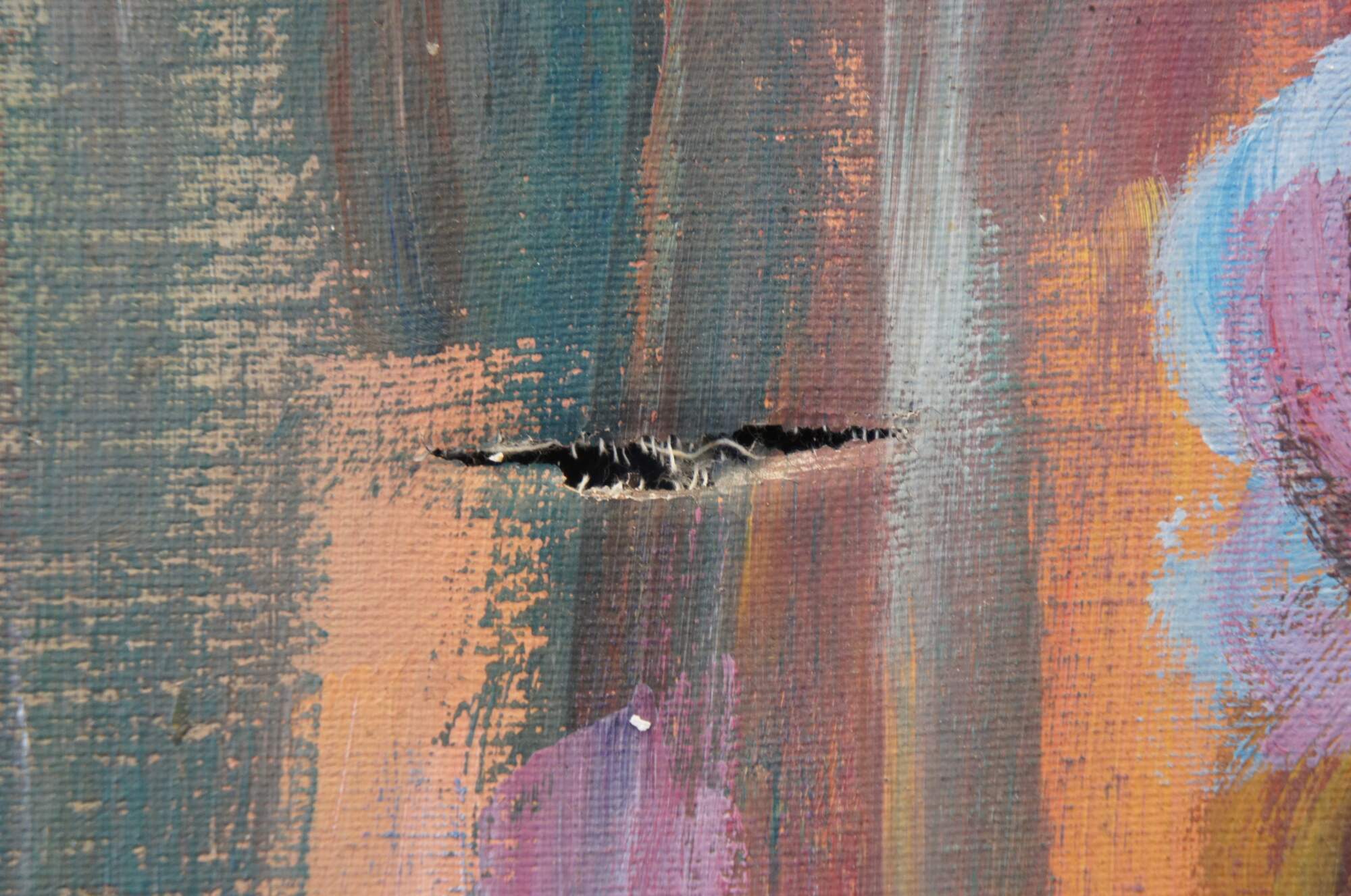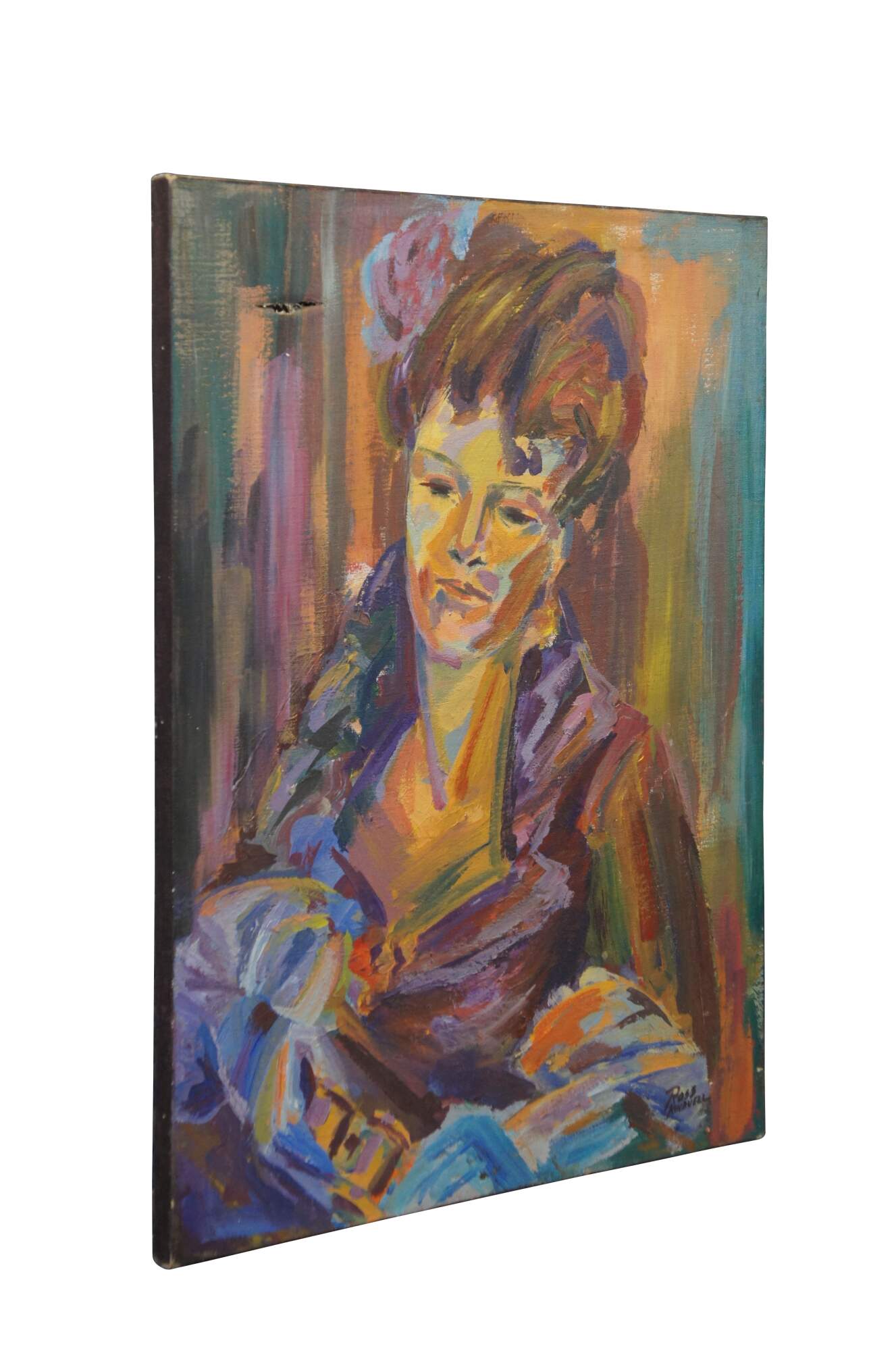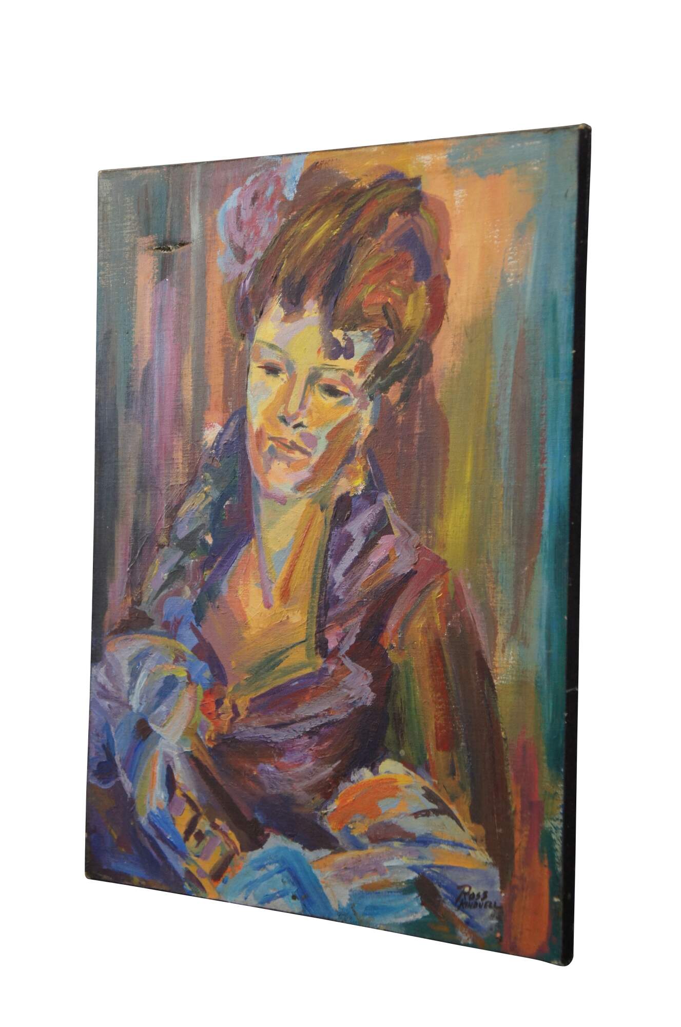 Vintage 20th century oil on canvas painting by Ross Kinduell, depicting a female figure in Victorian clothing, painting in a bold, colorful, expressionist style. Signed in lower right.