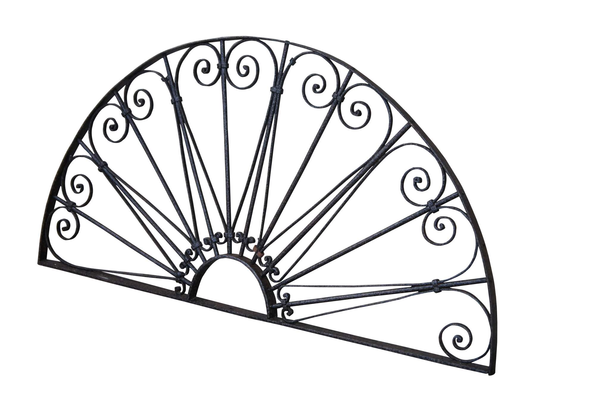 An antique architectural, demilune arched transom or grille to top a doorway or window handcrafted with wrought iron. With scroll decoration.