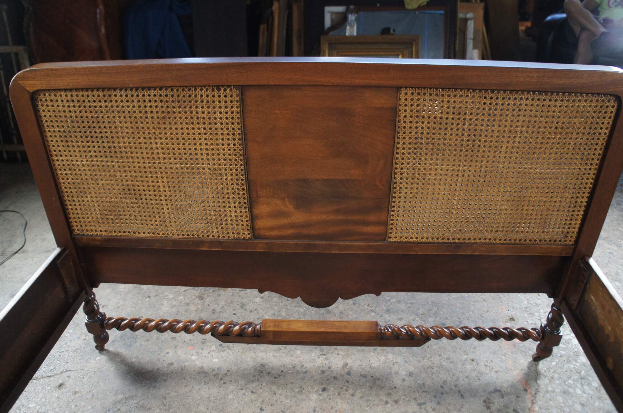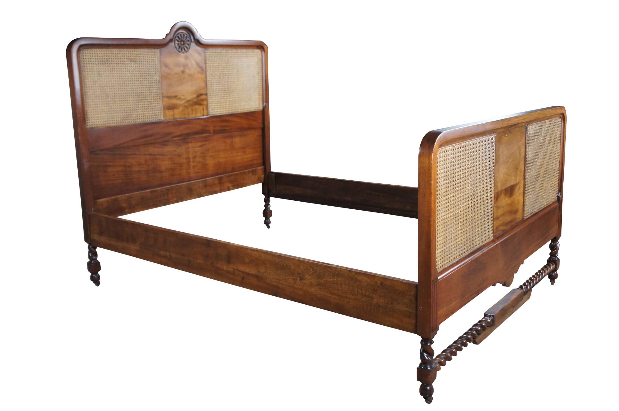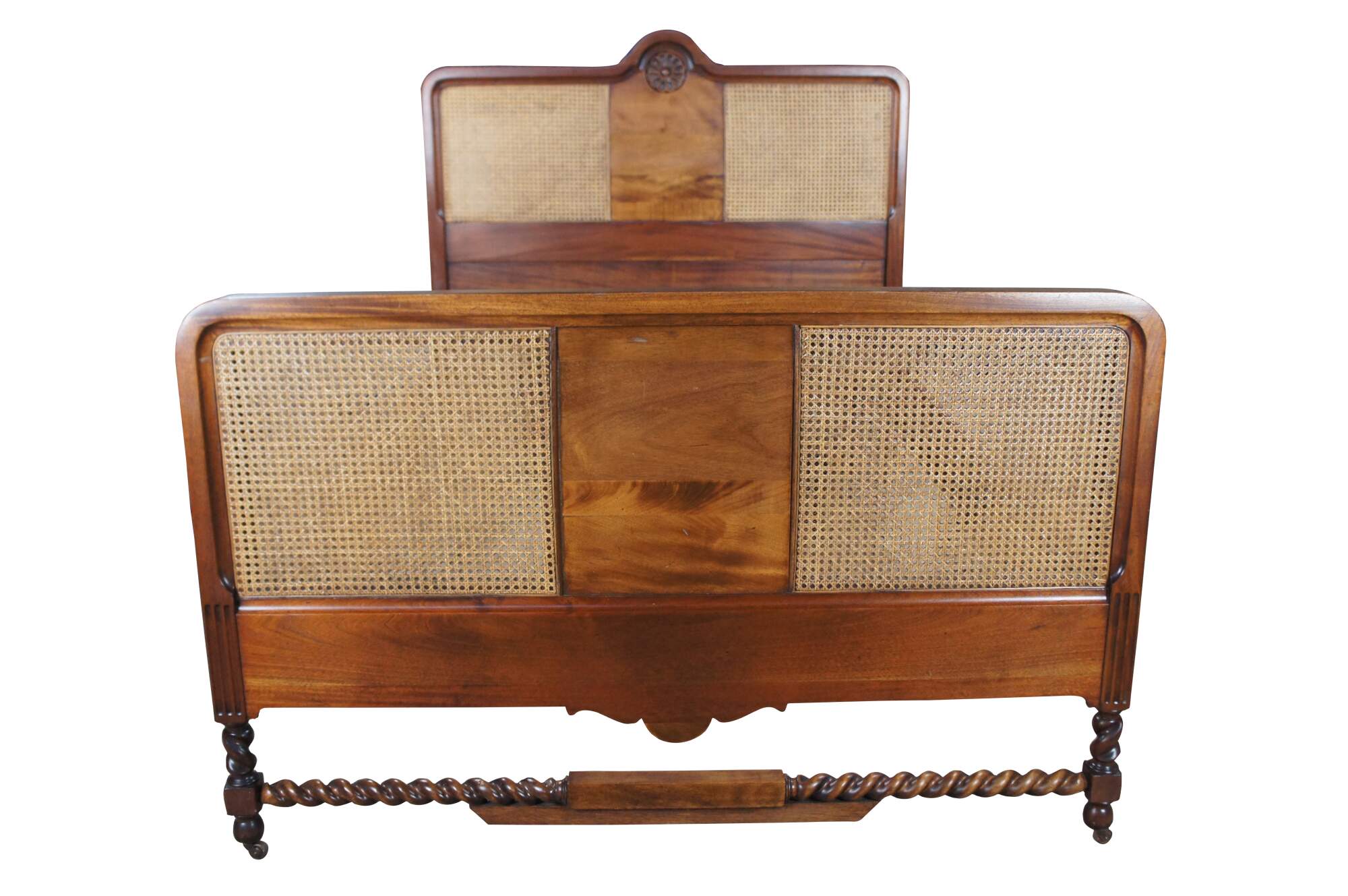 Antique French Provincial / French country / Louis XV style full size bed. Made of walnut featuring caned design with medallion crested headboard and barley twisted accents. Circa French Victorian era.