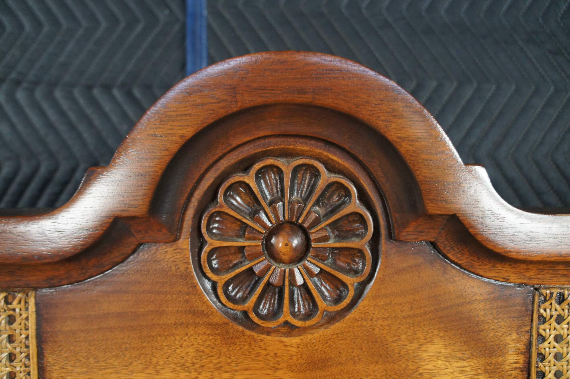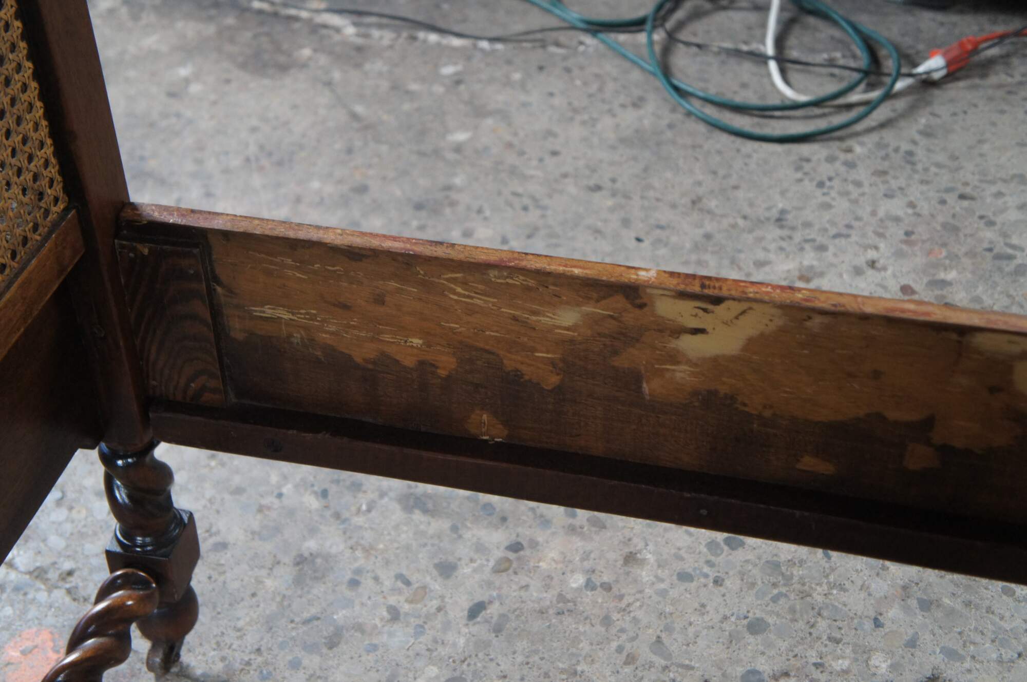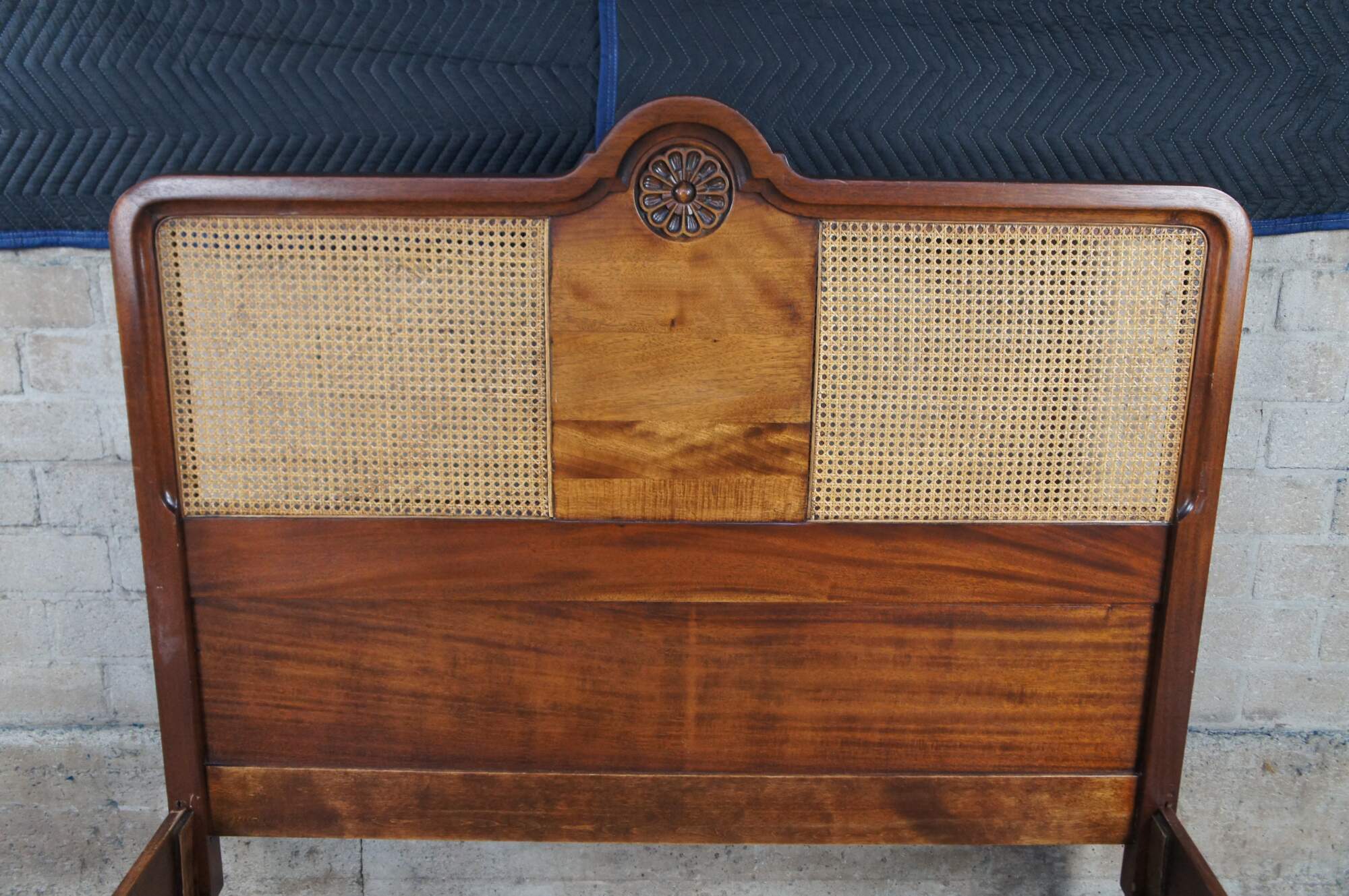 Antique French Provincial / French country / Louis XV style full size bed. Made of walnut featuring caned design with medallion crested headboard and barley twisted accents. Circa French Victorian era.