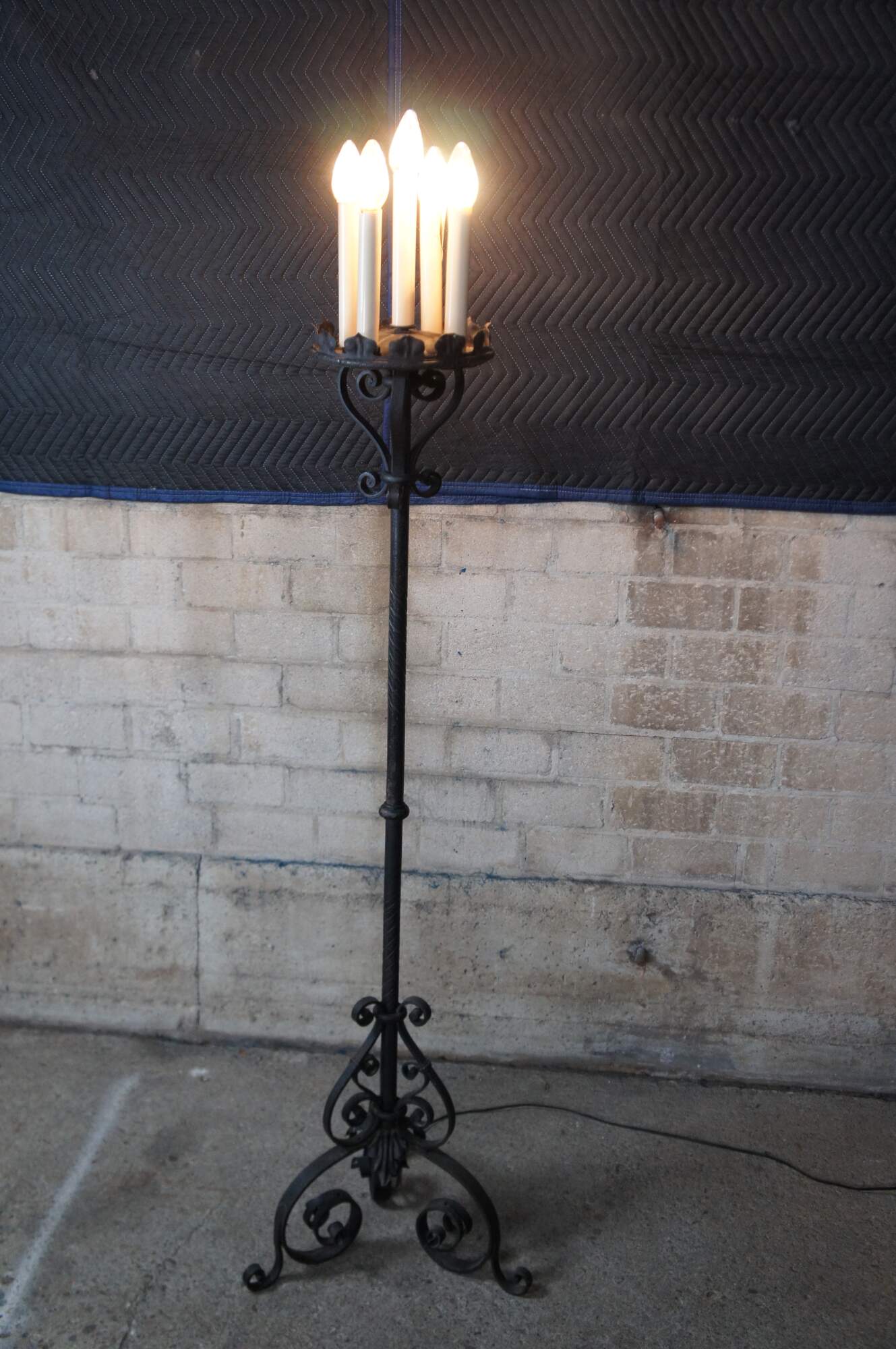 Very large and impressive early 20th century wrought / forged iron floor lamp featuring Gothic / Spanish styling with scrolled accents and five light torchiere candlestick candelabra.
