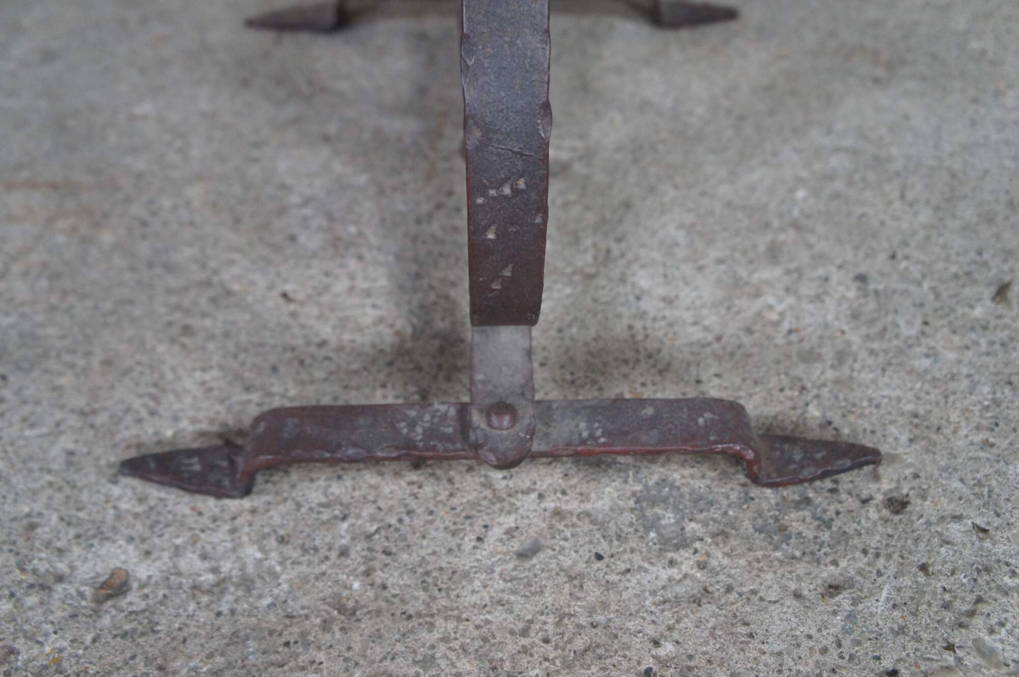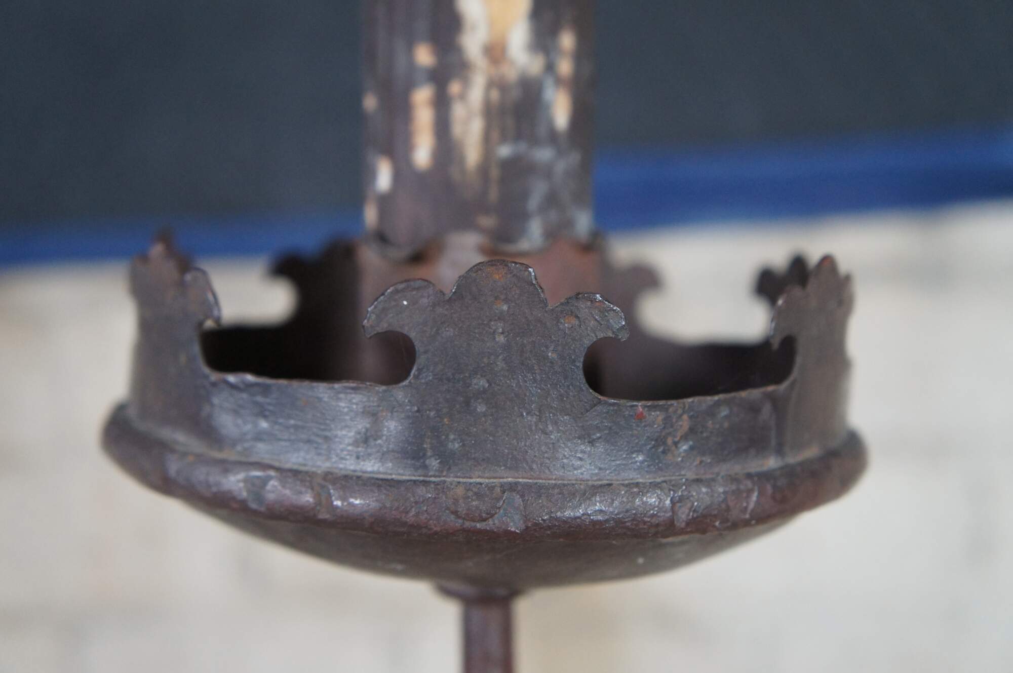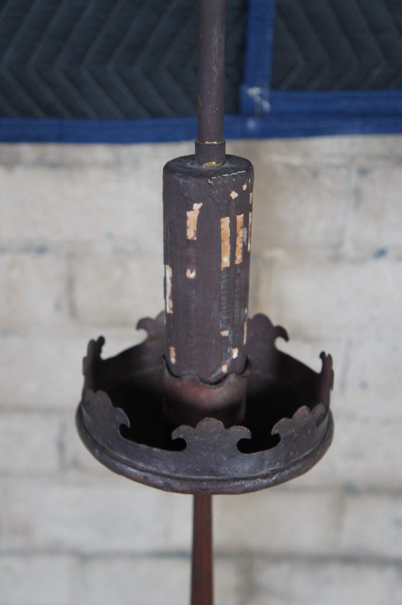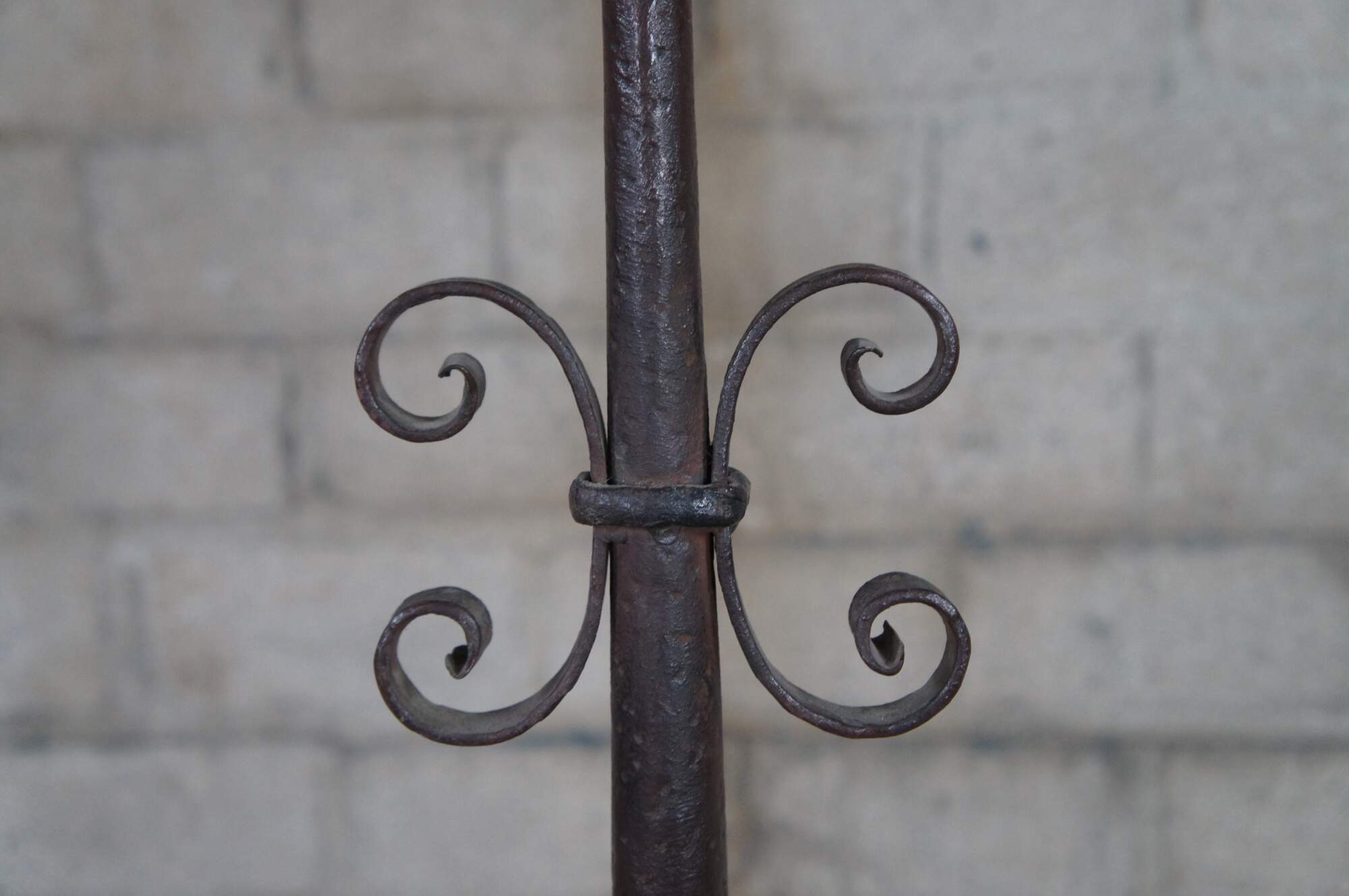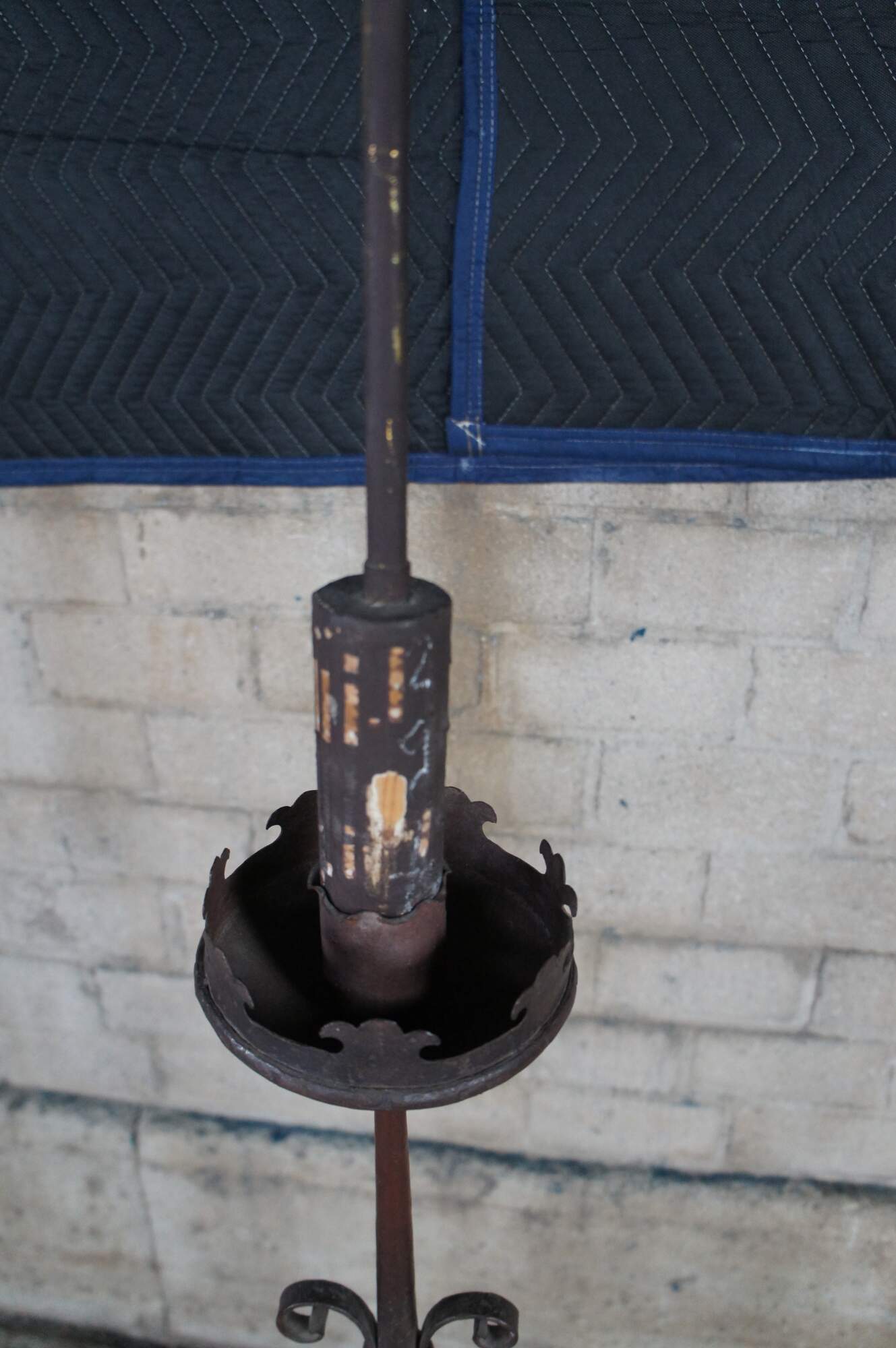 Large antique wrought / forged iron converted torchiere candle stand / candle holder floor lamp featuring Gothic / Spanish styling with scrolled accents, fleur de lis and two lights.