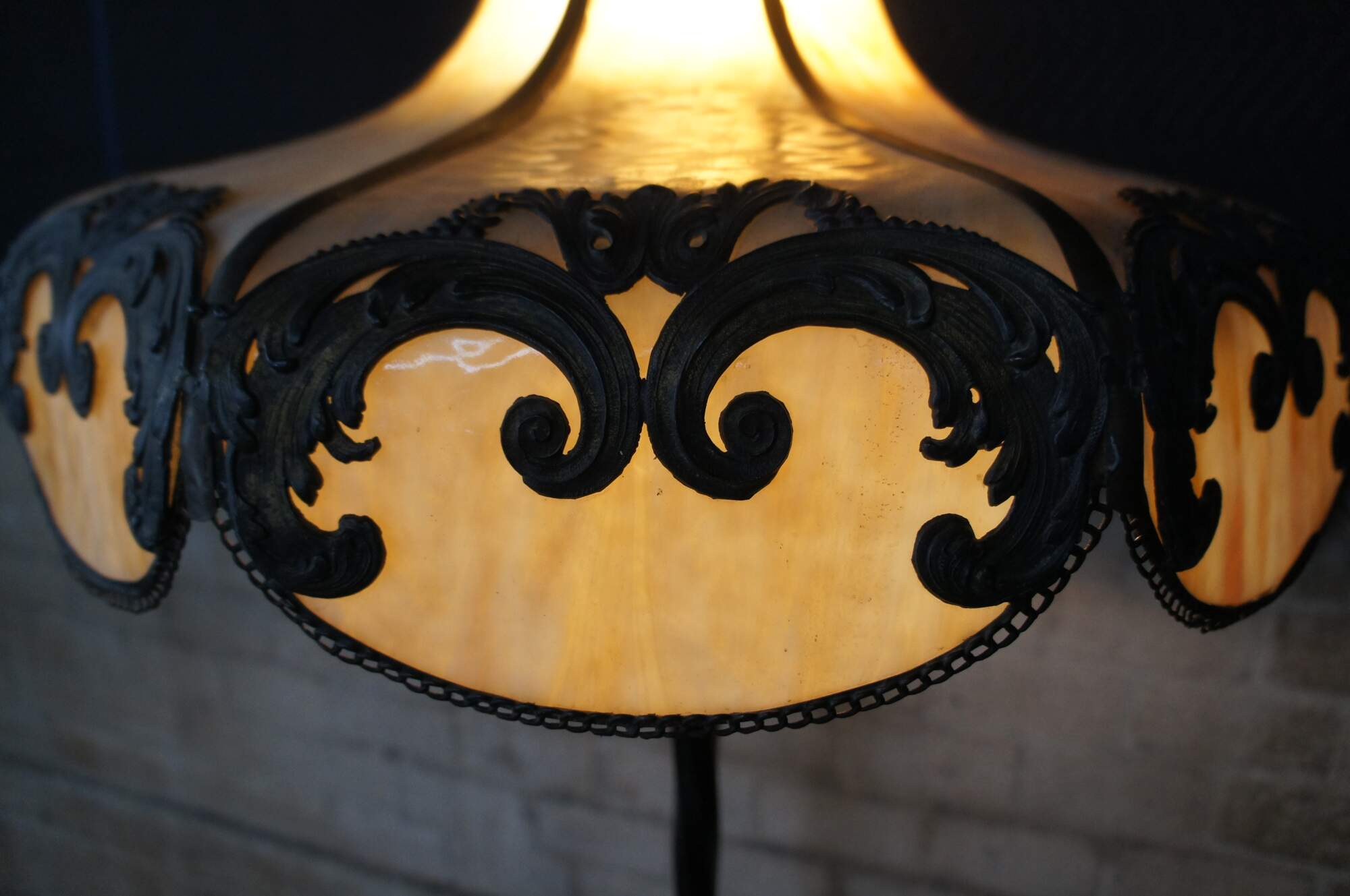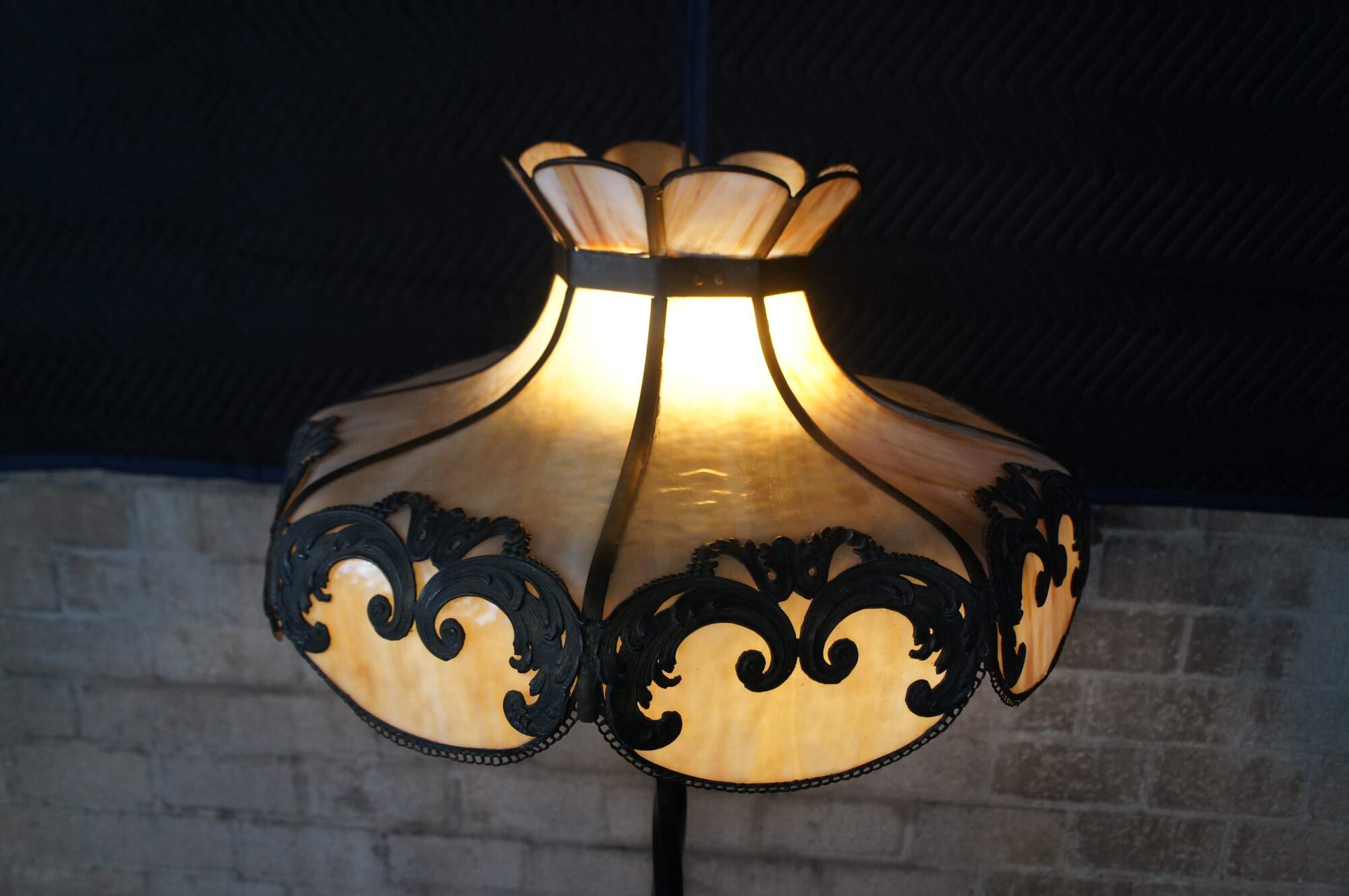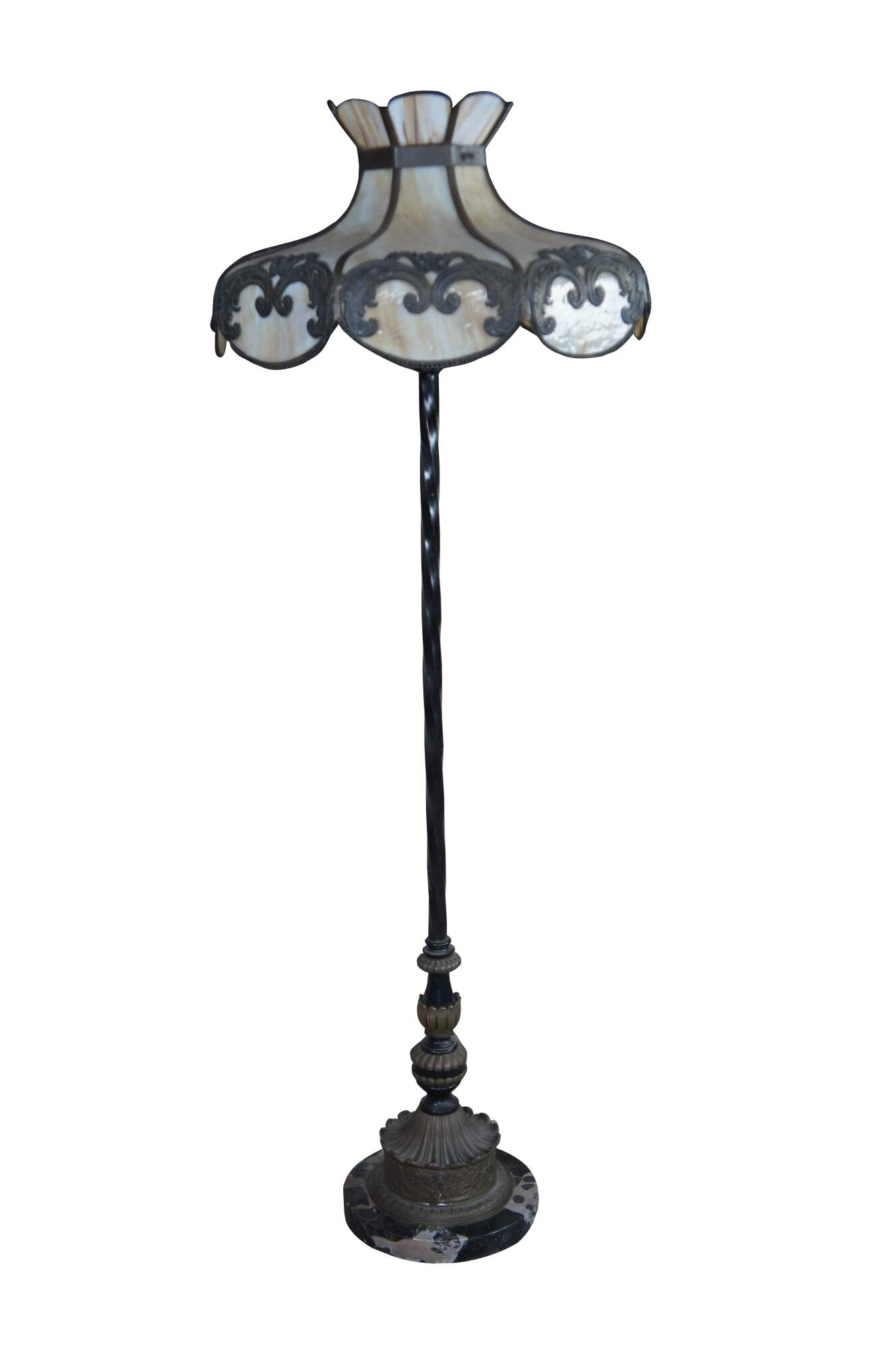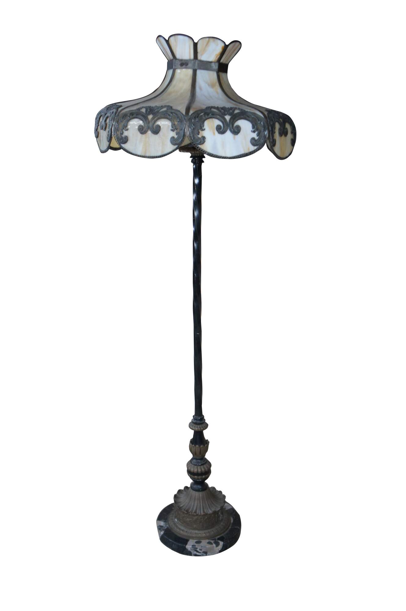 Antique wrought iron Tiffany style floor lamp featuring a stained slag glass shade with art nouveau acanthus design supported by twisted iron body with brass equestrian / horse theme accents and marble base.