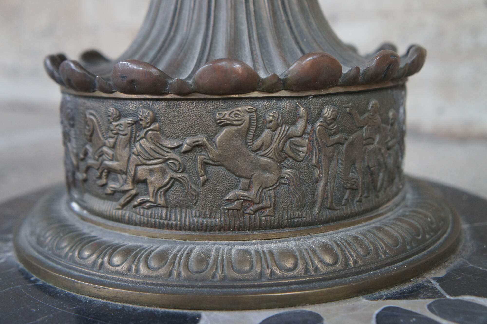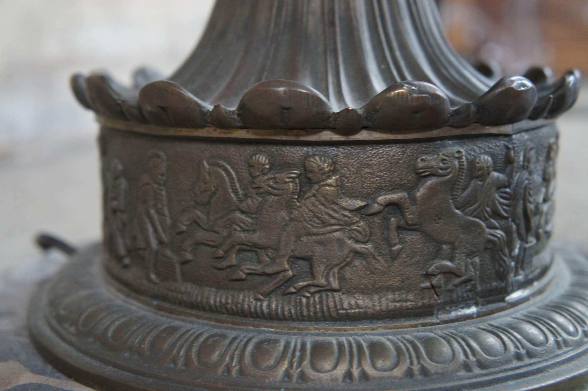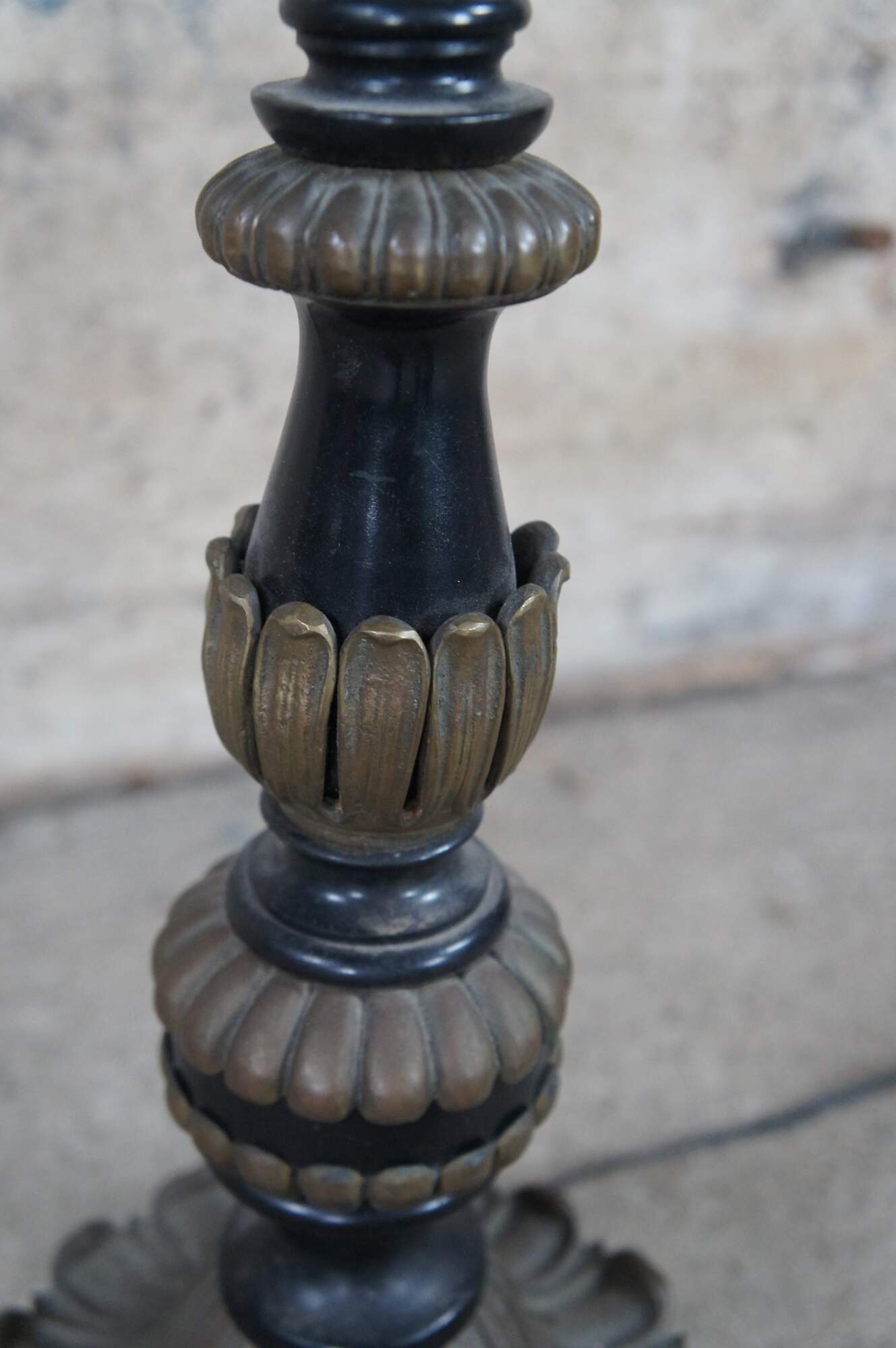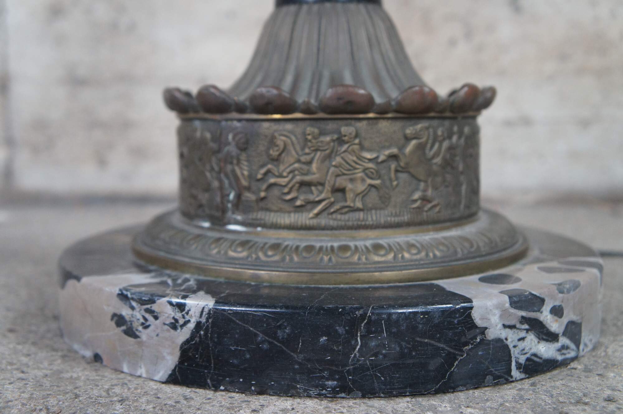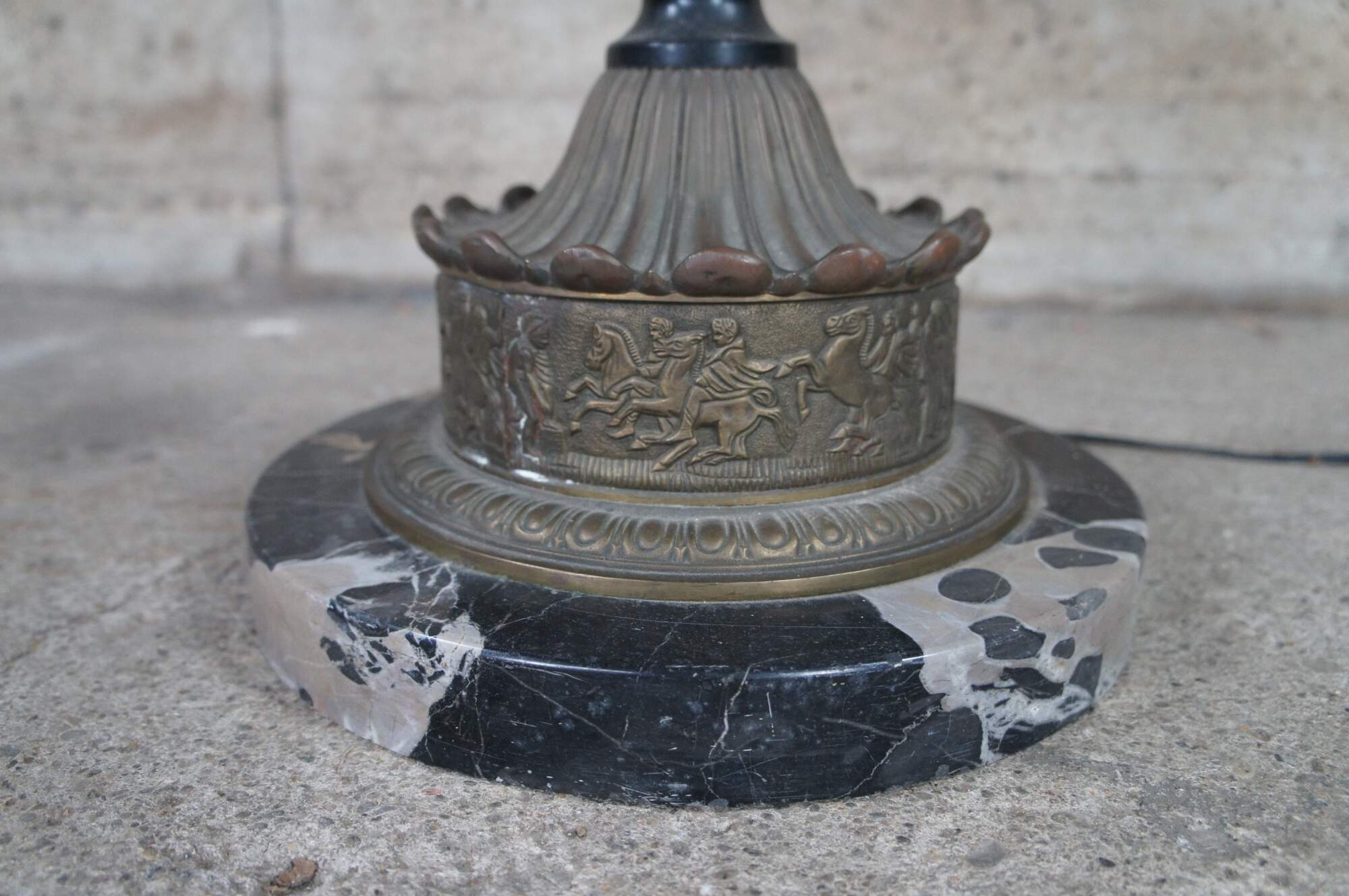 Antique wrought iron Tiffany style floor lamp featuring a stained slag glass shade with art nouveau acanthus design supported by twisted iron body with brass equestrian / horse theme accents and marble base.