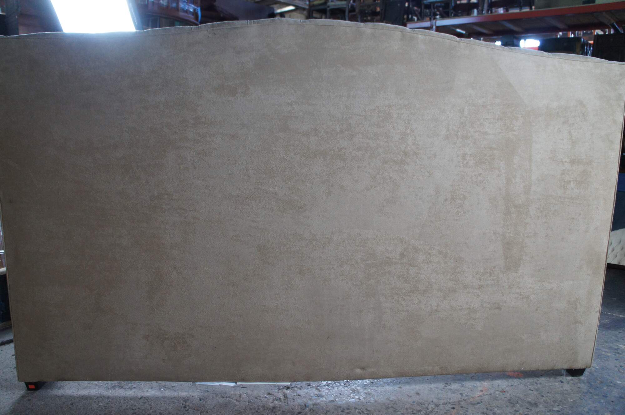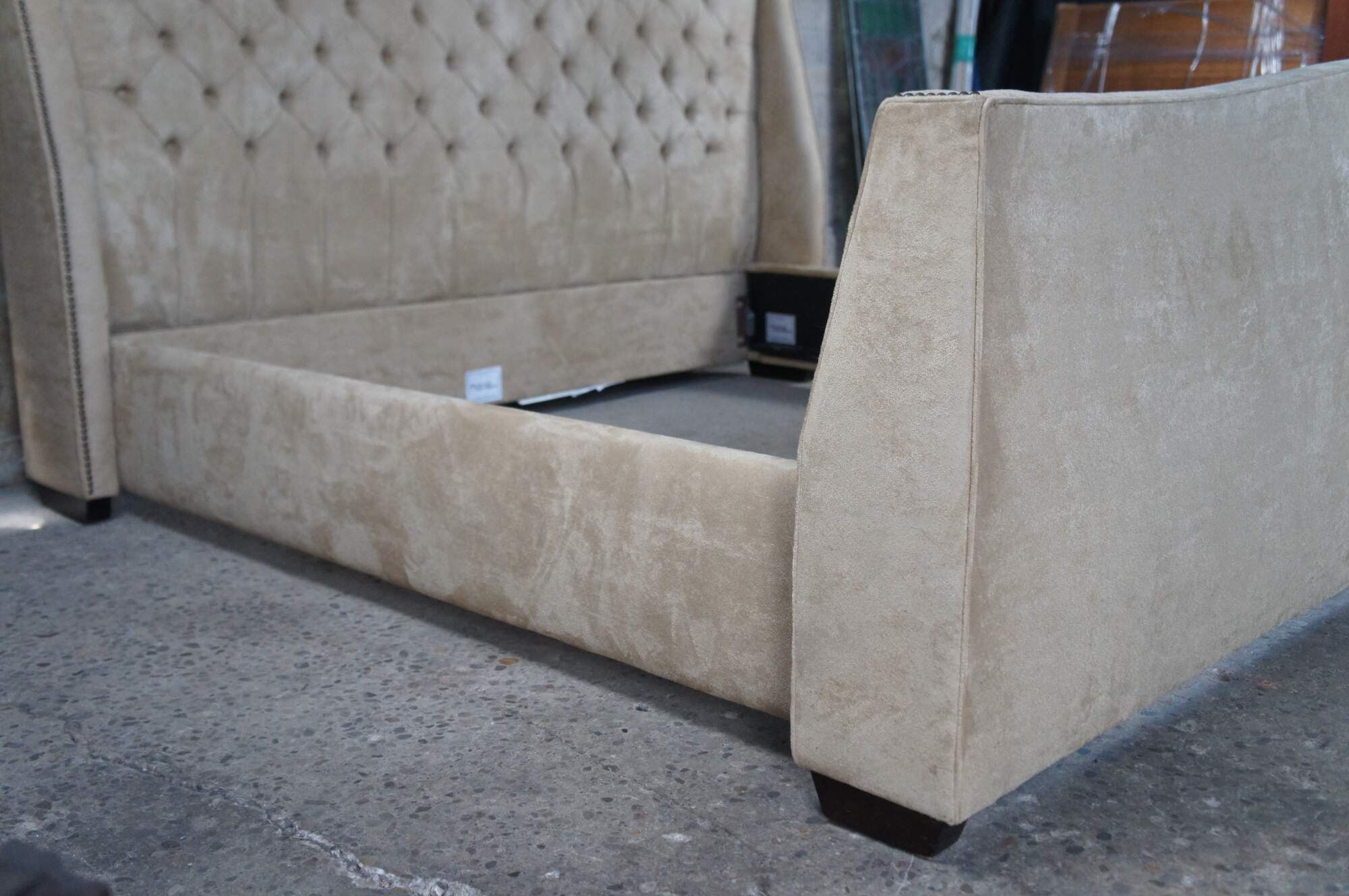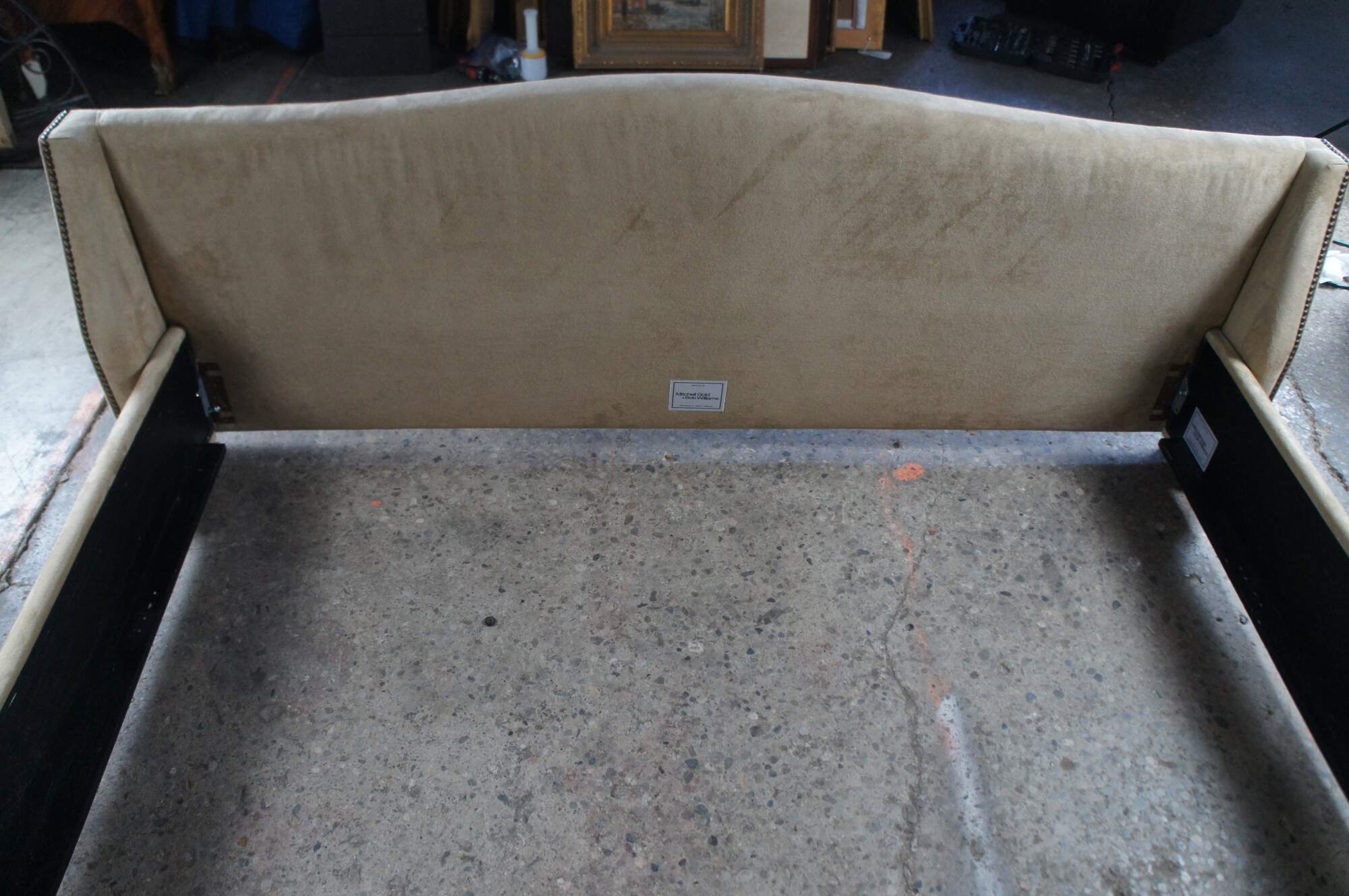 Vintage MG+BW tufted suede nailhead king size bed frame.