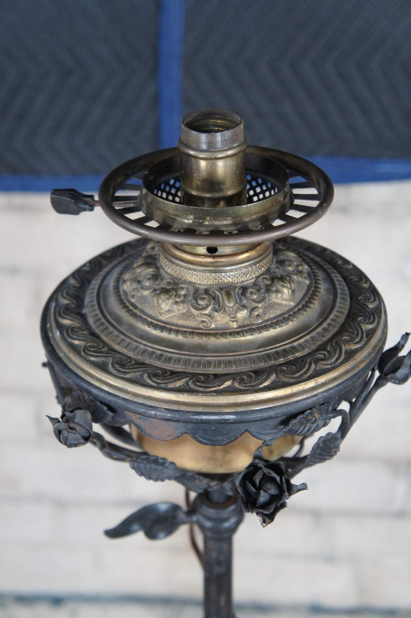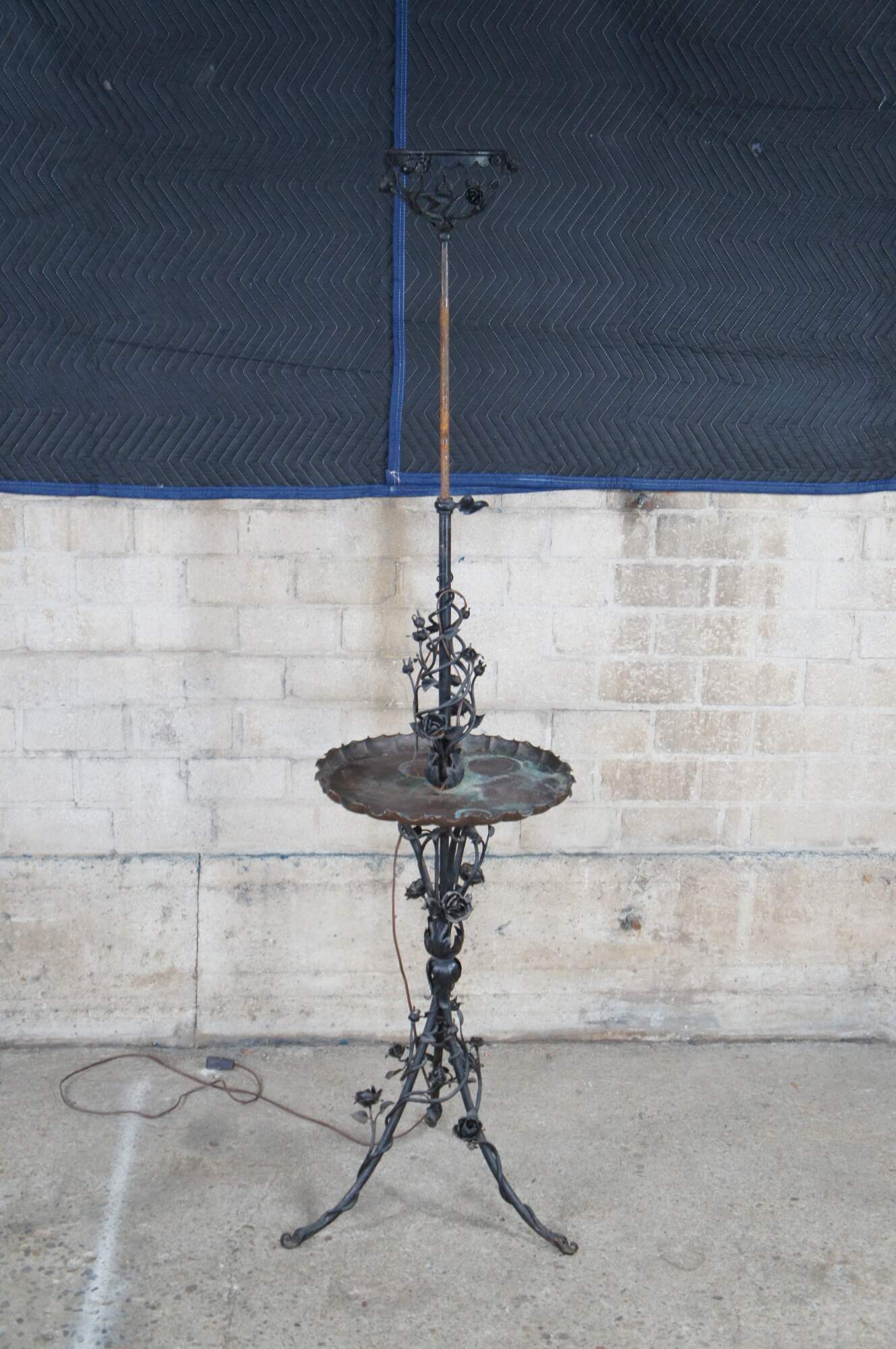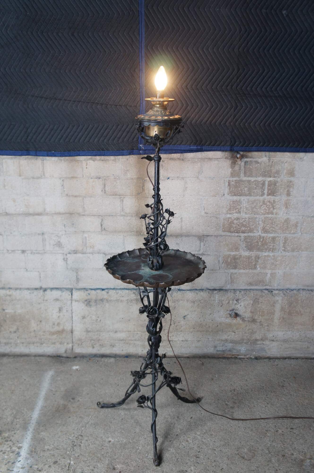 Antique Victorian wrought / forged iron converted rise and fall oil lantern floor lamp. Made of iron featuring Art Nouveau styling with a floral rose / vine / acanthus theme, tripod base, bronze tray table and extendable lantern light.