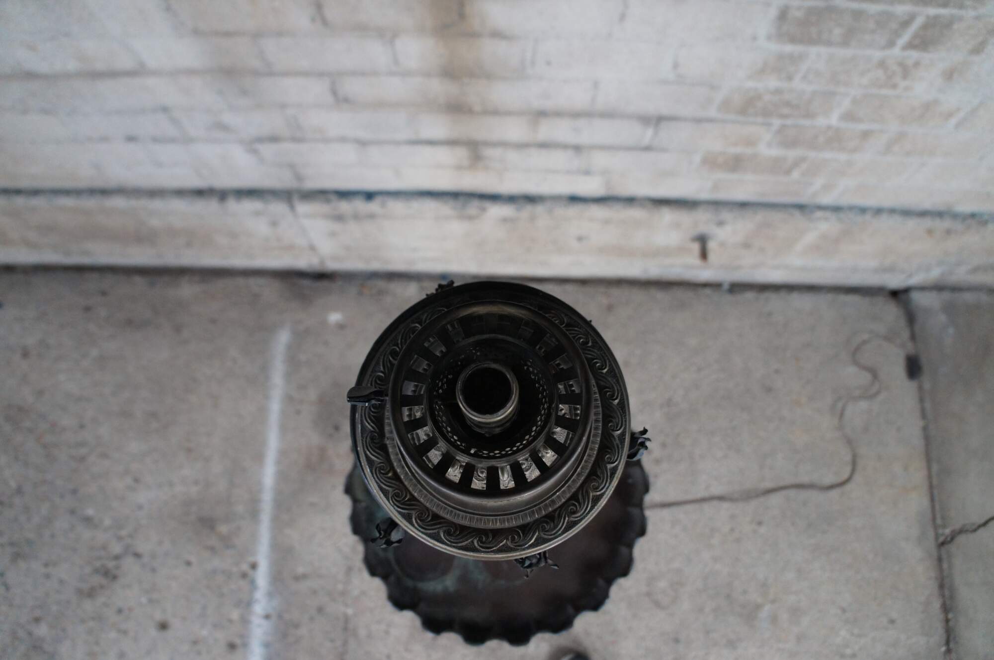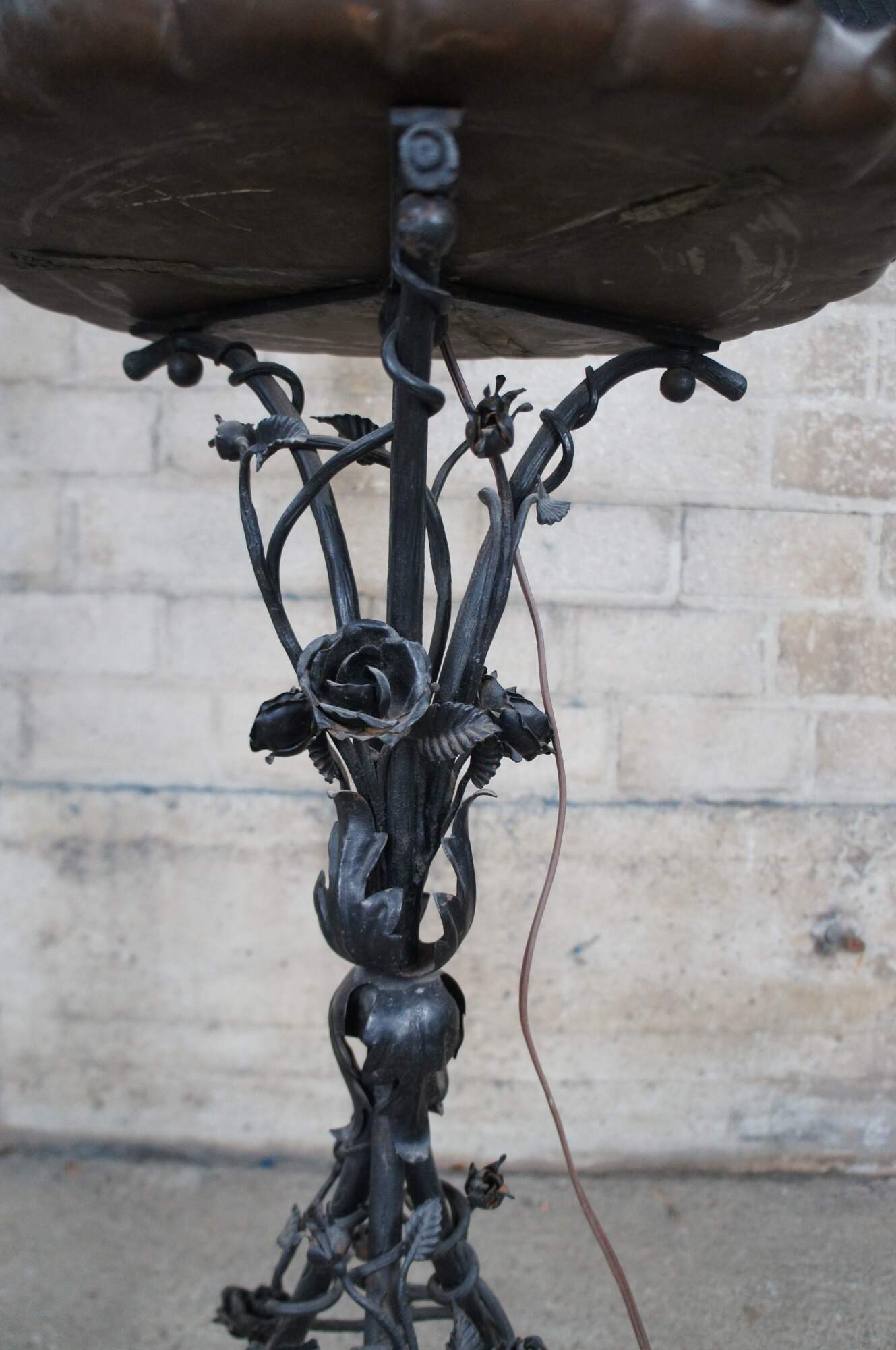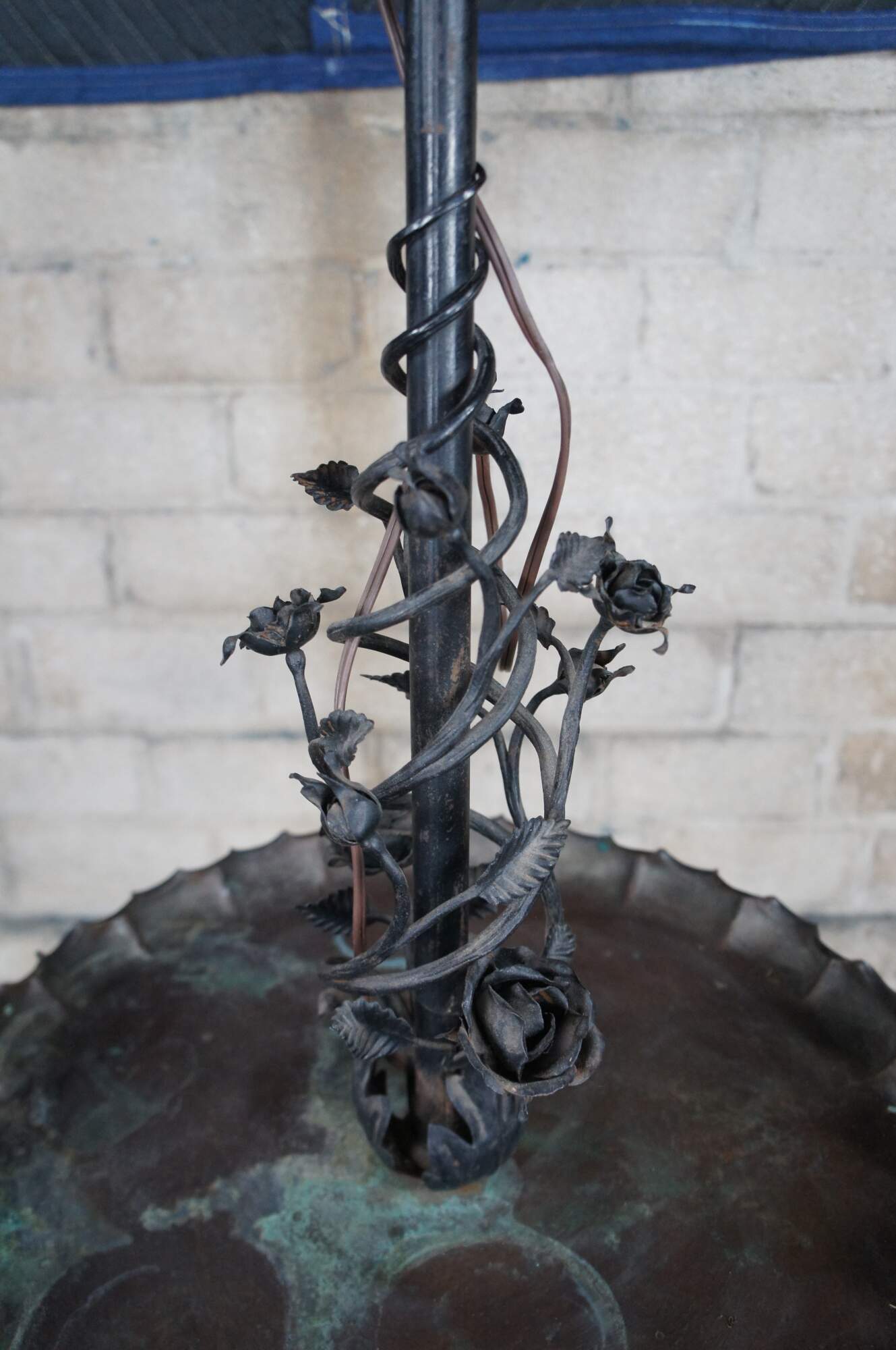 Antique Victorian wrought / forged iron converted rise and fall oil lantern floor lamp. Made of iron featuring Art Nouveau styling with a floral rose / vine / acanthus theme, tripod base, bronze tray table and extendable lantern light.