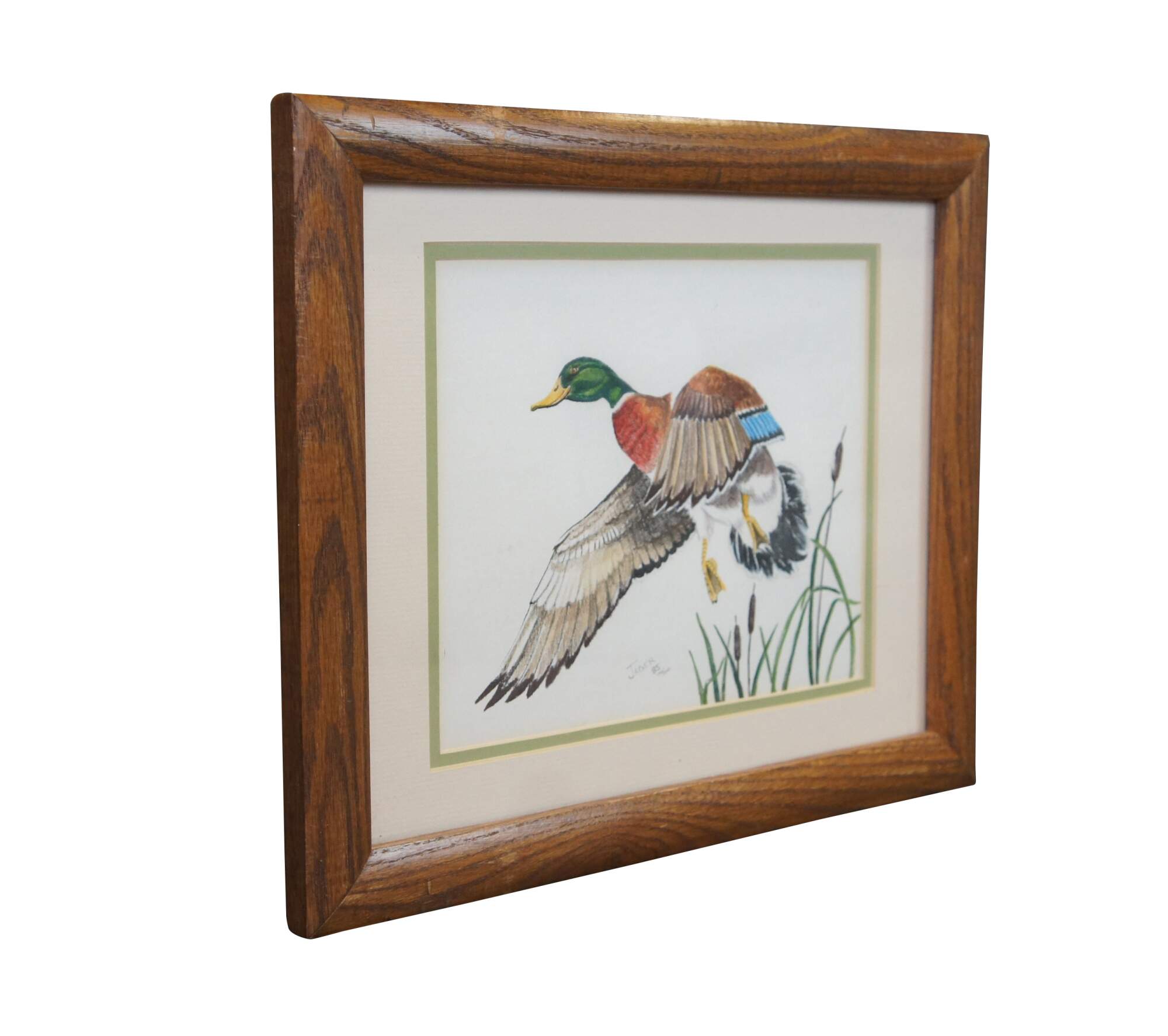 Late 20th century lithograph print of a brightly colored mallard taking flight over cattails. Signed in plate Jager 85. Pencil numbered 96/1000. Wood frame; white and green layered mat. Hunting.