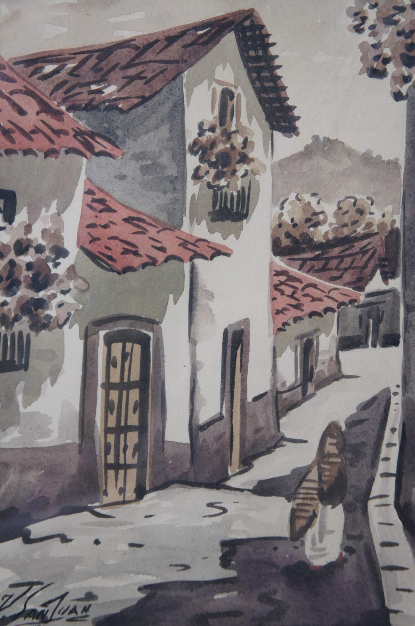 Mid to late 20th century original watercolor painting showing a cityscape / street scene with figure walking down a neighborhood filled with red tiled roof stucko houses. Beveled wood frame; white and gold layered mat.