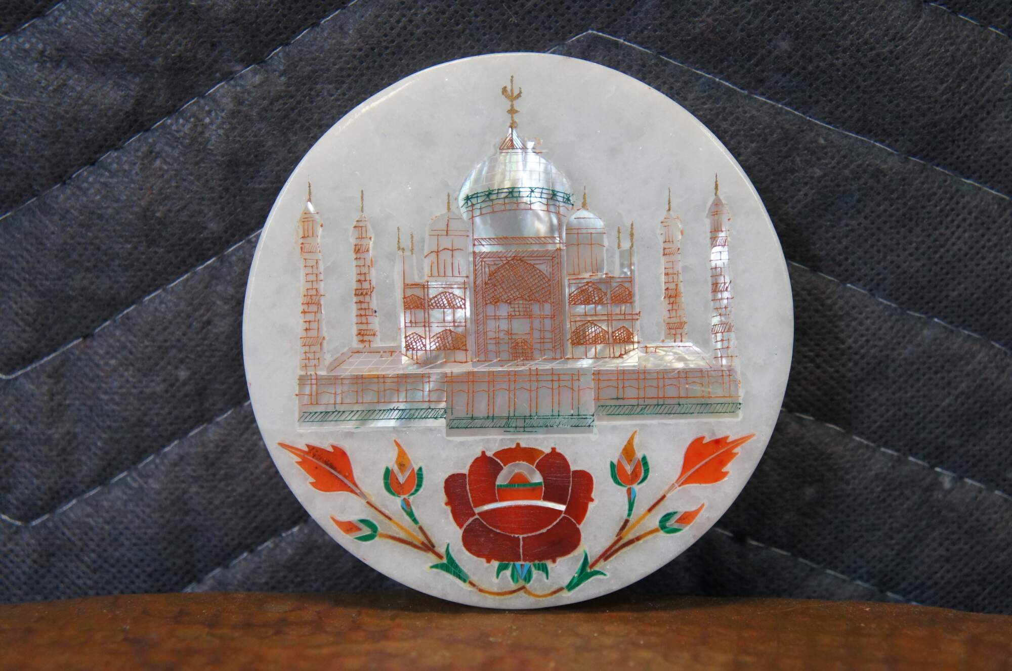 Late 20th century set of five round coasters with storage container and lid, crafted of white marble inlaid with an image of the Taj Mahal and floral moif in shimmering mother of pearl, abalone, and other semi-precious stones.