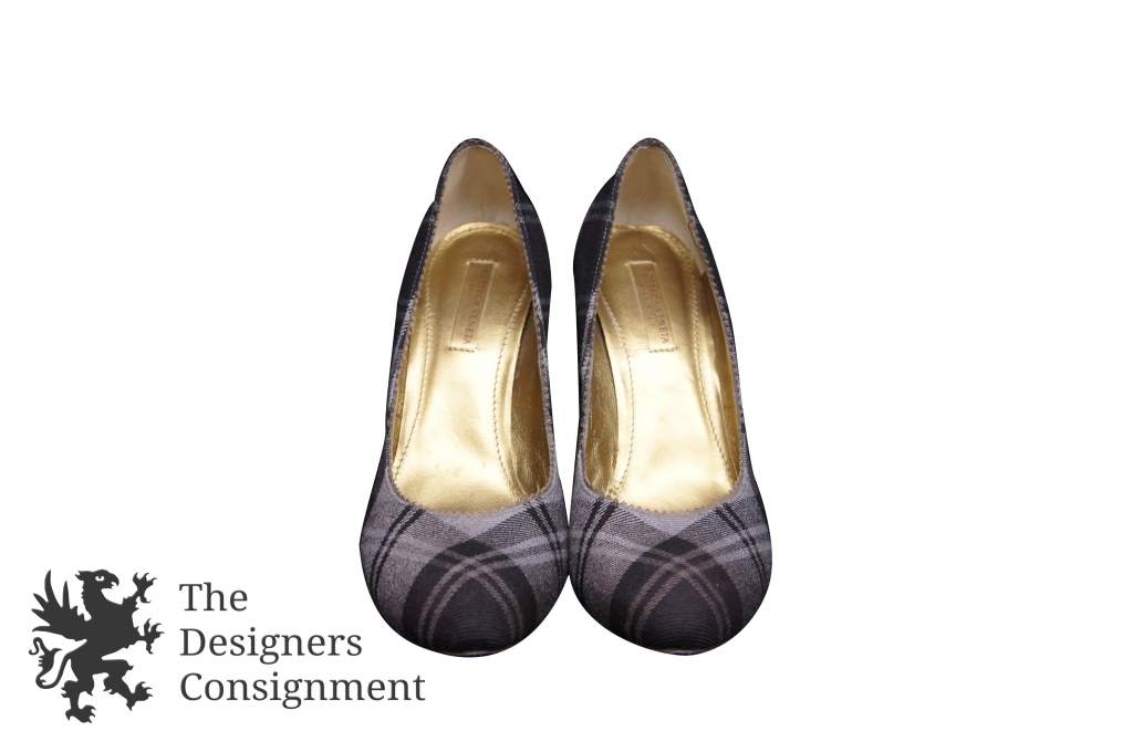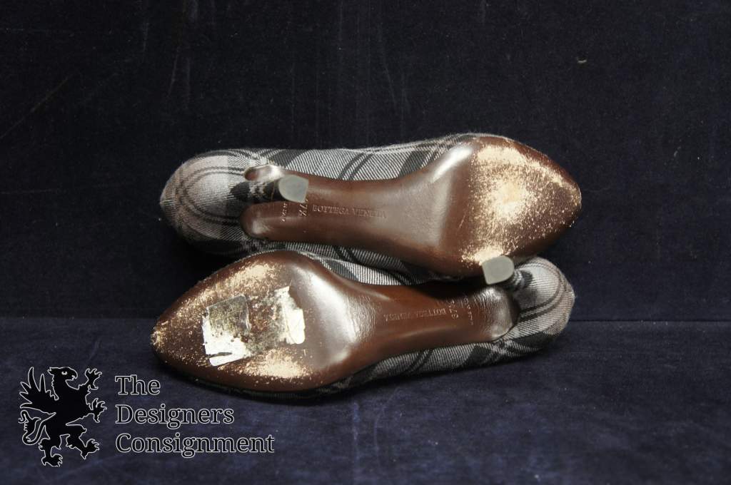 Here is a stunning pair of Bottega Veneta pumps. Features a plaid fabric and brown leather bottoms. Made in Italy Size 37 1/2 (6 1/2- 7 US). The insides are gold. A great addition to your wardrobe.