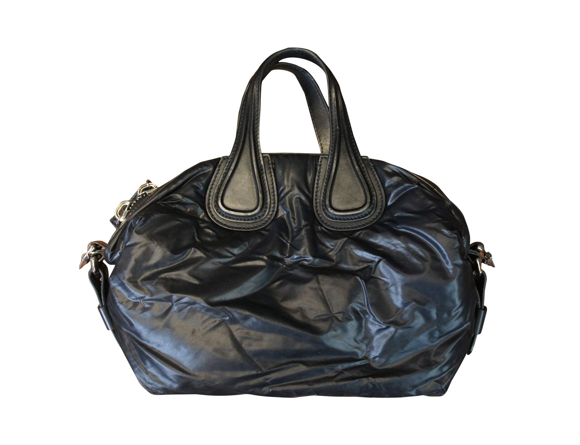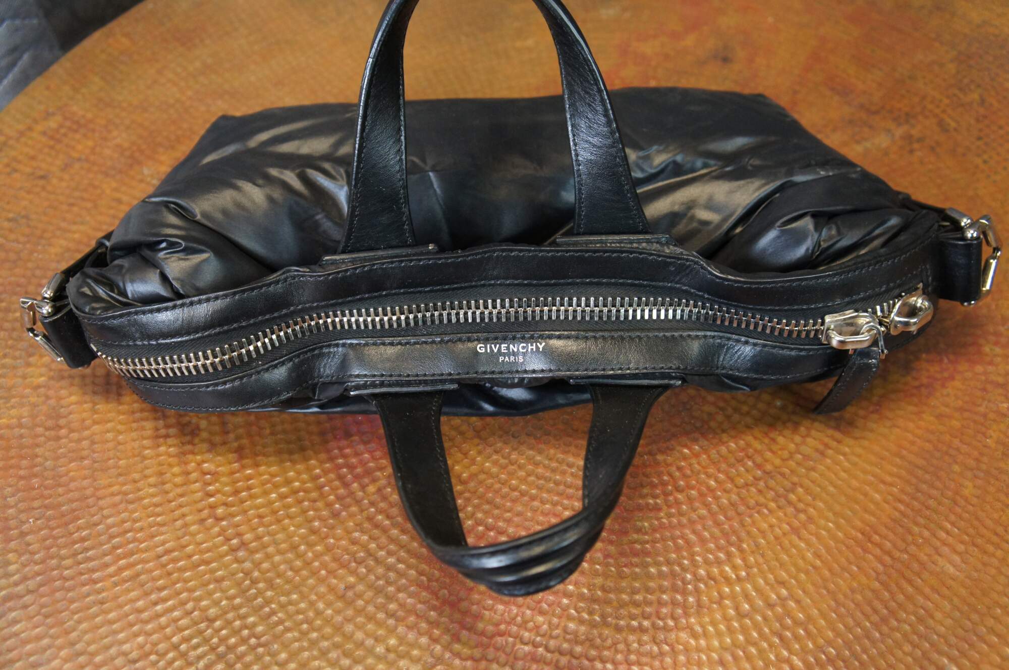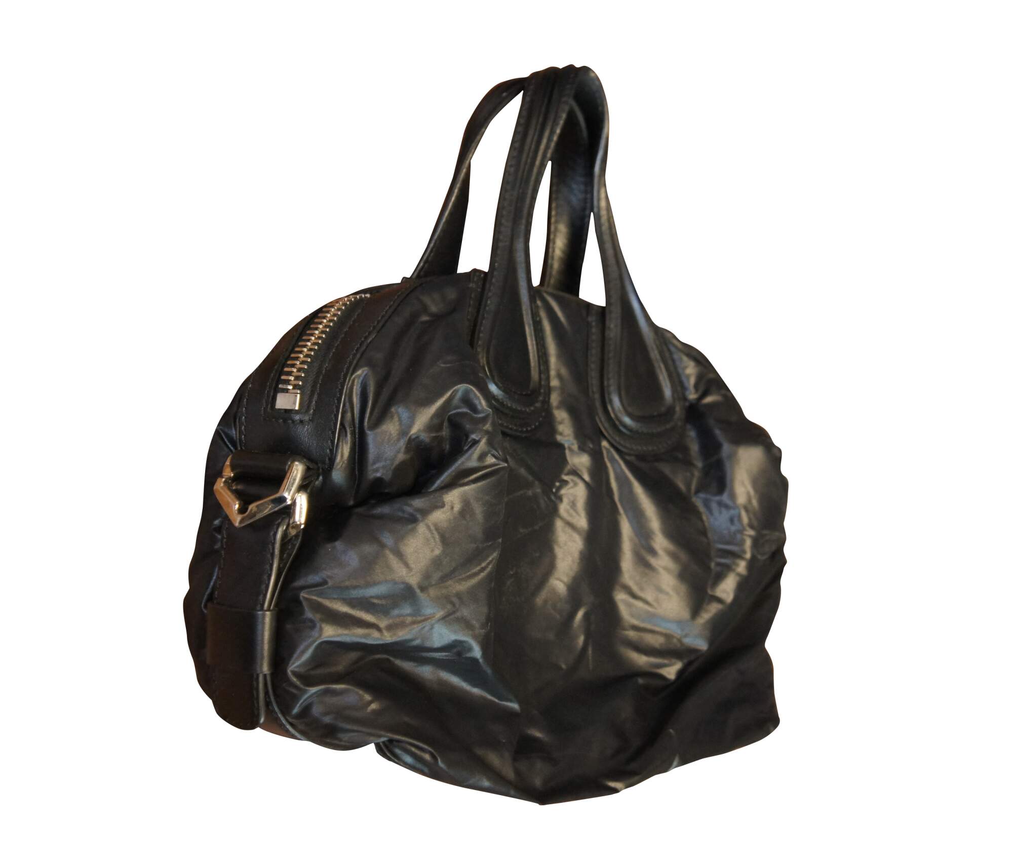 Vintage Givenchy Paris Nightingale small duffle bag / purse. Black nylon with leather double handles and trim. Chrome / silver hardware. Zipper closure. Missing de-tachable shoulder strap. Black cotton twill lining. Two interior slip pockets/ one interior zipper pocket. Made in Italy.