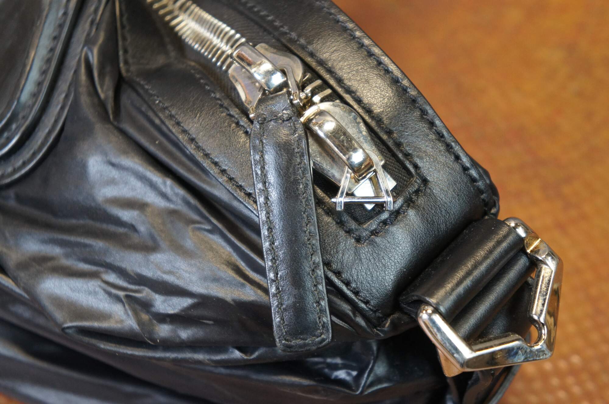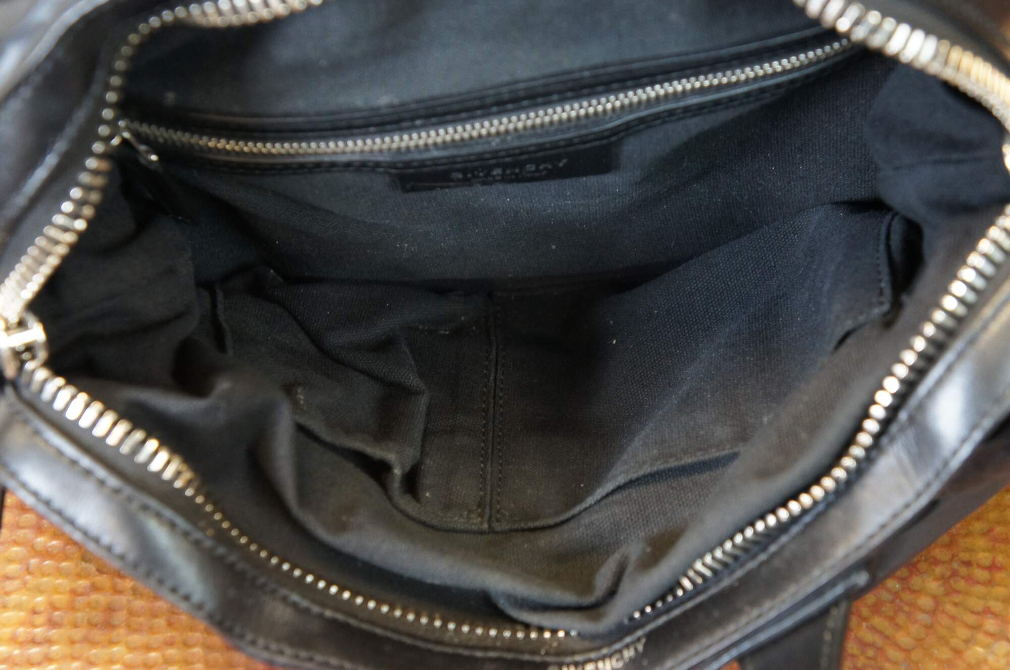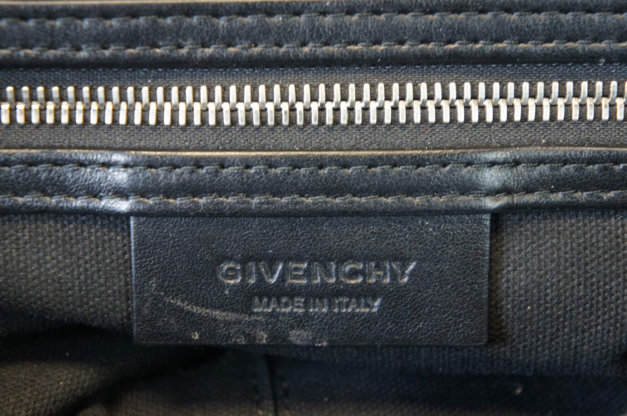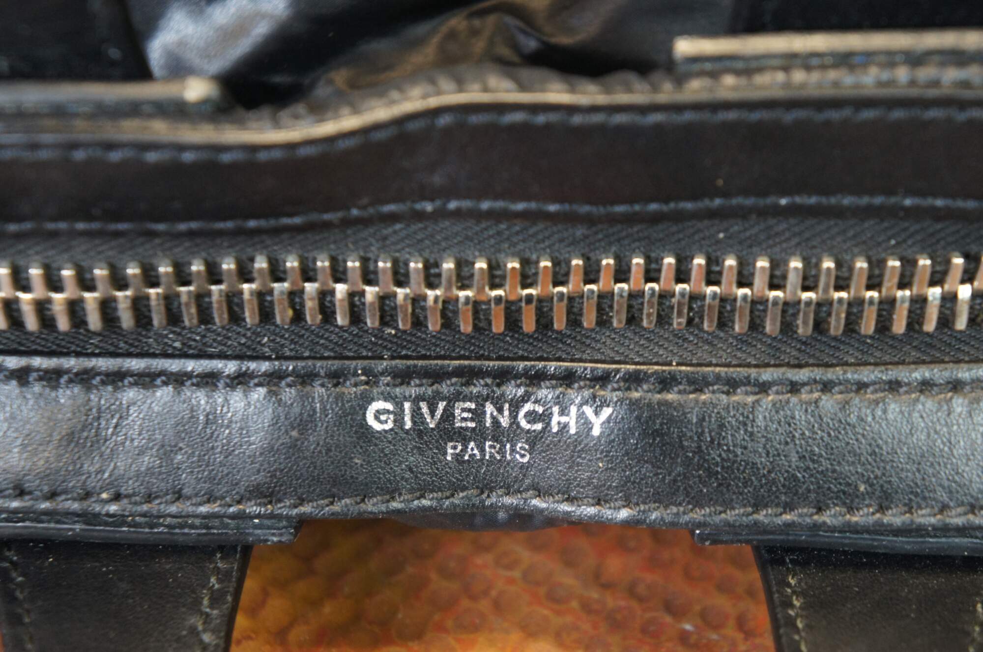 Vintage Givenchy Paris Nightingale small duffle bag / purse. Black nylon with leather double handles and trim. Chrome / silver hardware. Zipper closure. Missing de-tachable shoulder strap. Black cotton twill lining. Two interior slip pockets/ one interior zipper pocket. Made in Italy.
