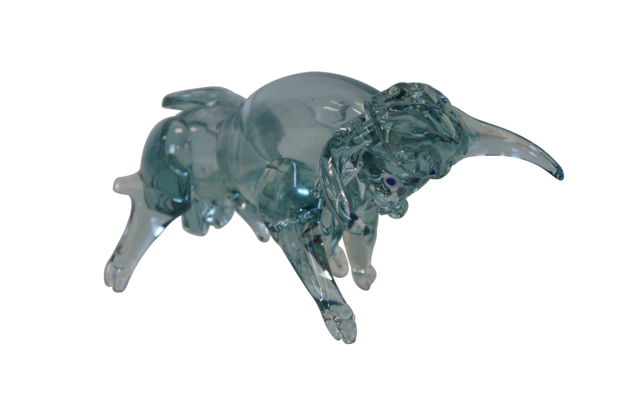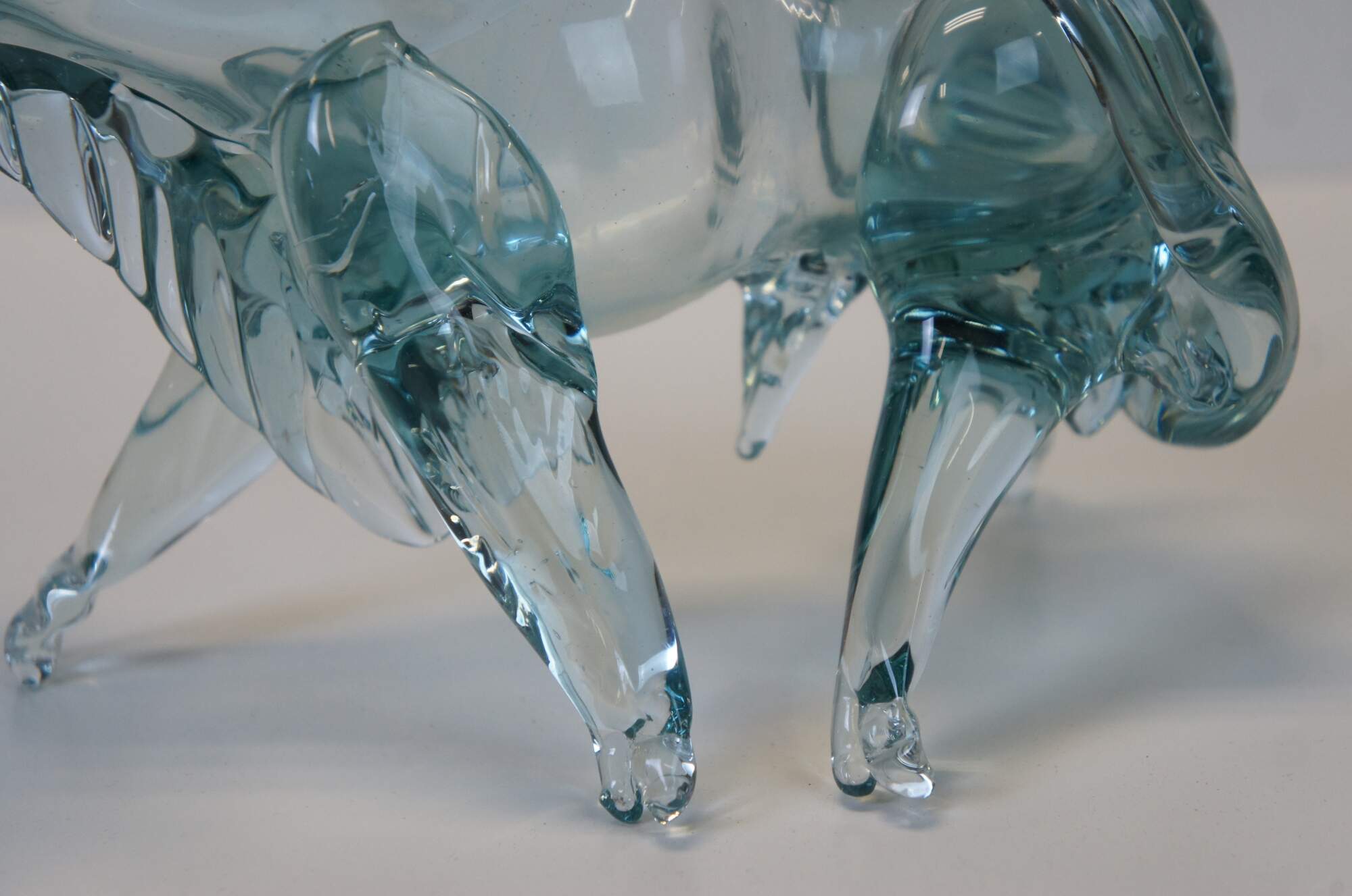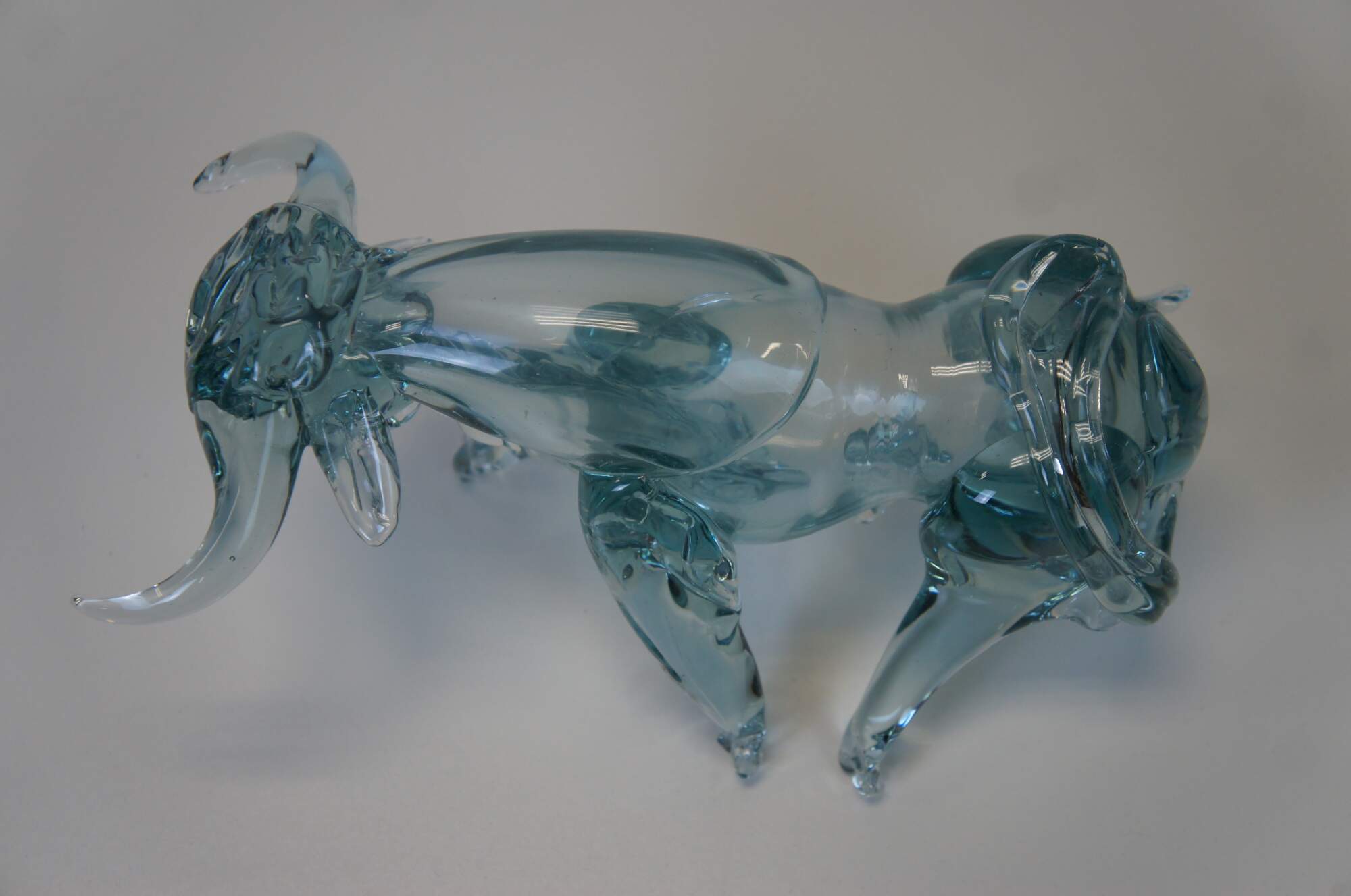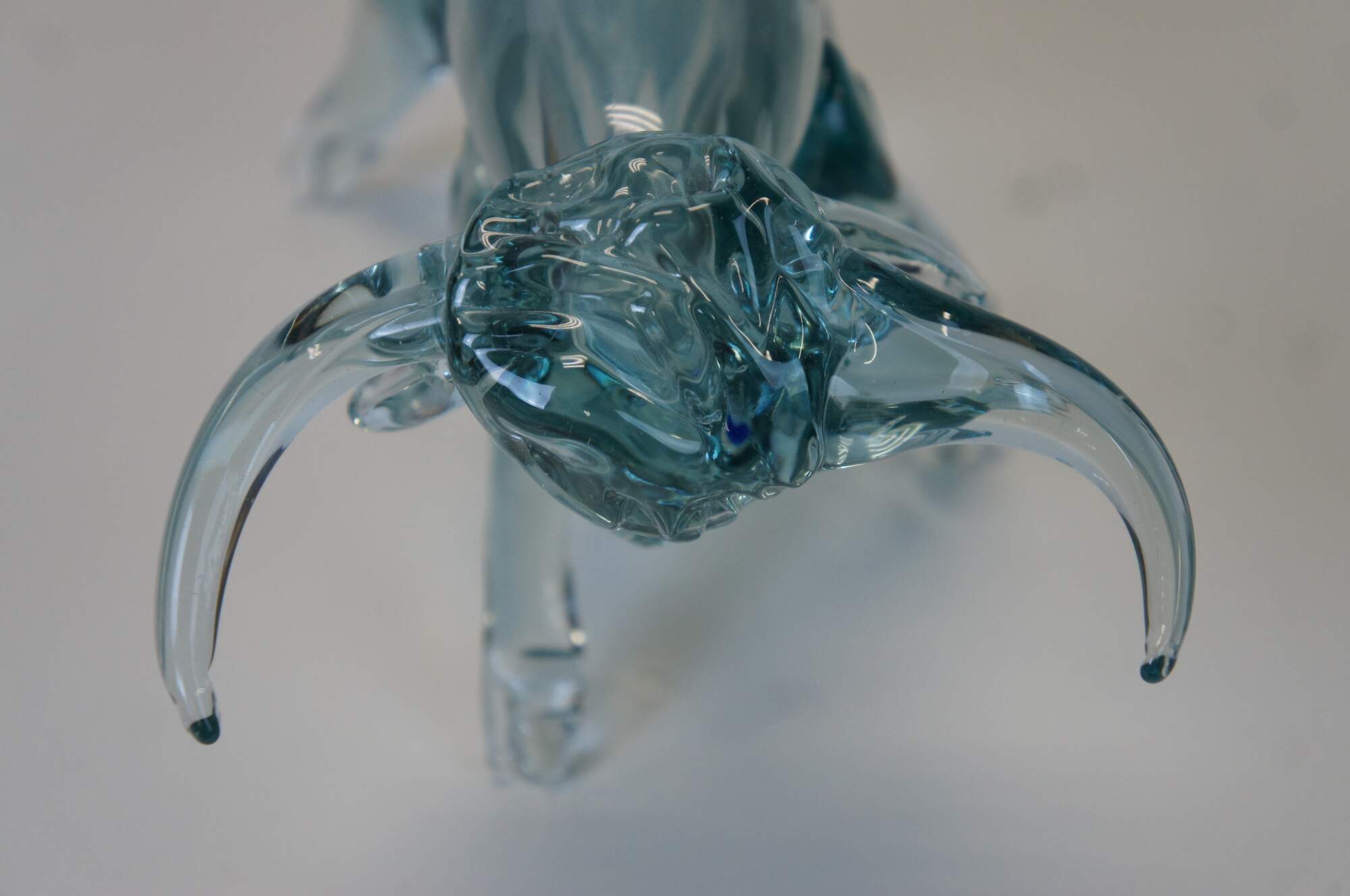 Mid century light blue, hand blown Italian / Murano art glass raging rodeo bull with opaque blue and white eyes.