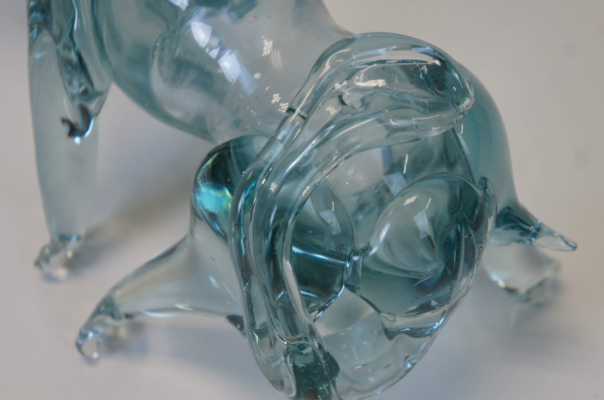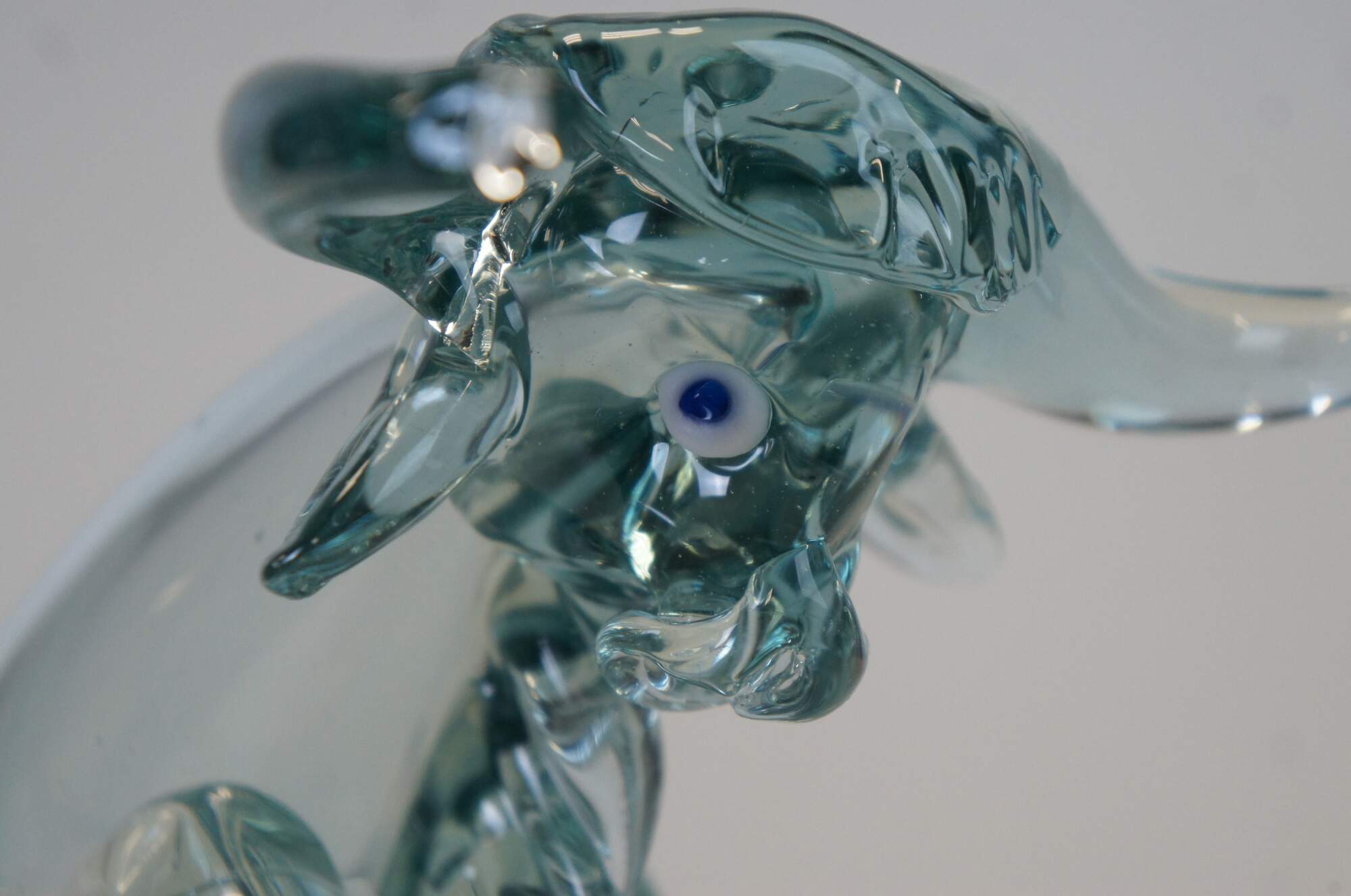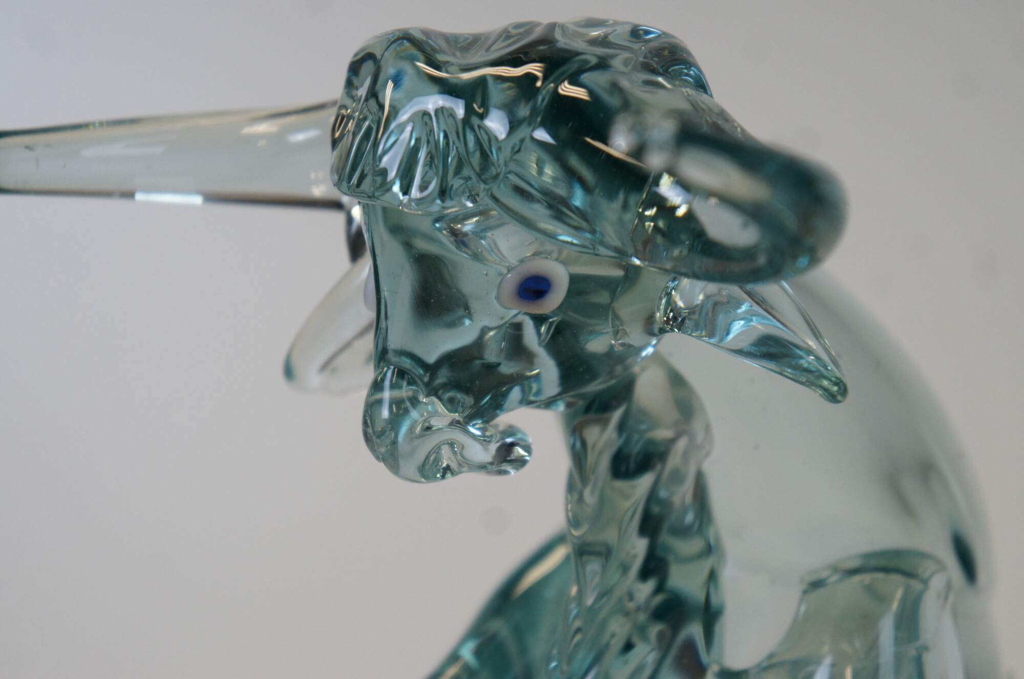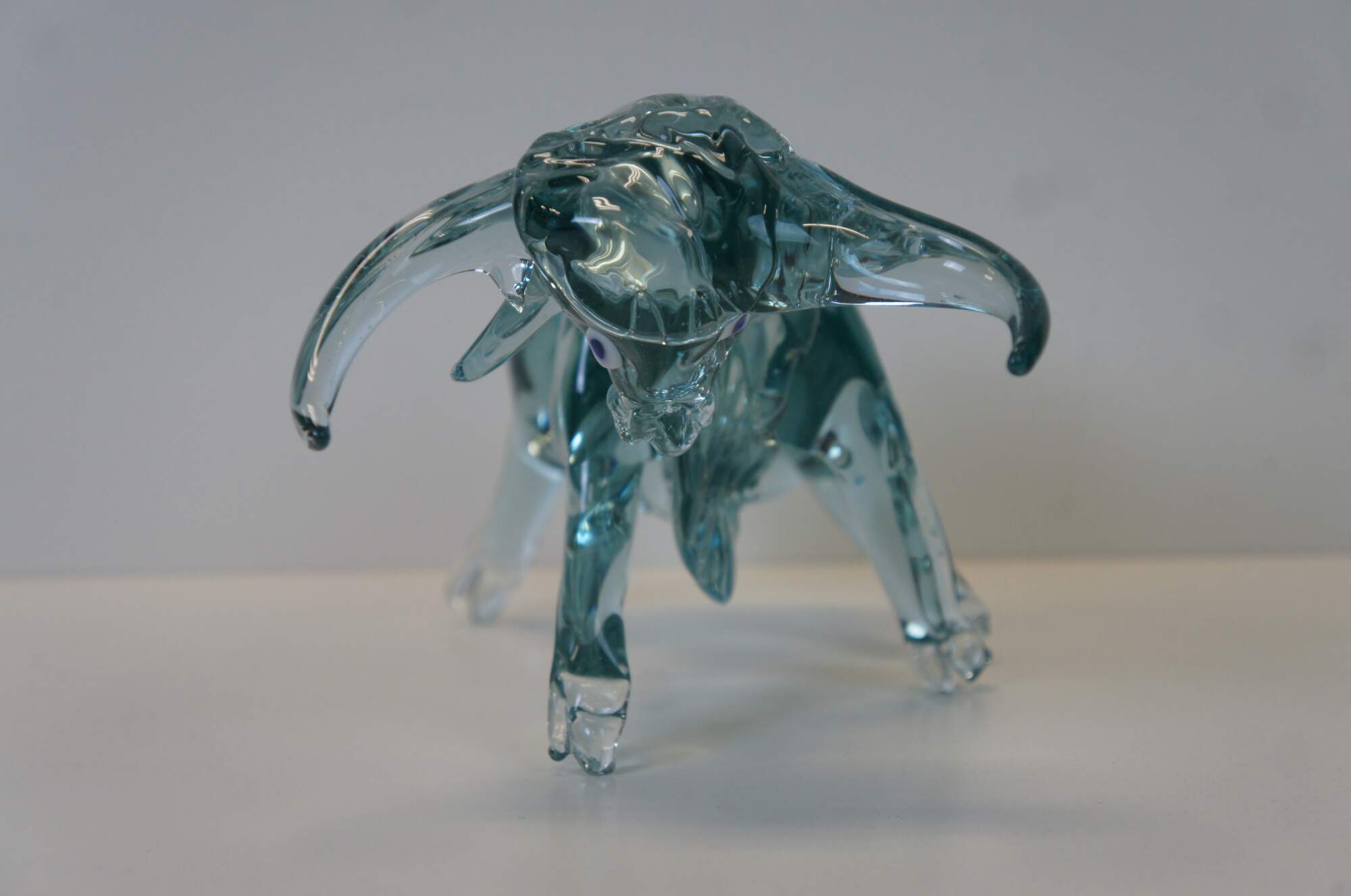Mid century light blue, hand blown Italian / Murano art glass raging rodeo bull with opaque blue and white eyes.