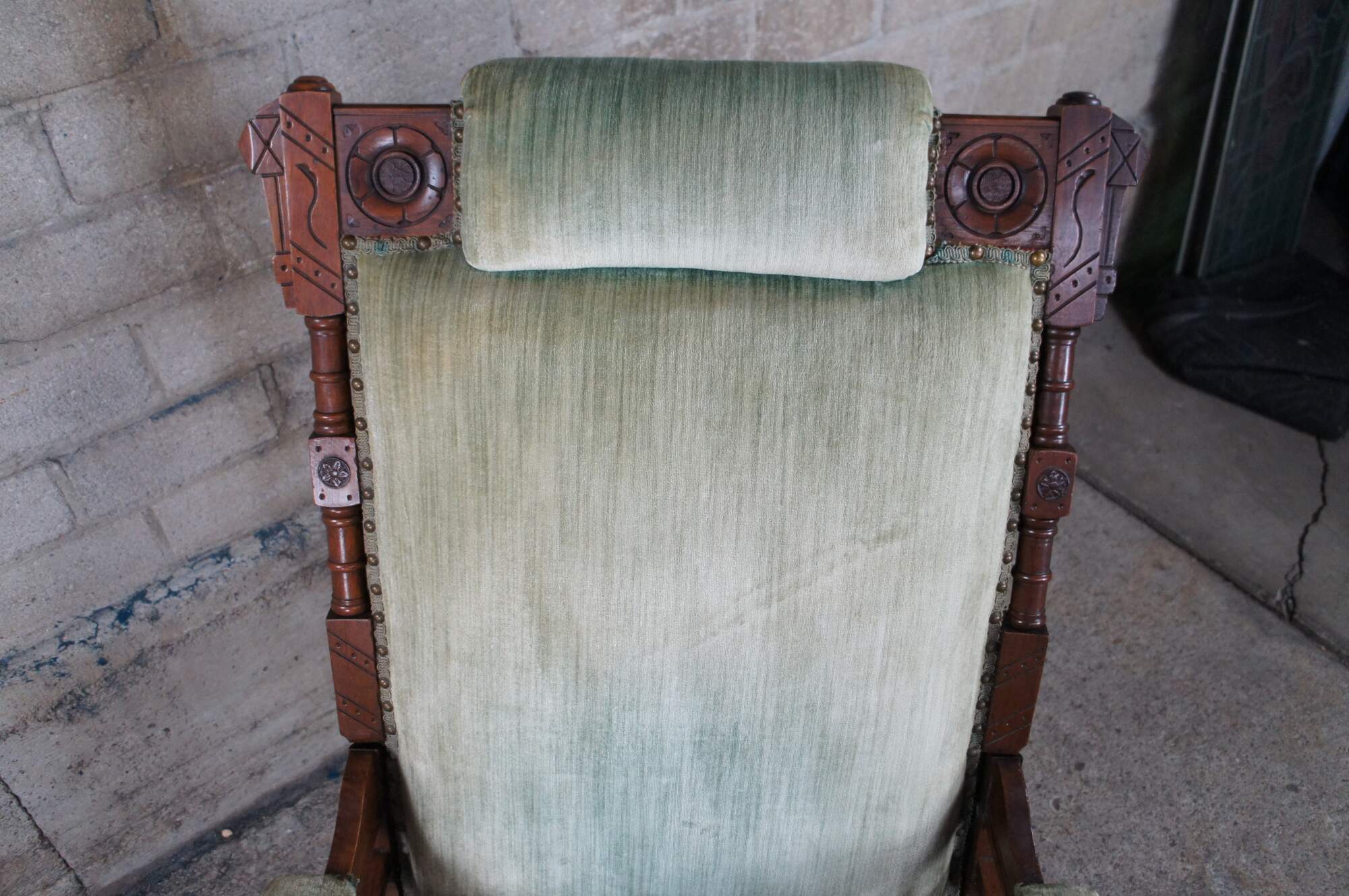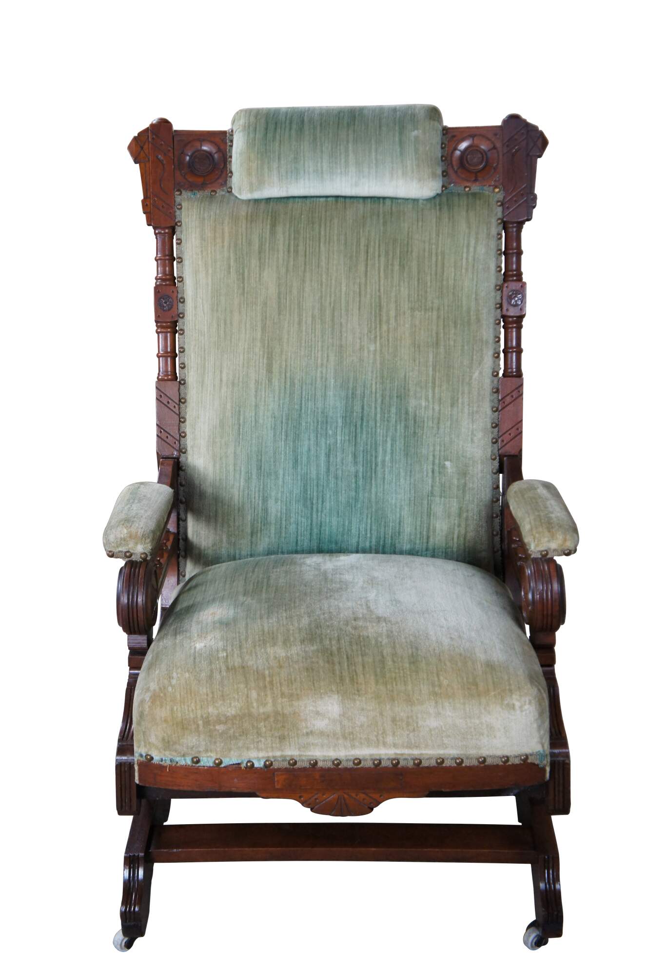 Antique Victorian platform rocking armchair. Made of walnut featuring Eastlake styling with turned foliate and wheel designs, padded arms / headrest, and nailhead trim. Upholstered in green velvet. Rock, Hughes & Co., Furniture & Rugs , Urbana Ohio.