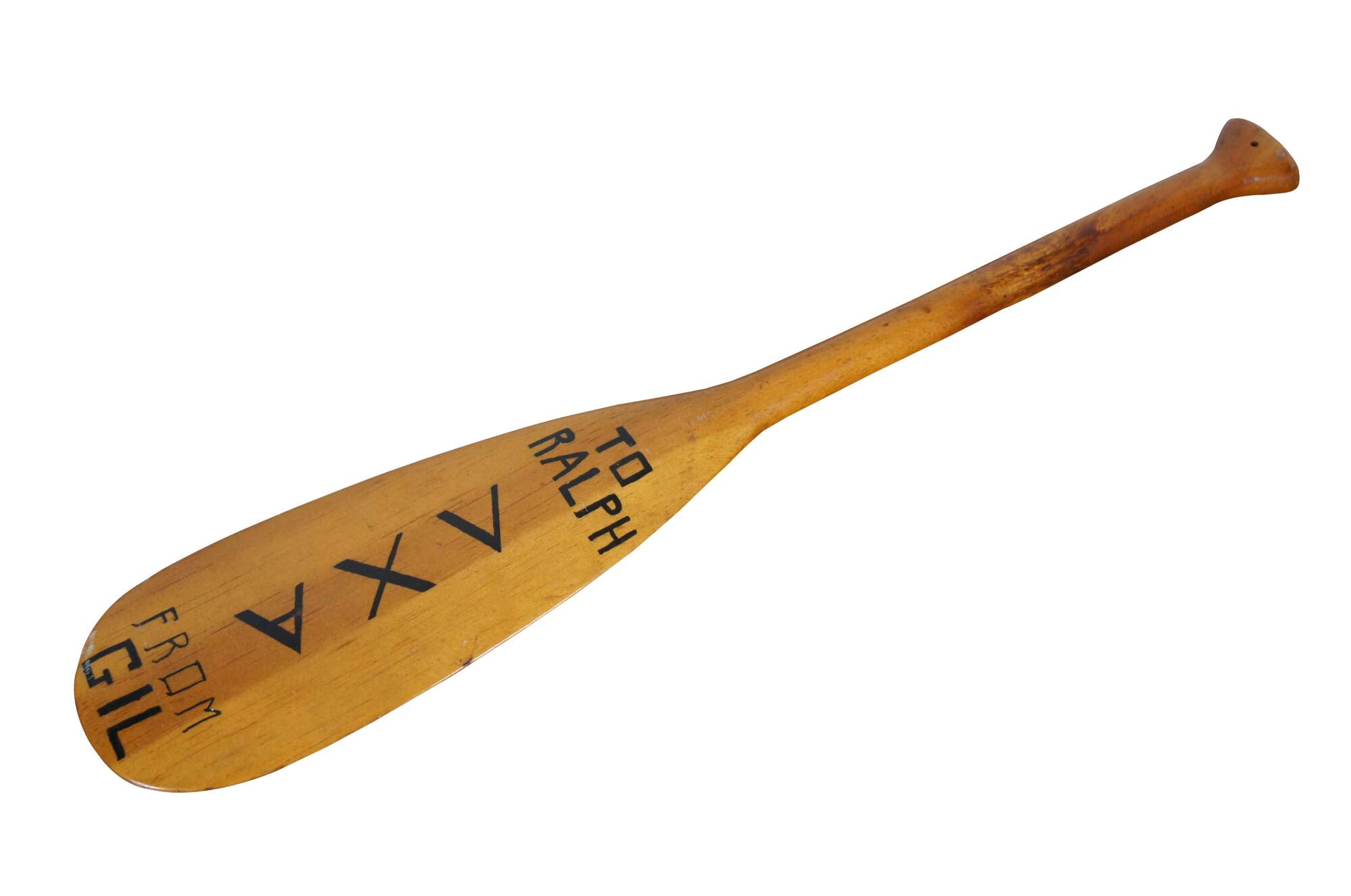Mid 20th century wooden folk art canoe oar / paddle, custom decorated with "To Ralph From Gil" and the letters of the Lambda Chi Alpha college / university fraternity.