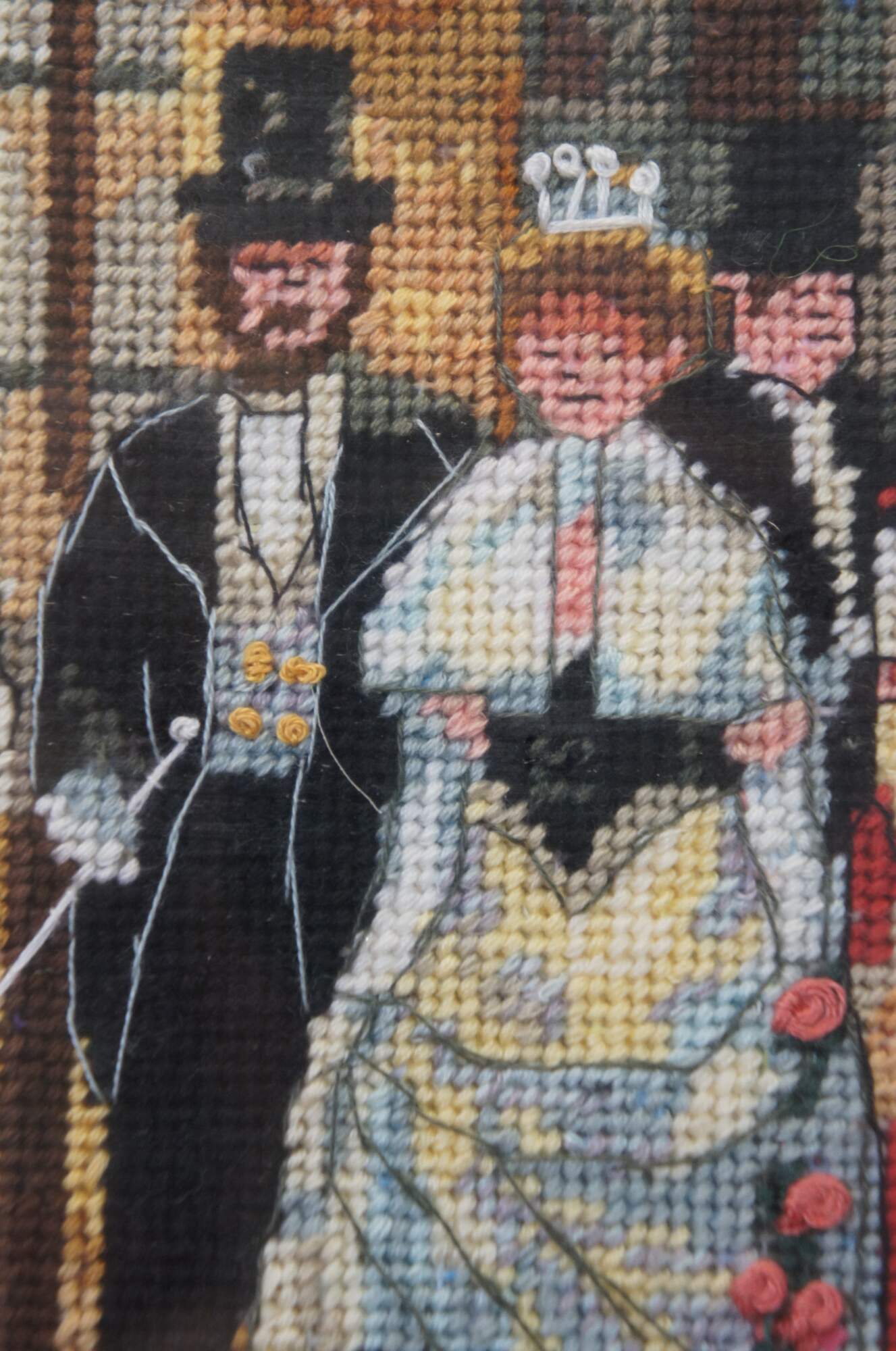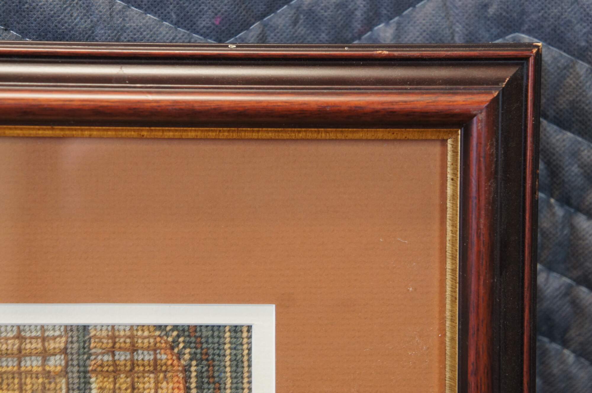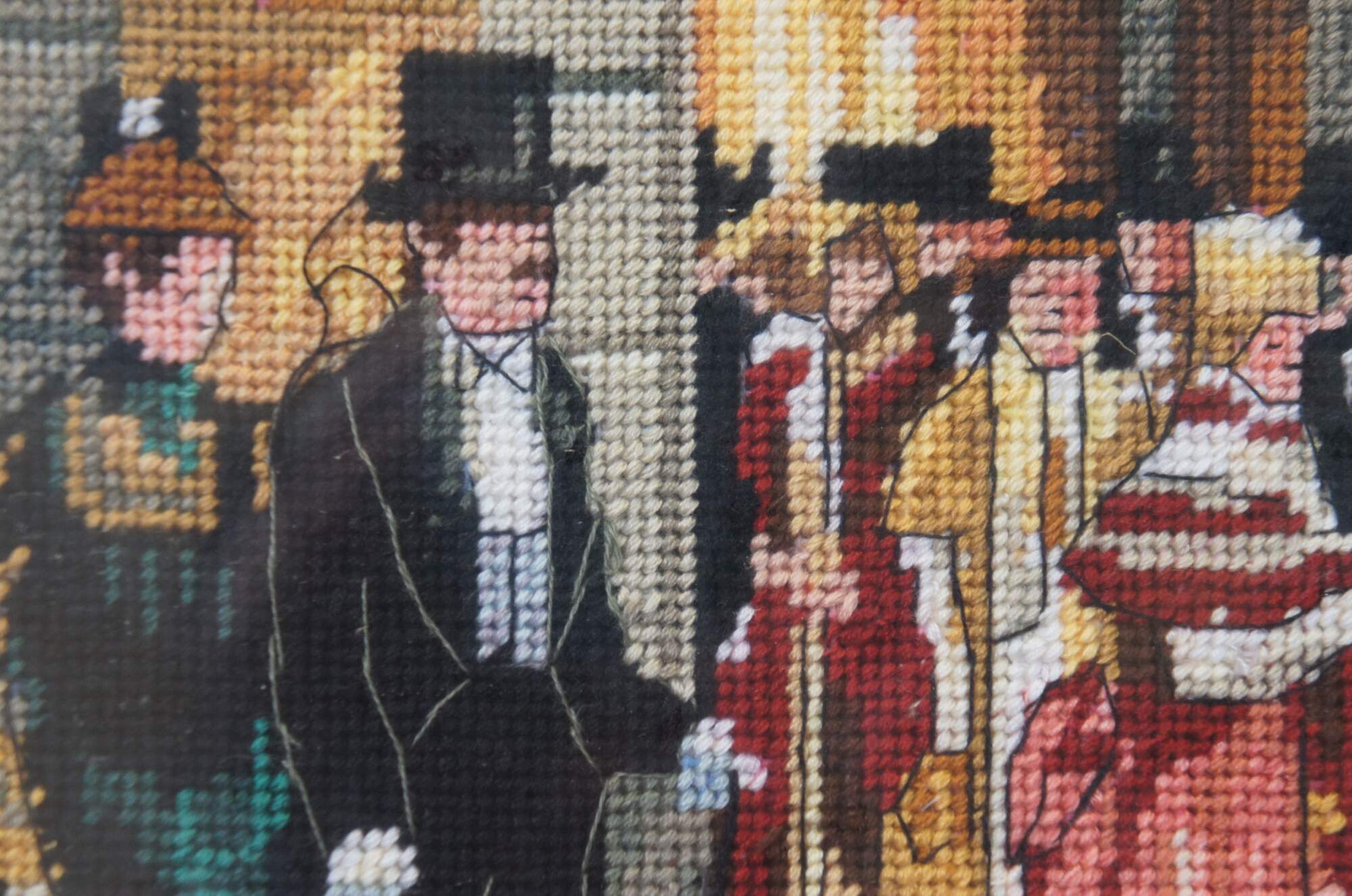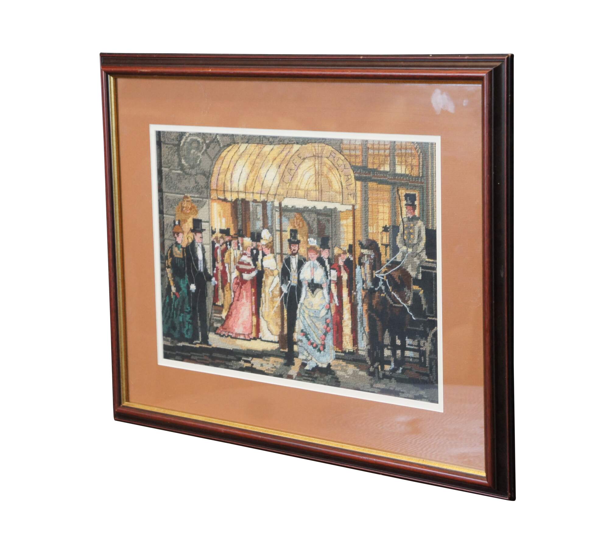 Late 20th century framed and completed, hand crafted cross stitch art titled Cafe Royale depicting a Victorian era street scene of a carriage and elegant figures in evening wear at the entrance to the Cafe Royale. The Gold Collection by Dimensions - Number 2465 - Cafe Royale - A Needlepoint Design by Alan Maley. Beveled wood frame with gold interior edge; apricot and white layered mat.