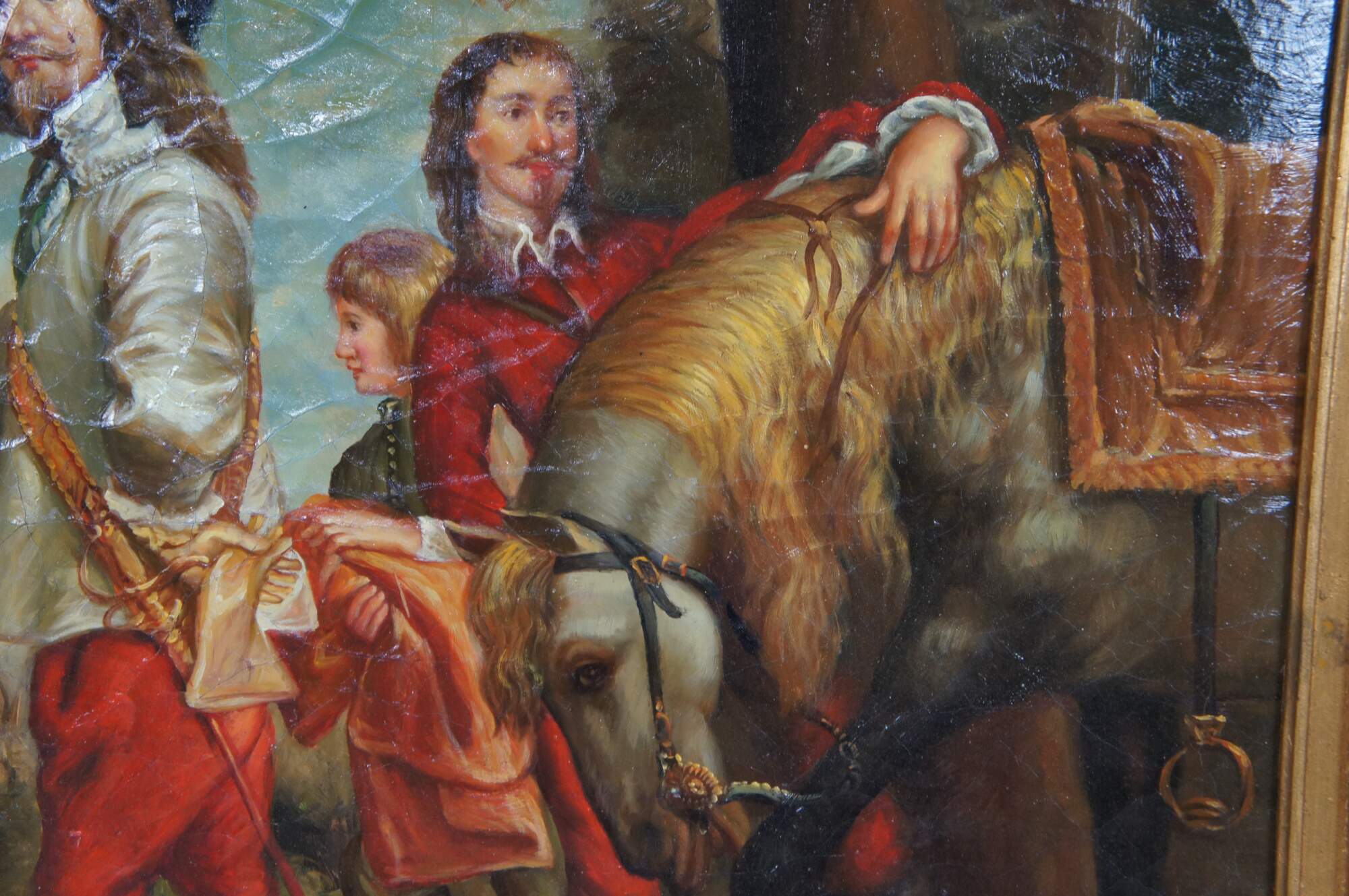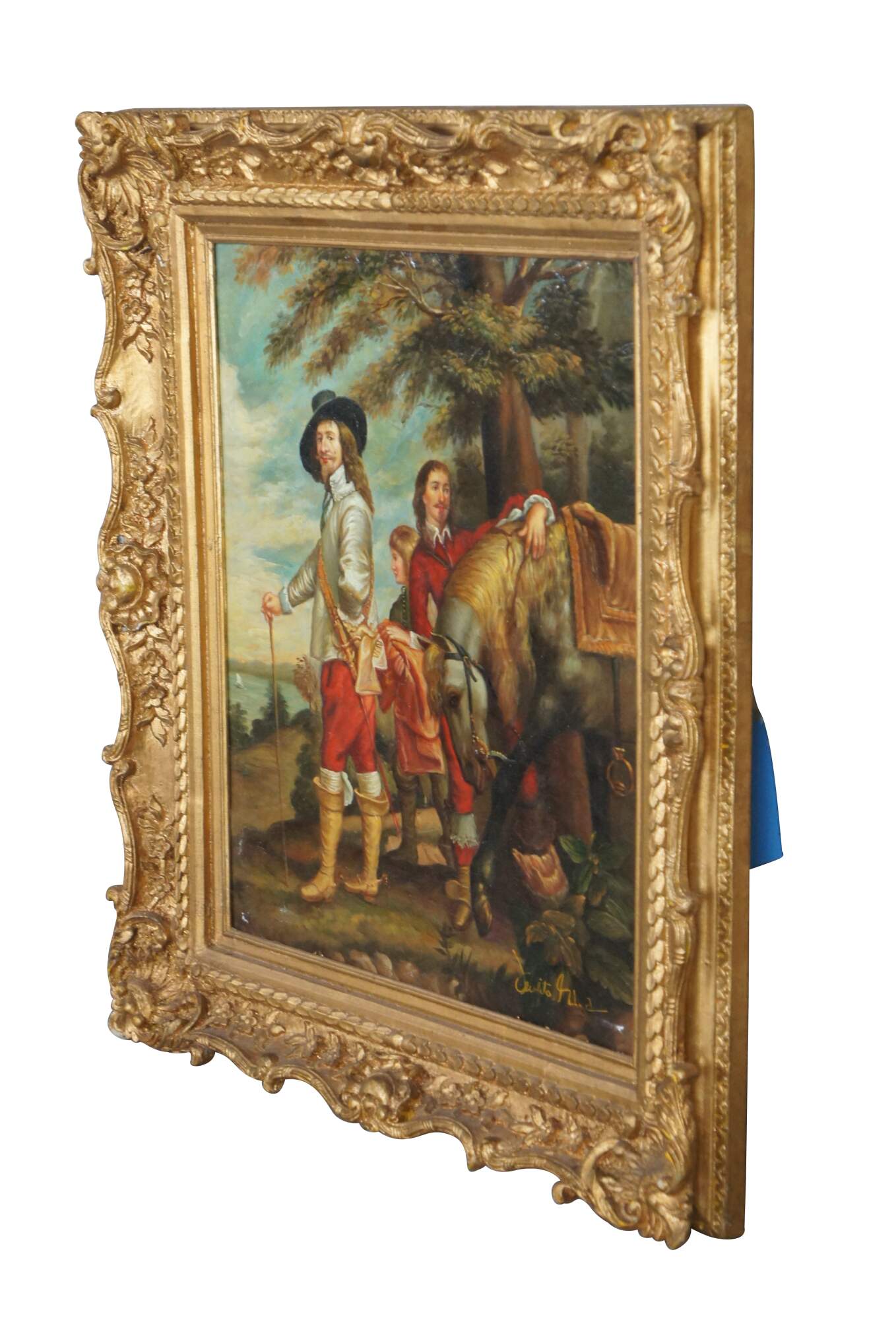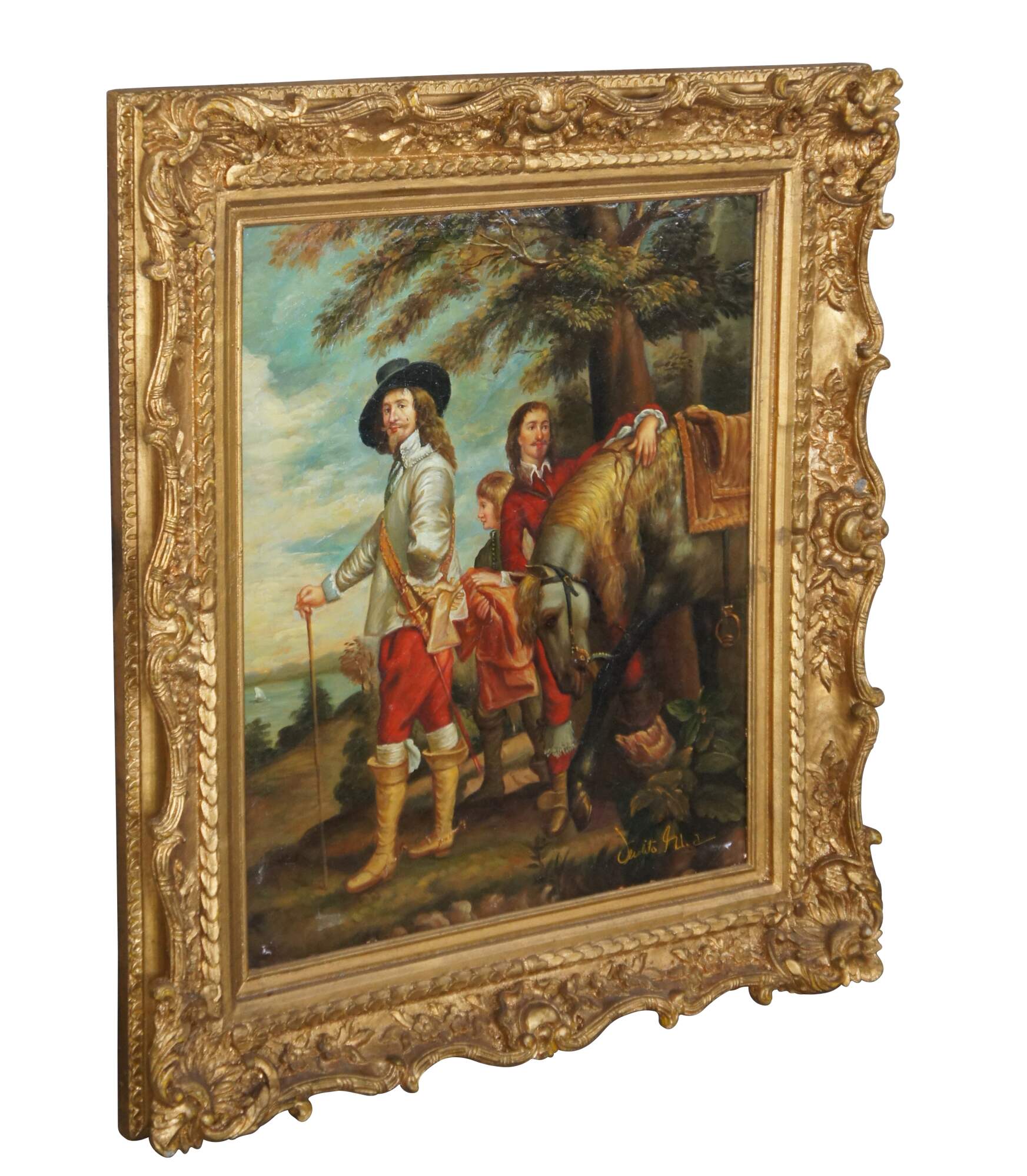 20th Century reproduction painting after the original hunting portait of Charles I done by Van Dyck in 1635. The original is on display at The Louvre. This painting was executed on canvas with Craquelure and signed lower right. The painting is framed in with with a baroque raised design and gold finish.