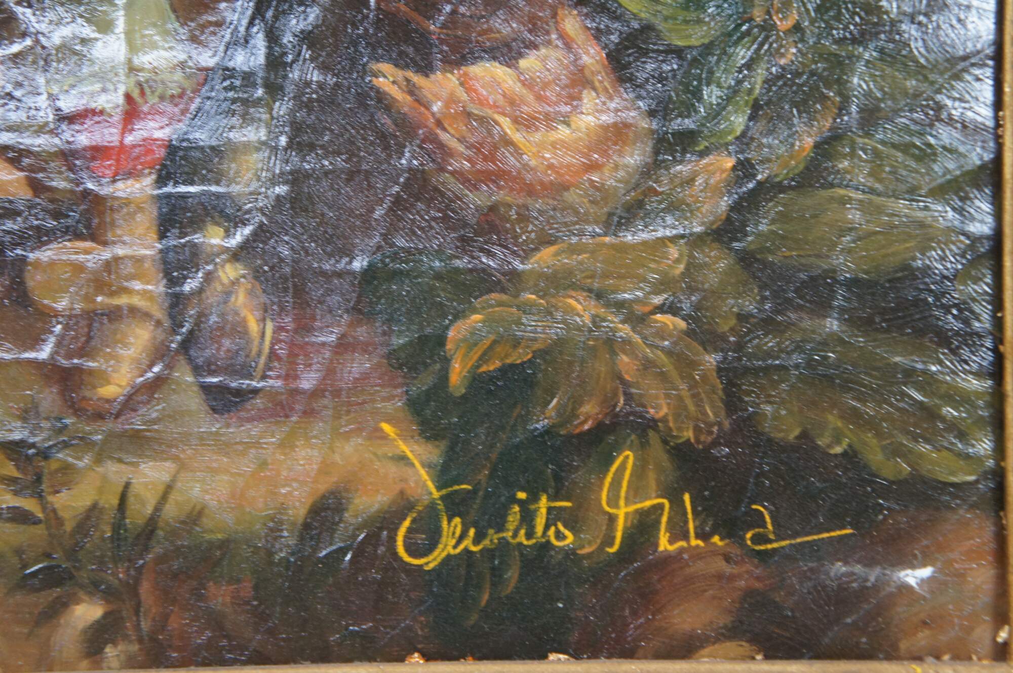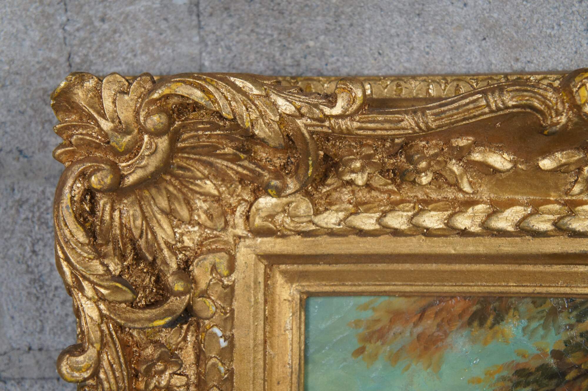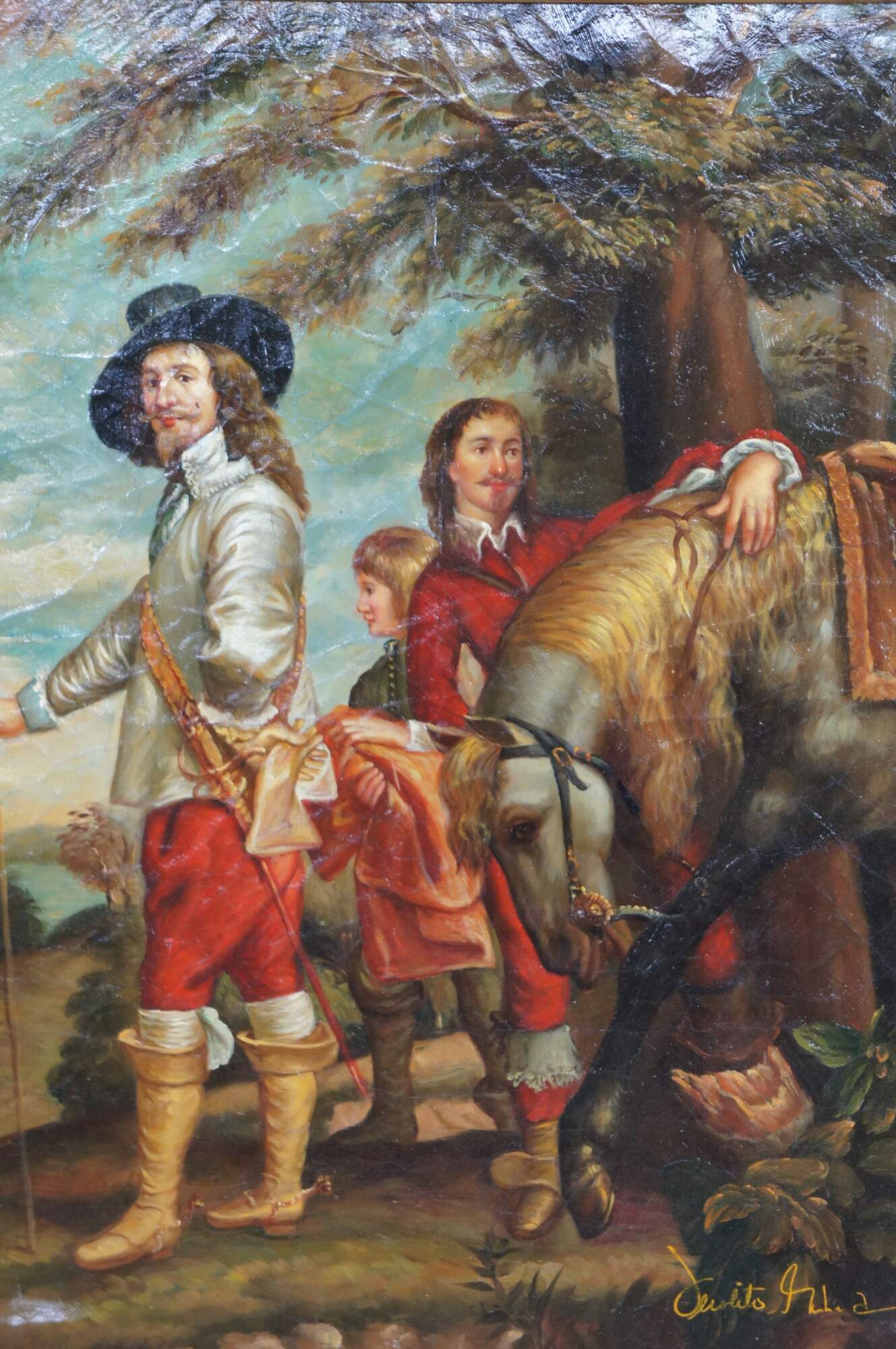20th Century reproduction painting after the original hunting portait of Charles I done by Van Dyck in 1635. The original is on display at The Louvre. This painting was executed on canvas with Craquelure and signed lower right. The painting is framed in with with a baroque raised design and gold finish.