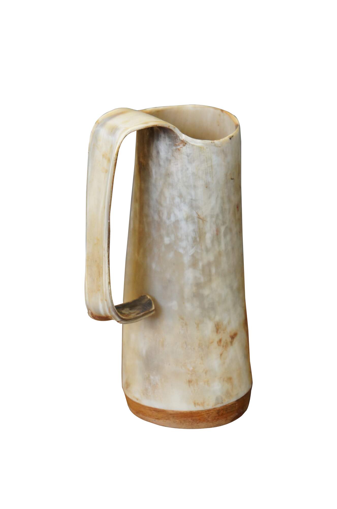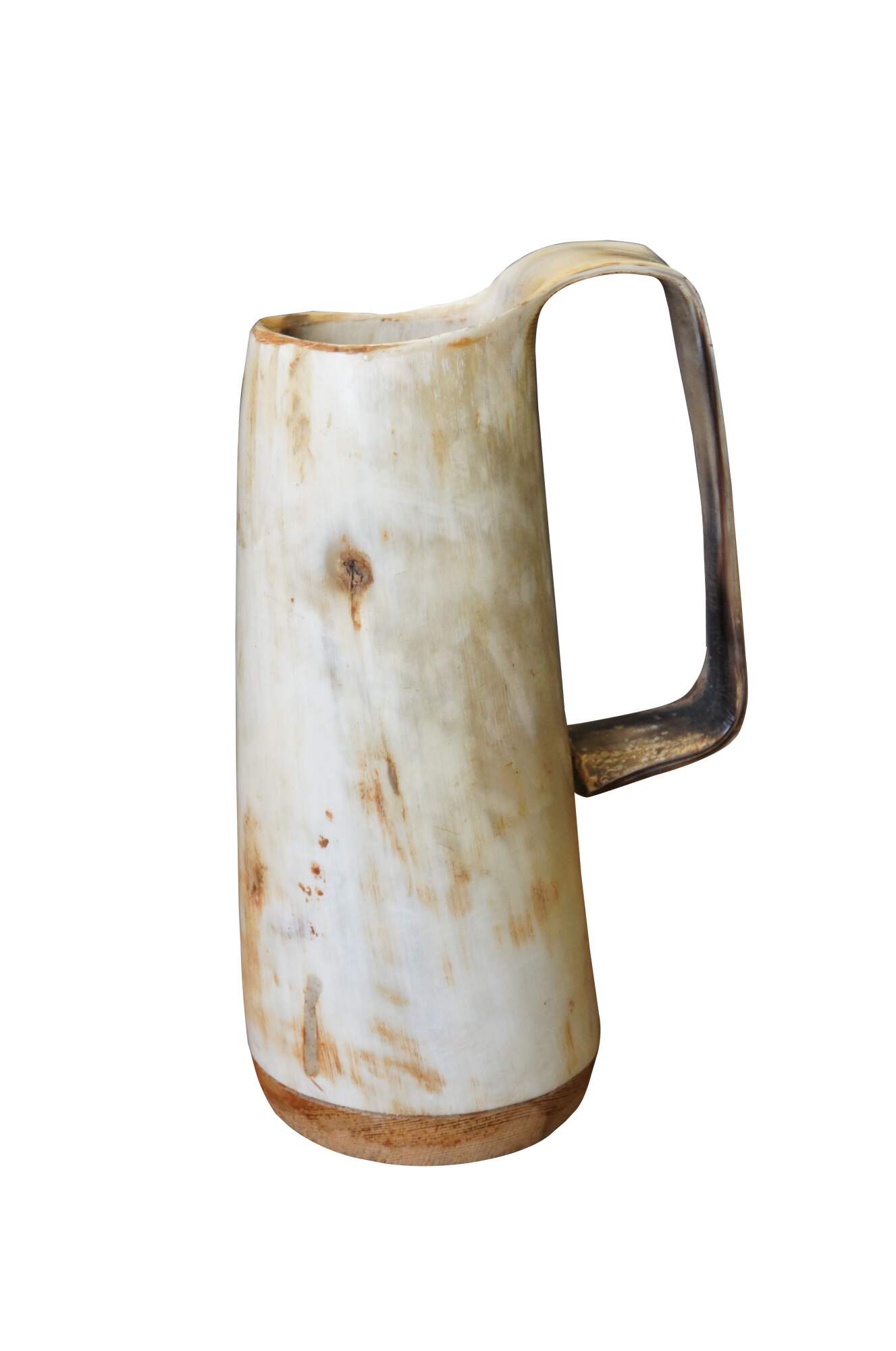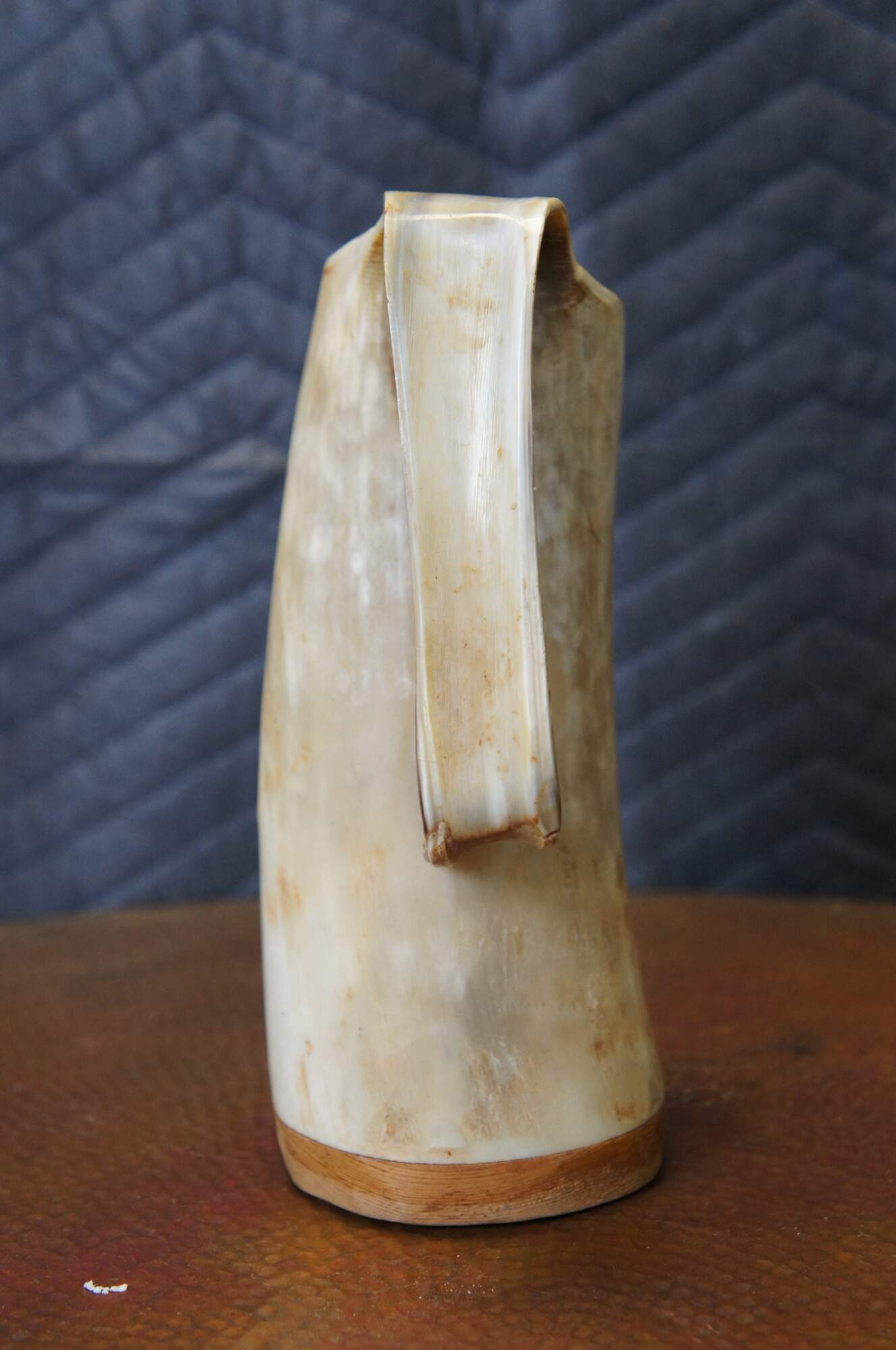 Late 20th century natural horn Viking / Renaissance Festival style drinking mug with resin coated wood base. Crafted by Handfaste. Made in Sweden.