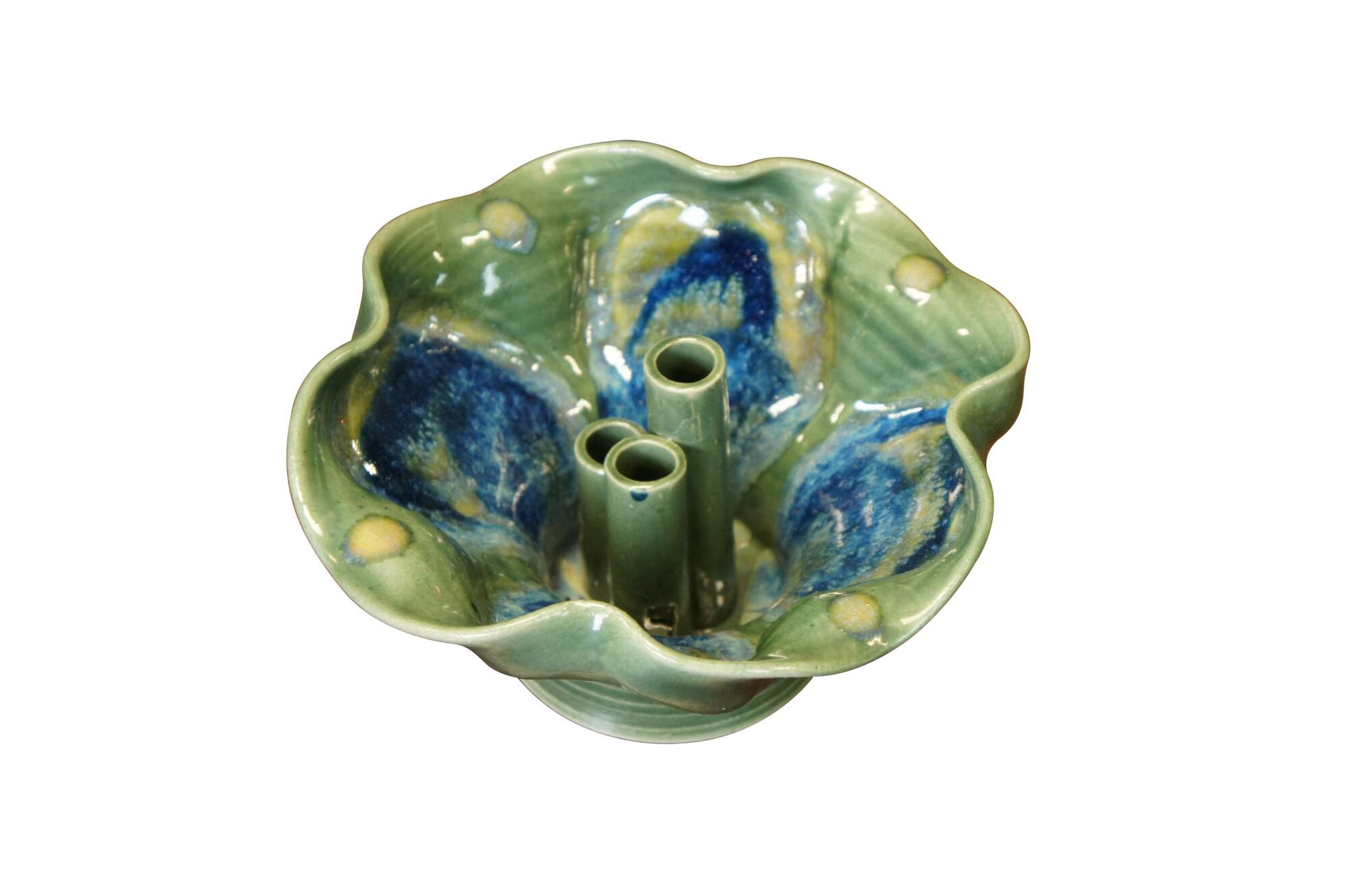 Late 20th century ceramic ikebana / flower bowl featuring a ruffled flower shaped upper edge and three flower frogs / tubes fixed at the center, with holes at the base for water to reach the flowers. Glazed in green, blue and yellow. Ikebana is the Japanese art of floral arrangment.