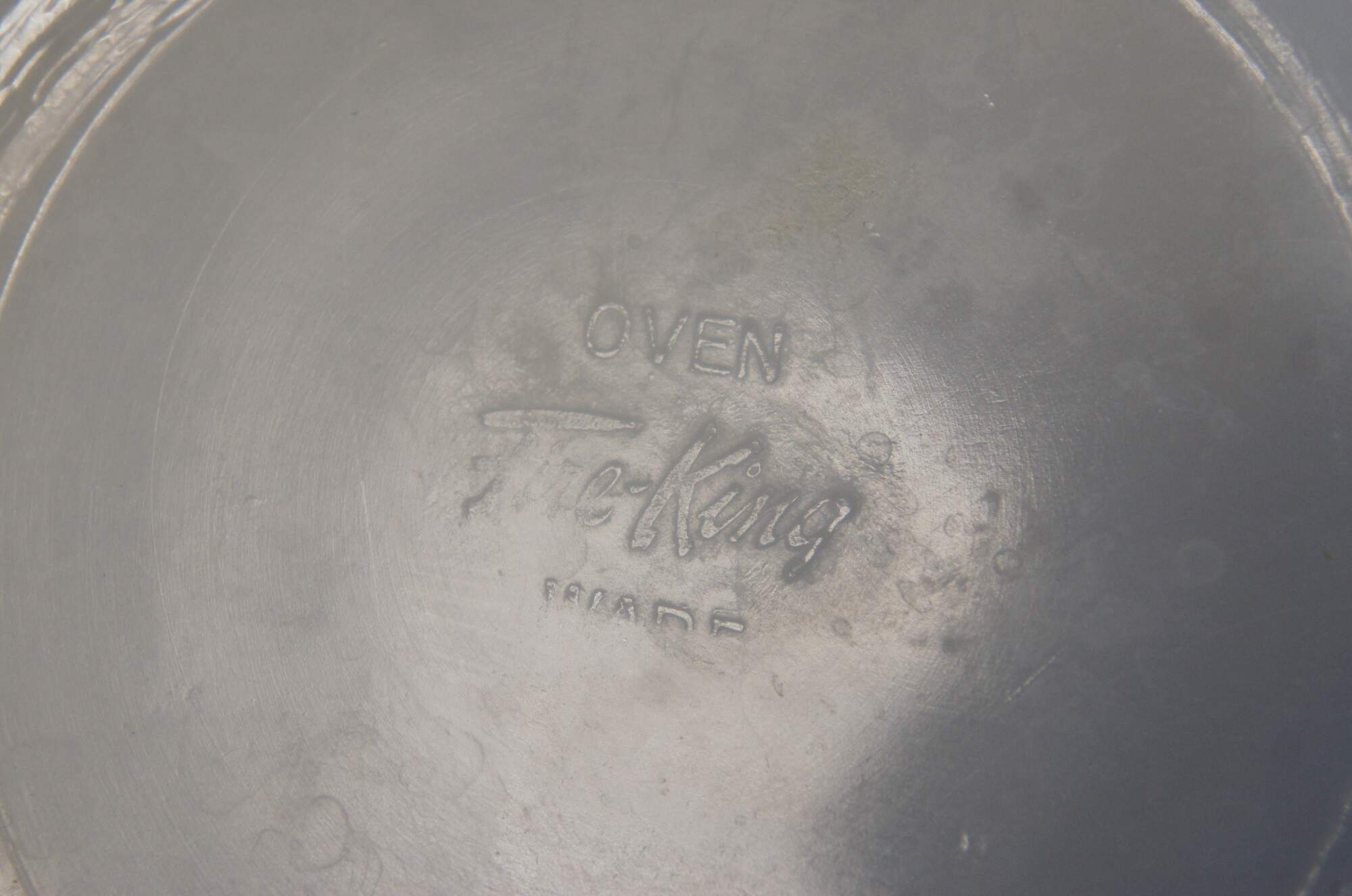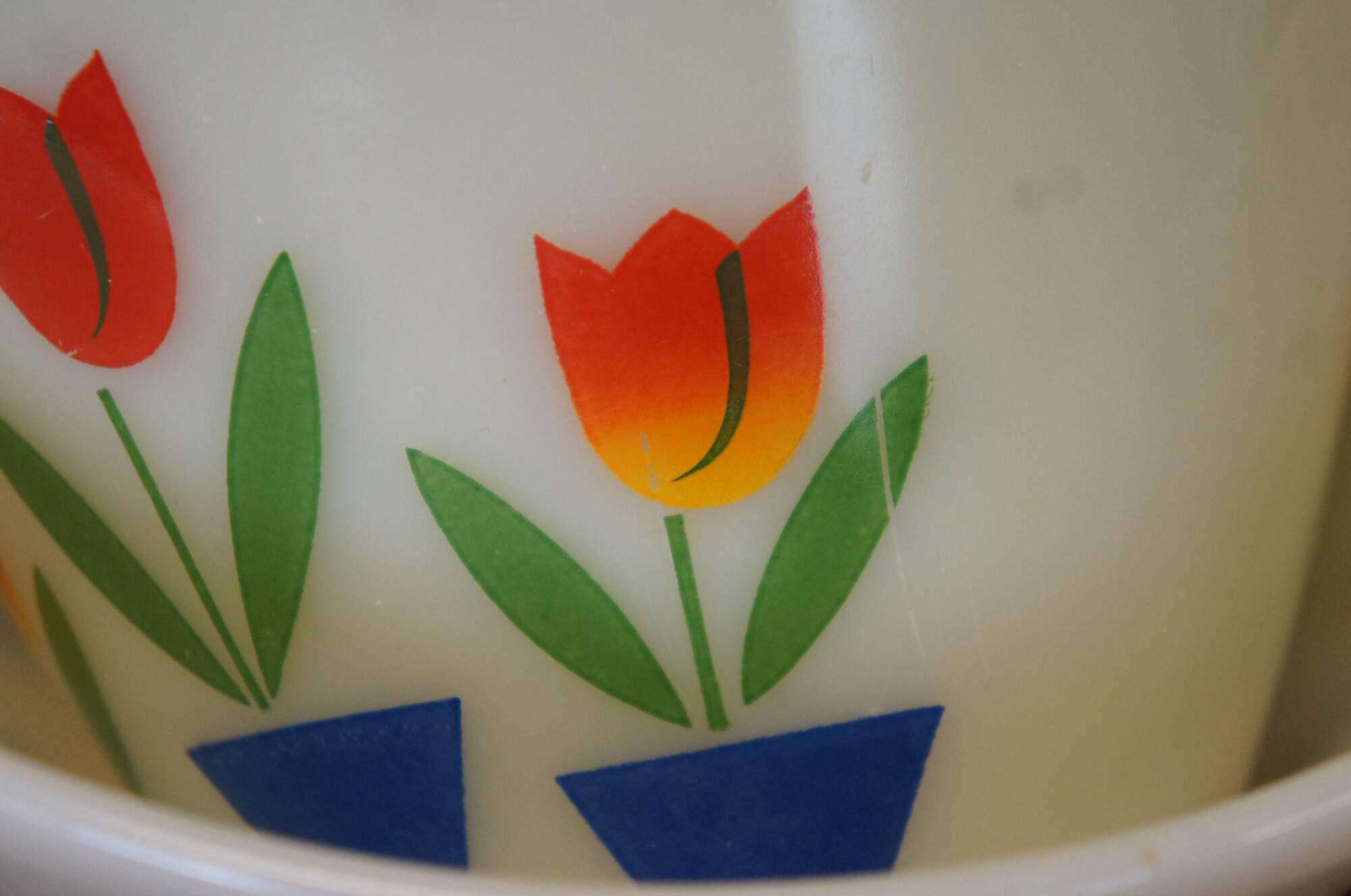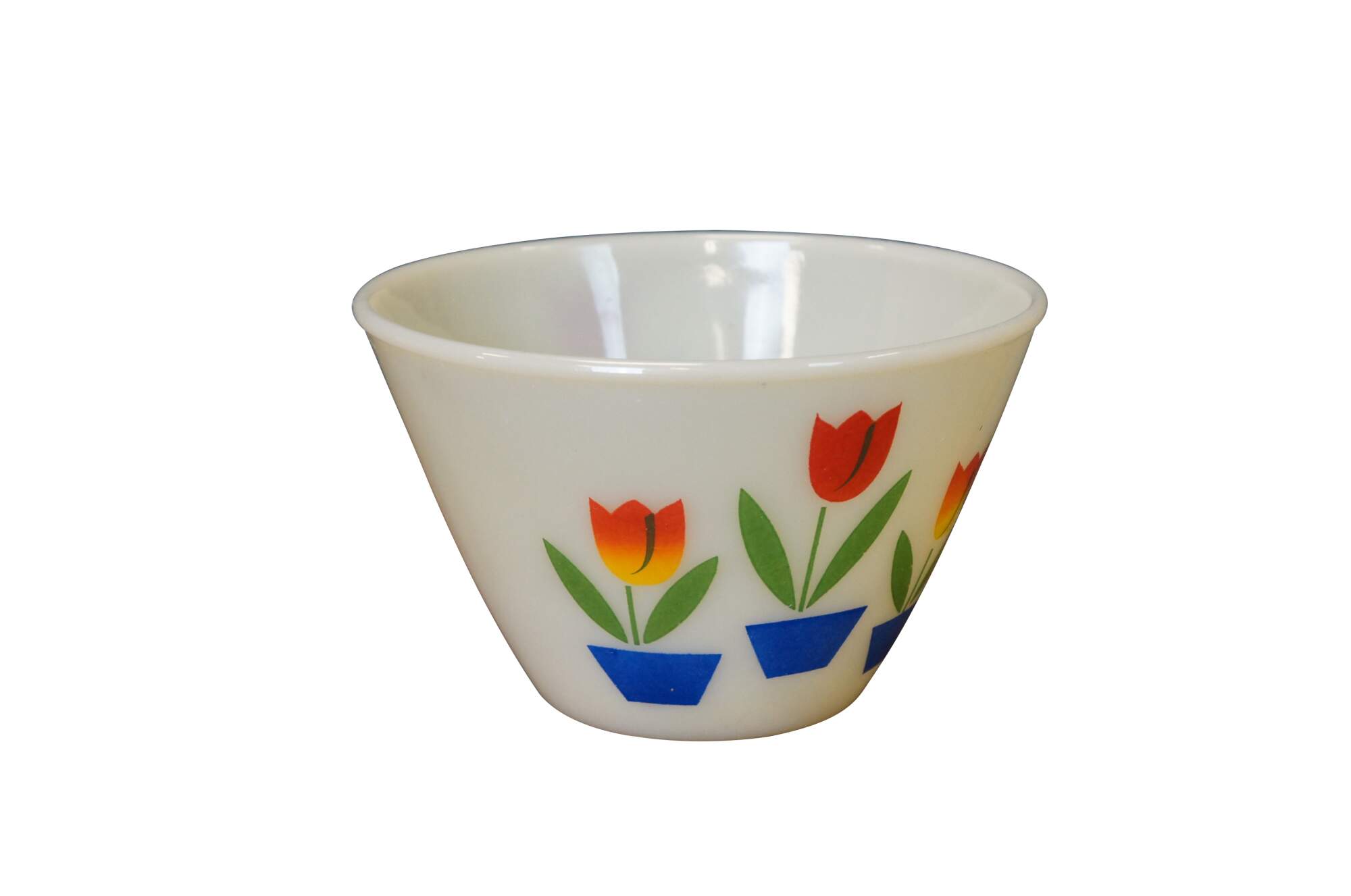 Pair of mid 20th century Fire-King Oven Ware nesting mizing bowls by Anchor Hocking. Conical shape of off white semi-translucent glass, printed with a pattern of primary color red and orange tulips in little blue pots. Produced circa 1948-1950 (Dating: https://firekinggrill.com/fireking-jadeite-dish-markings/#google_vignette)