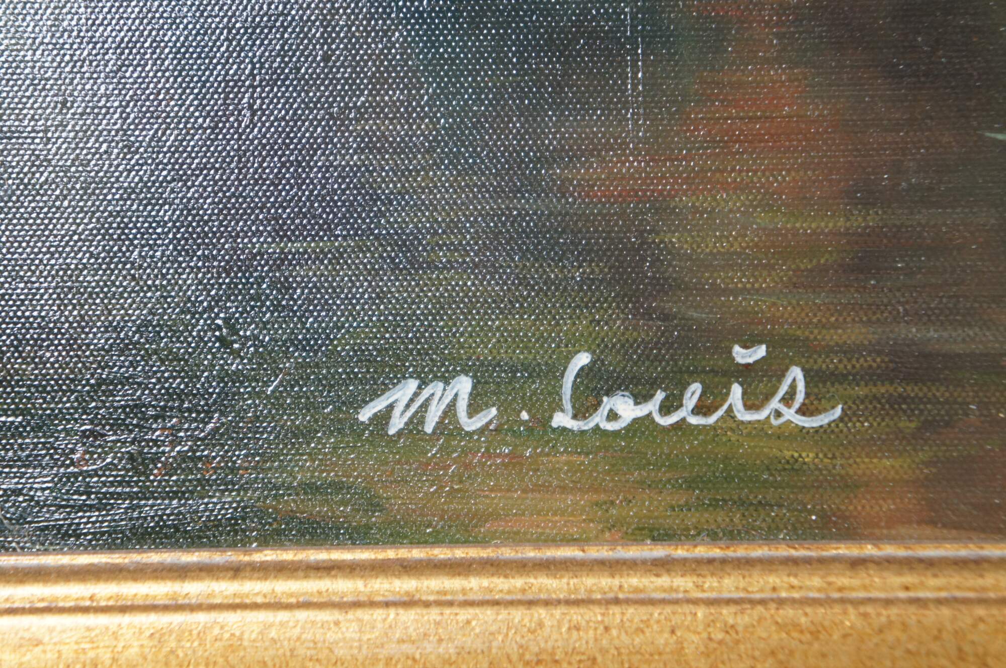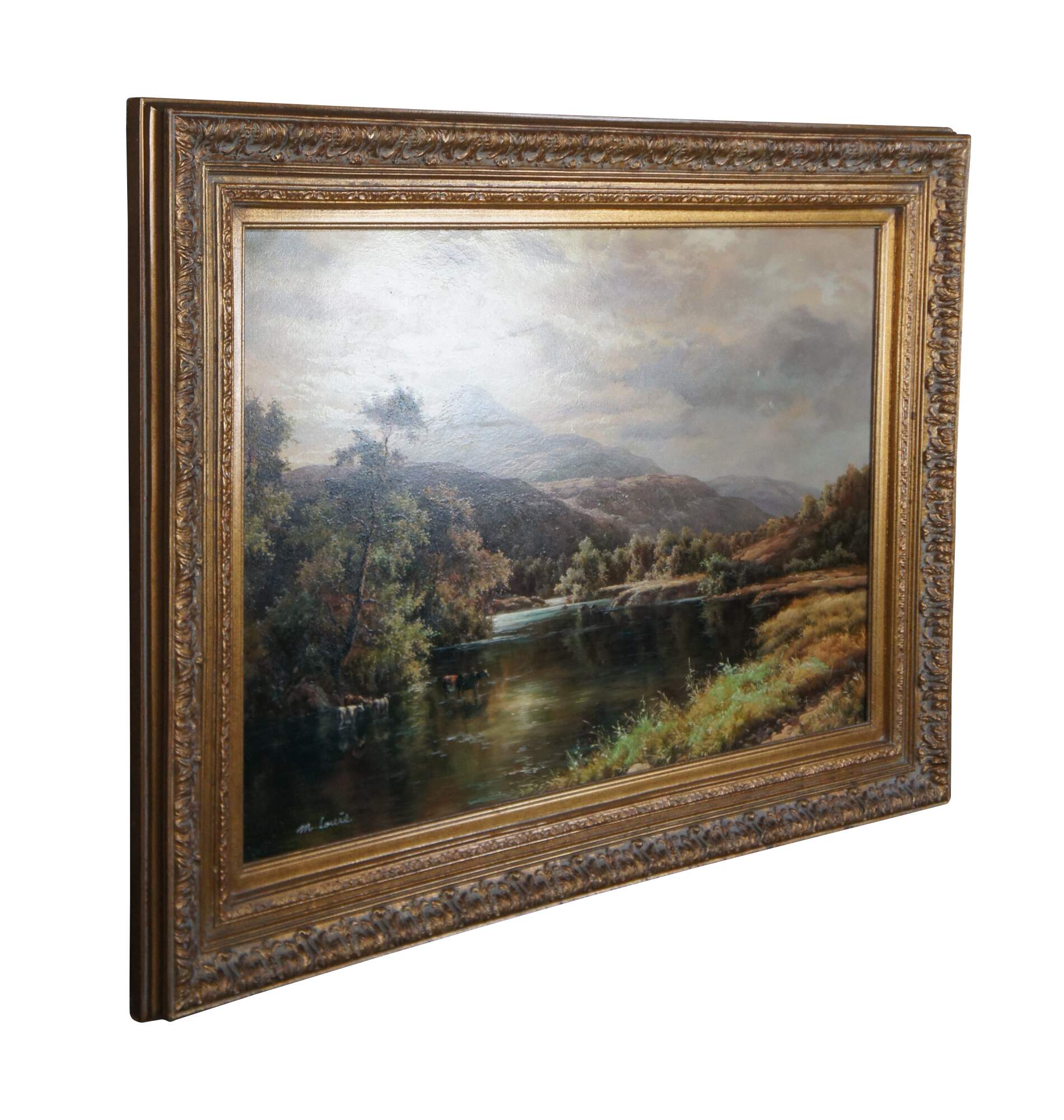 Late 20th Century Pastoral River landscape. Signed lower left. Features a woodland view of the countryside with cattle relaxing in the river infront of a mountainous backdrop. The oil painting is on canvas and signed M. Louis along the lower left. Features a trodational frame finished in gold with acanthus detail.