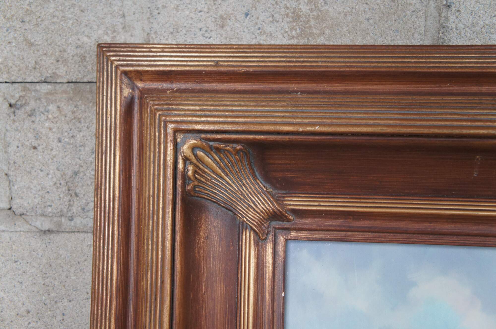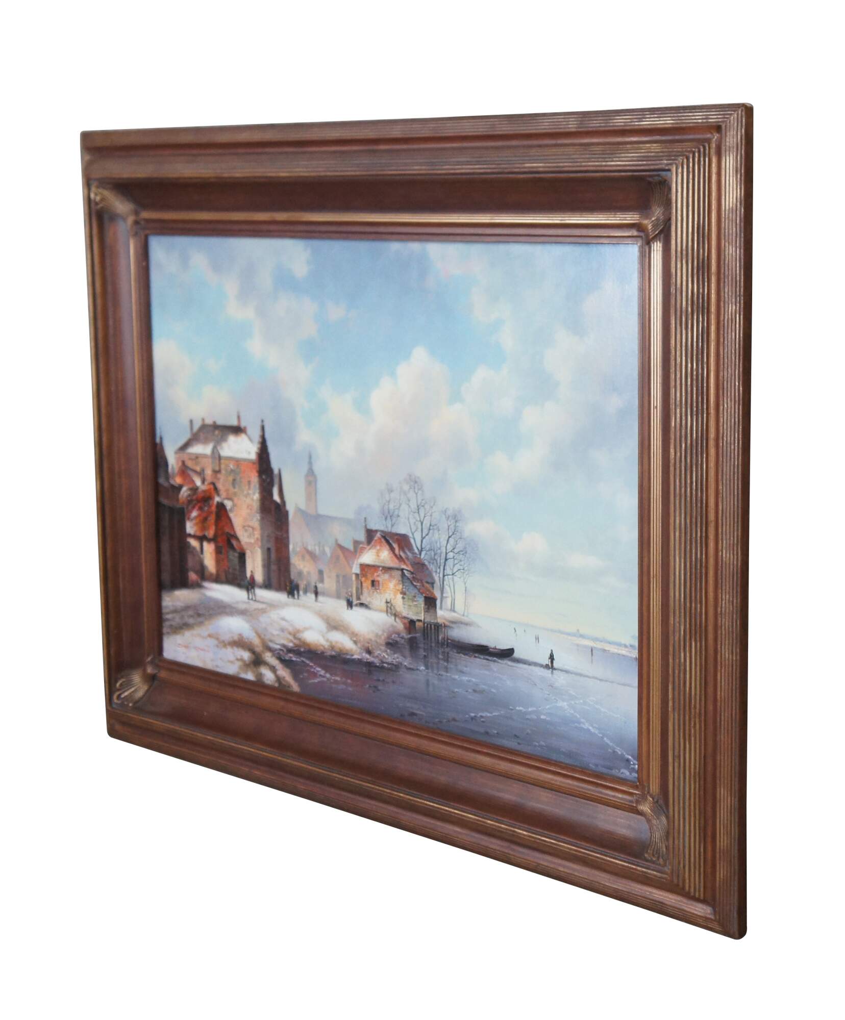 20th Century Dutch oil painting on canvas by David Ronald, signed lower left. The painting showcases a coastal village or town in winter. Figures can be seen playing over the frozen water and within the town. Framed in wood with ribbed accents.