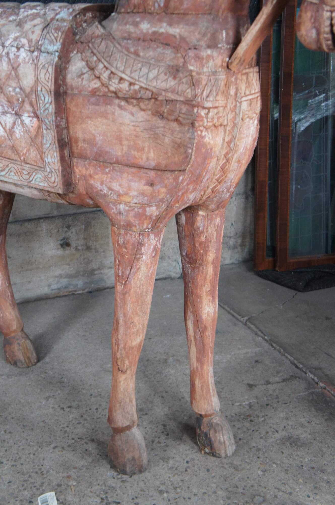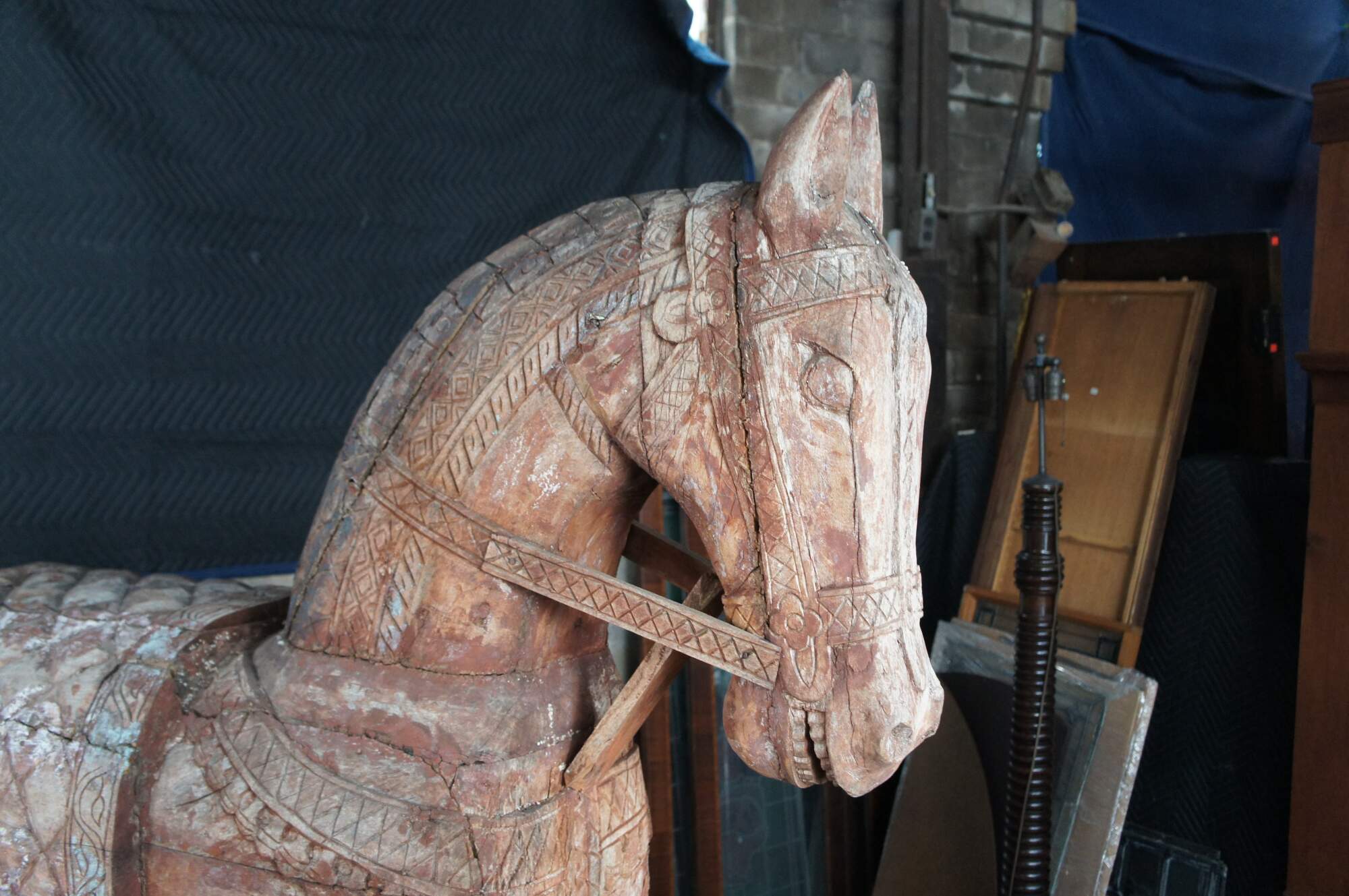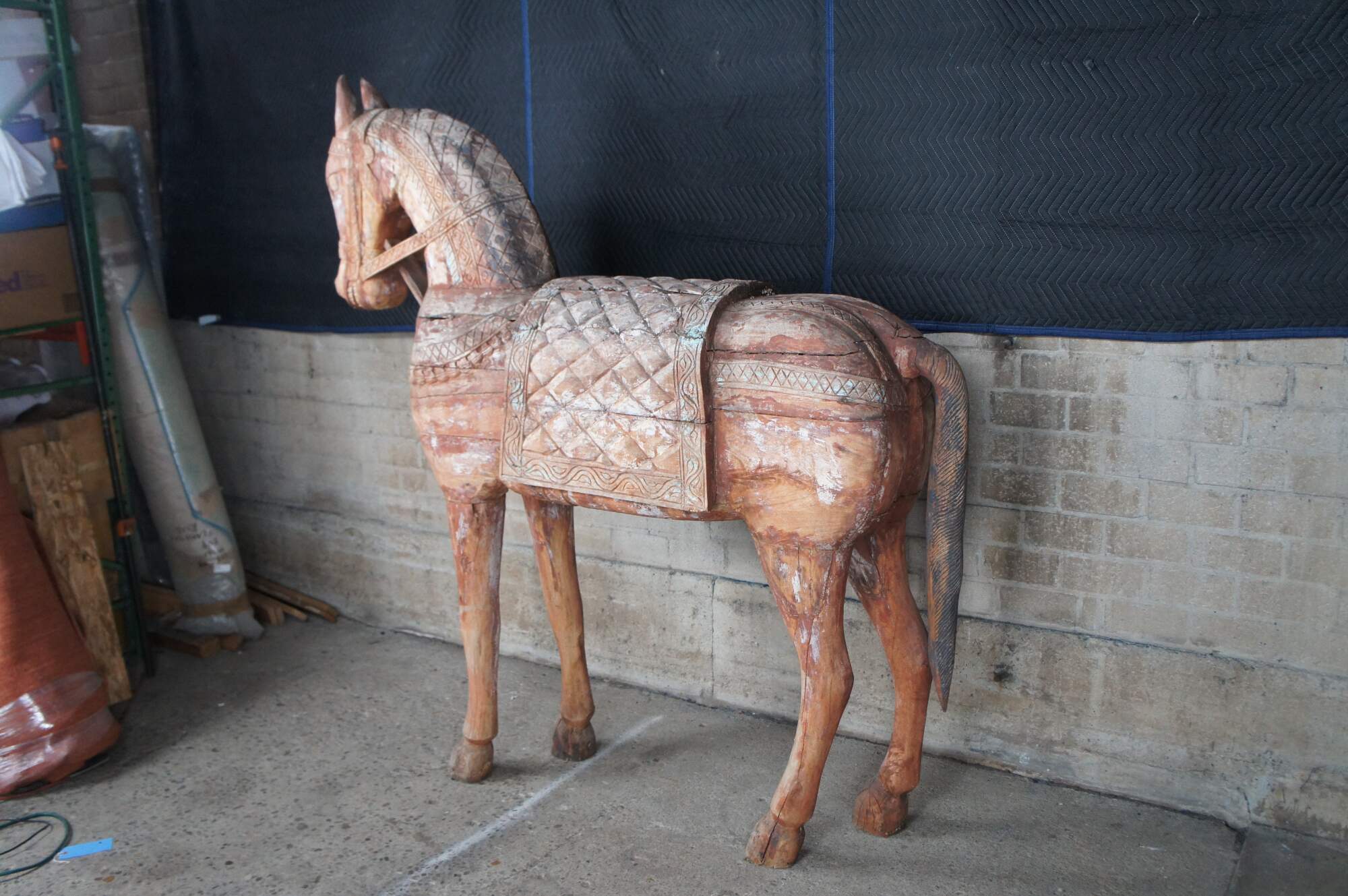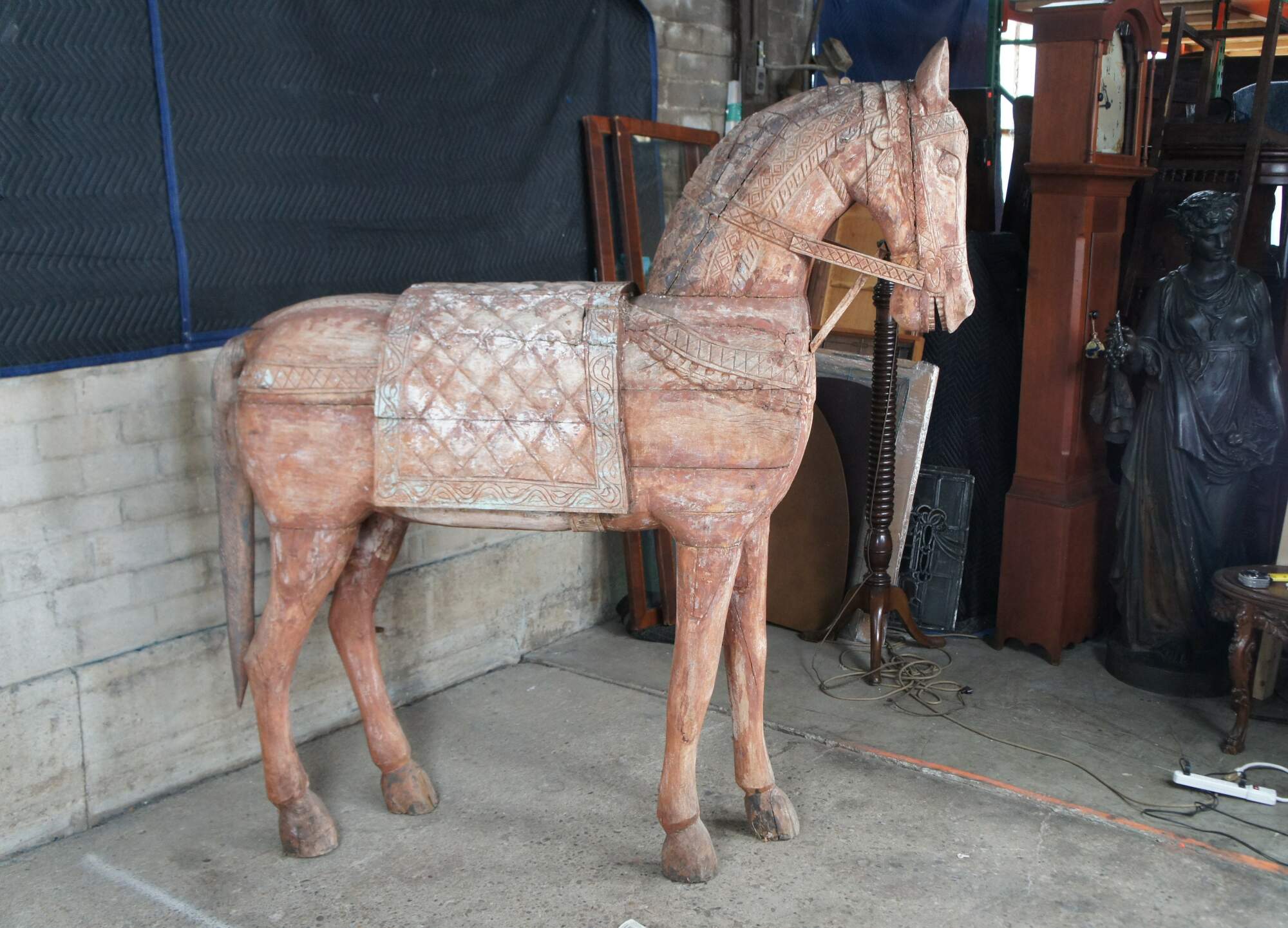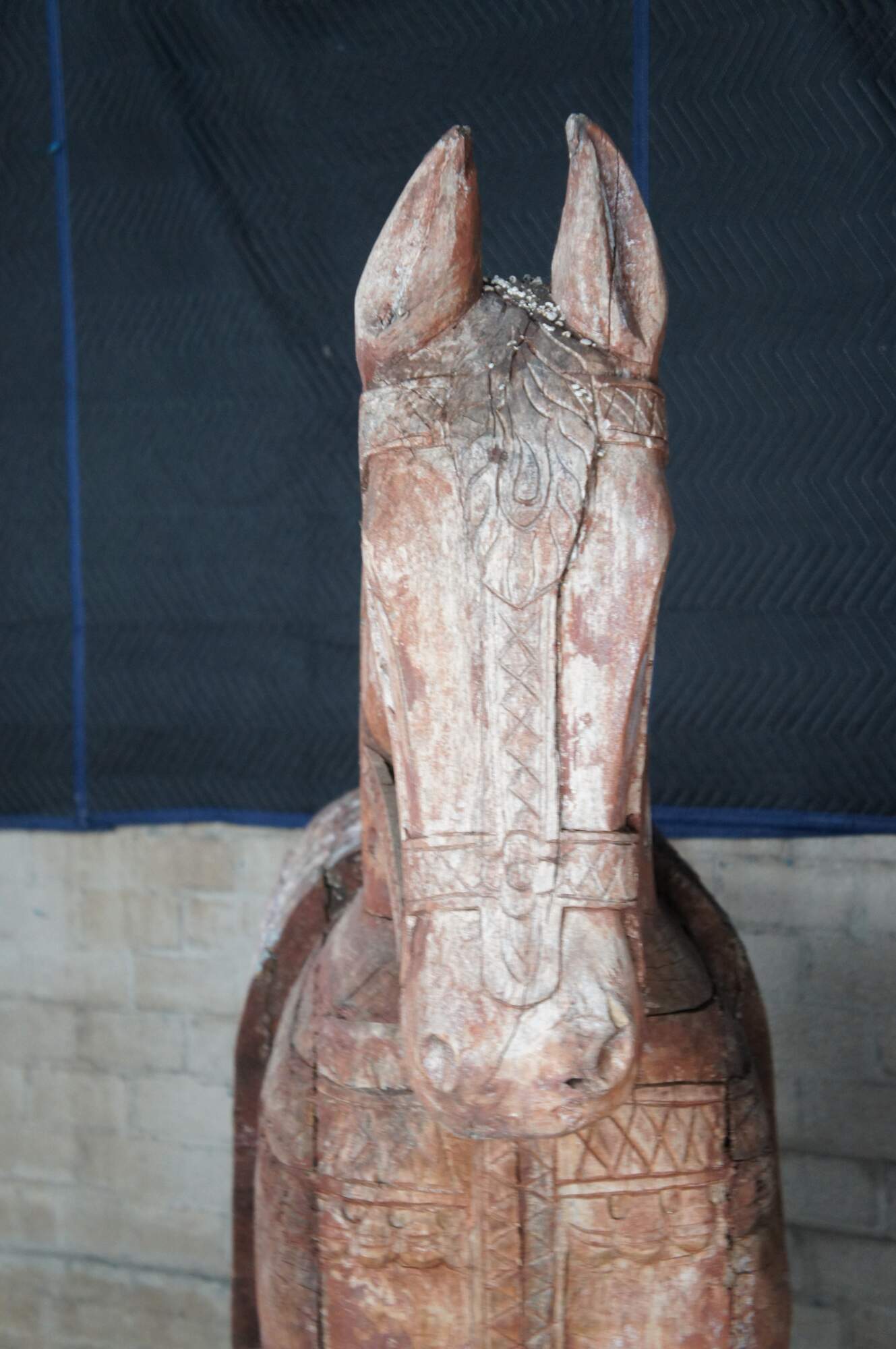 Very impressive pair of vintage lifesize horse sculptures or statues. Made of wood featuring a primitive / rustic asian design. Very heavy and sturdy.