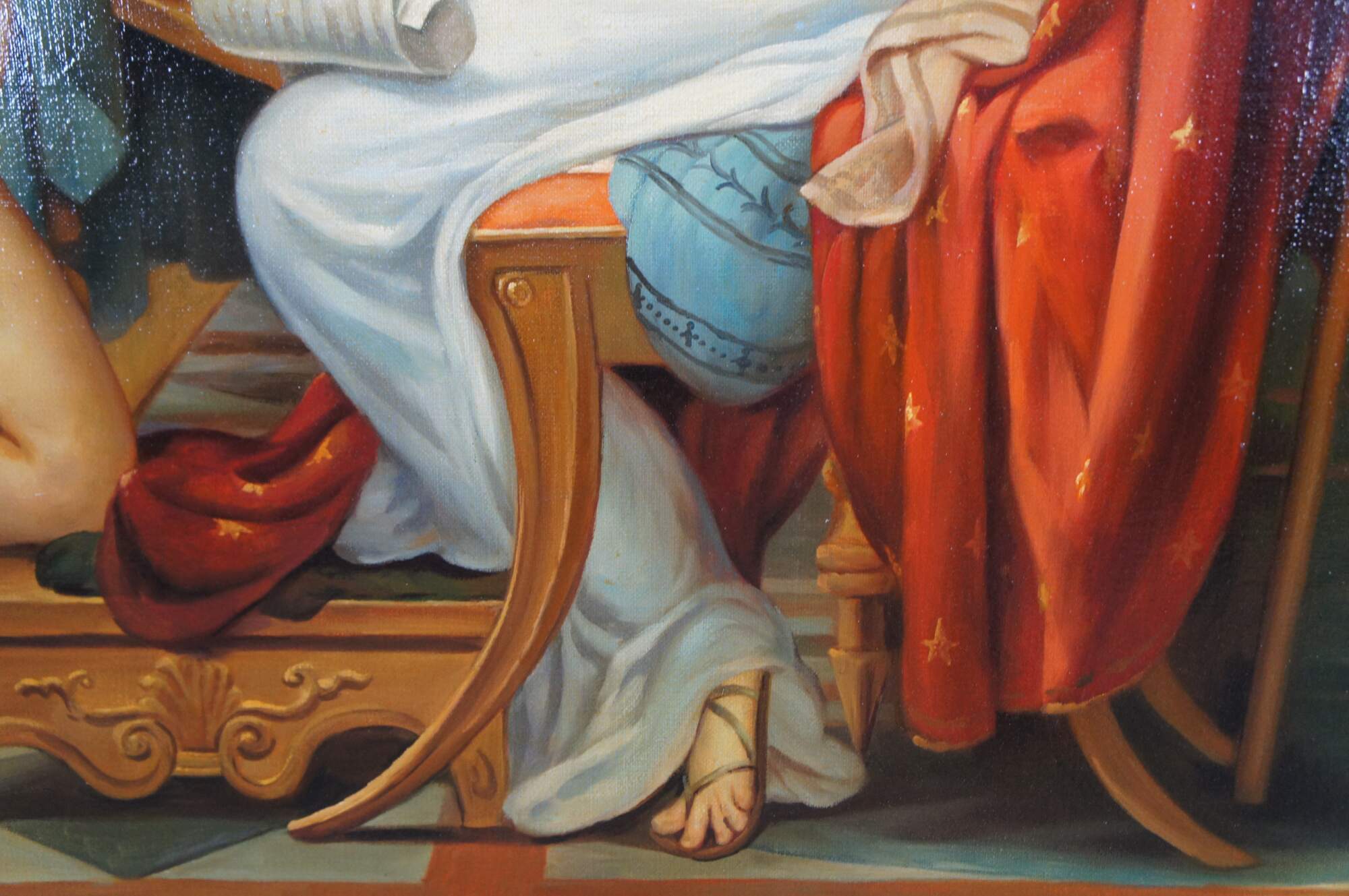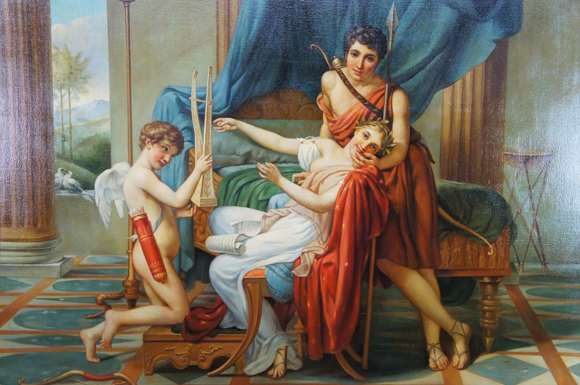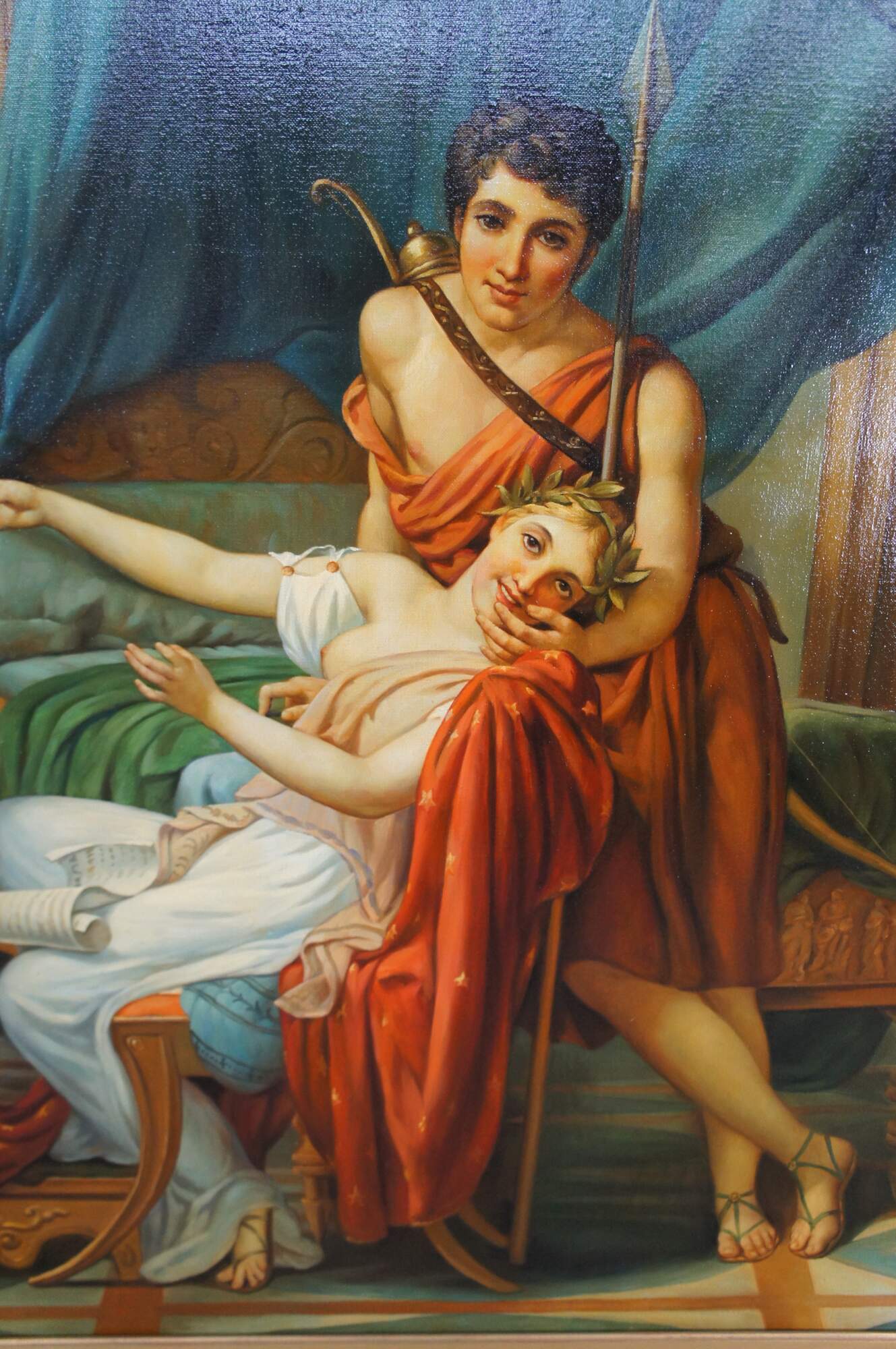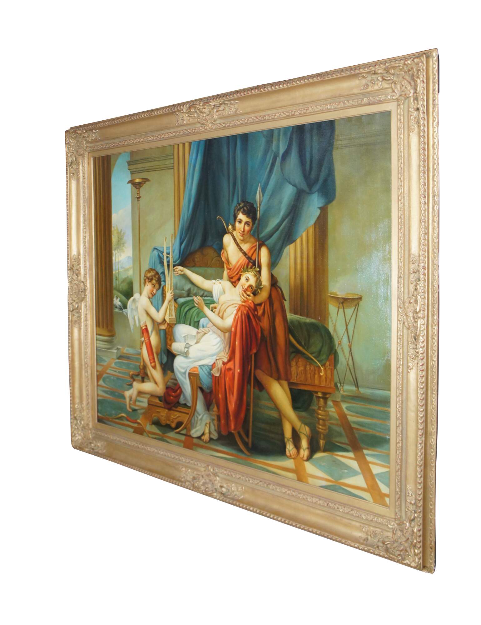 A Monumental contemporary school painting of "Sappho and Phaon" After Jacques-Louis David. The oil is on canvas and framed in gold with French relief.