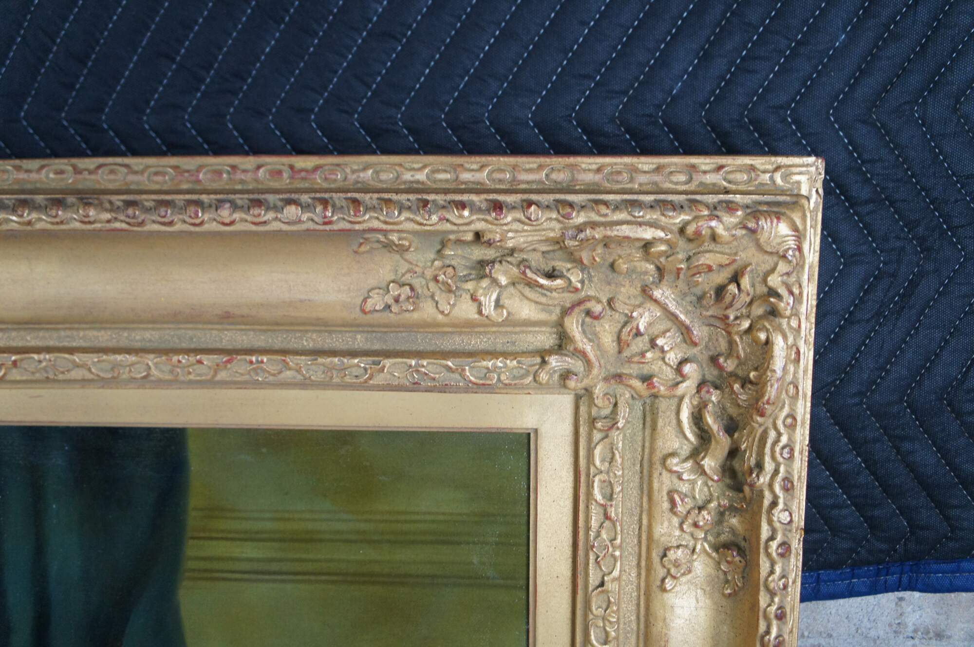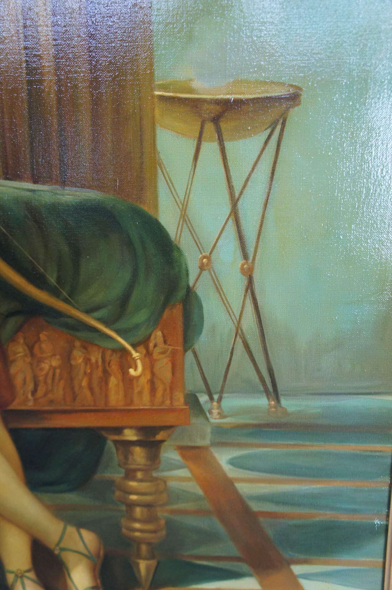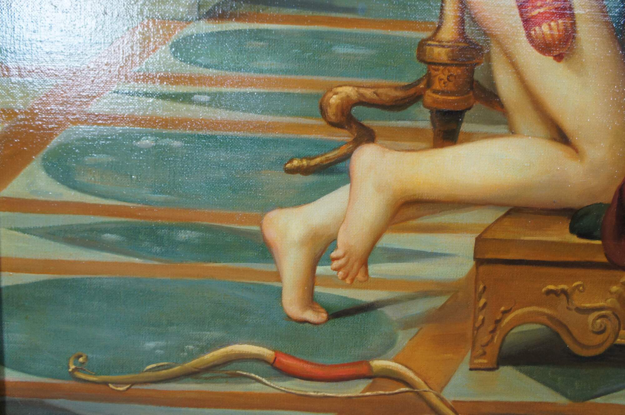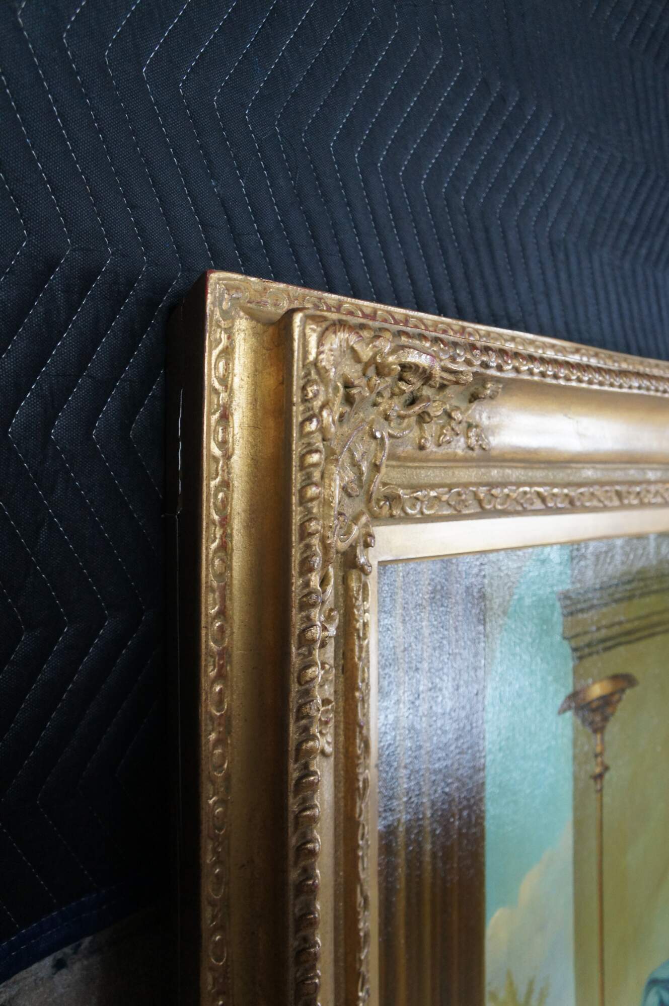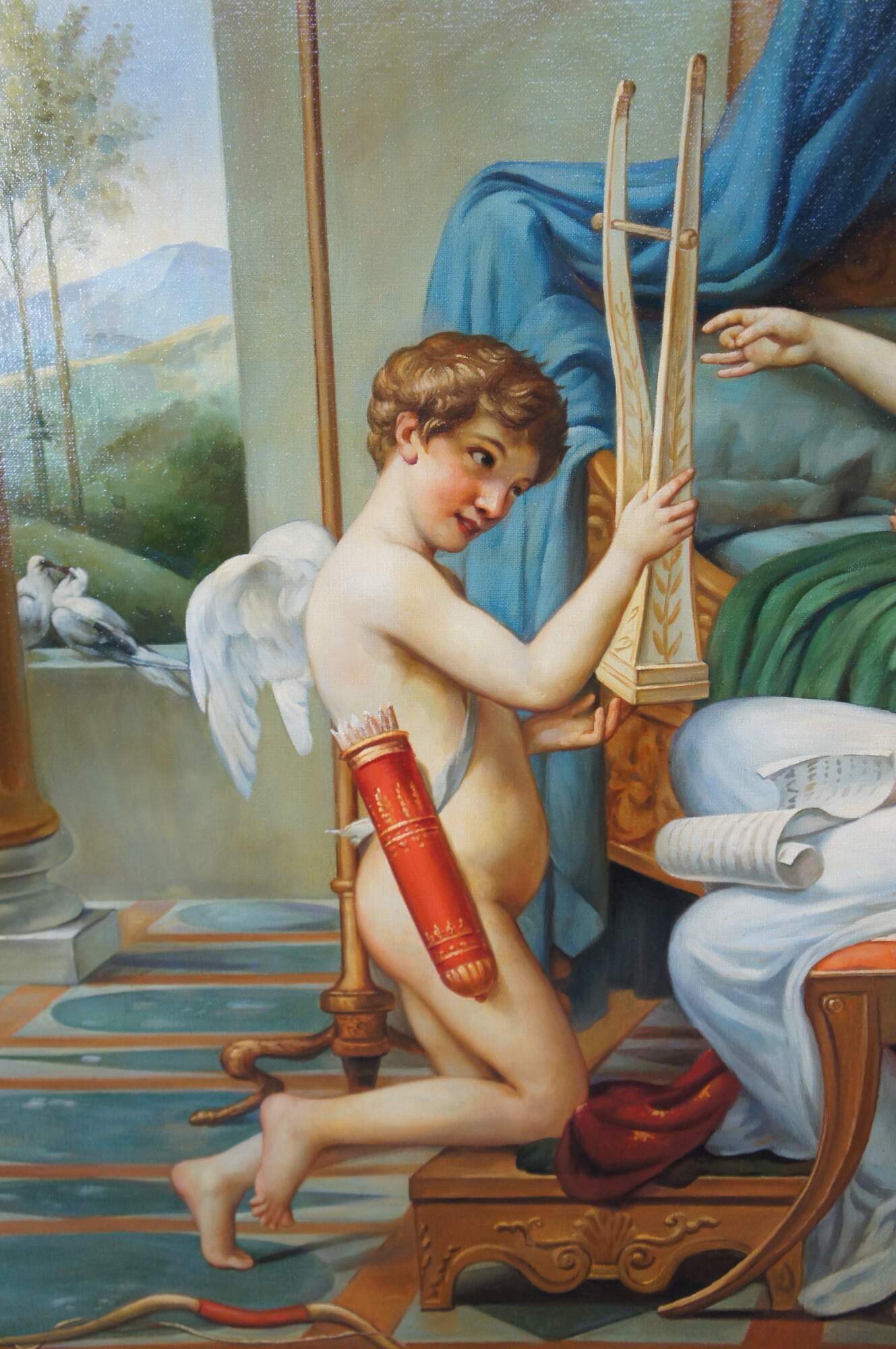 A Monumental contemporary school painting of "Sappho and Phaon" After Jacques-Louis David. The oil is on canvas and framed in gold with French relief.