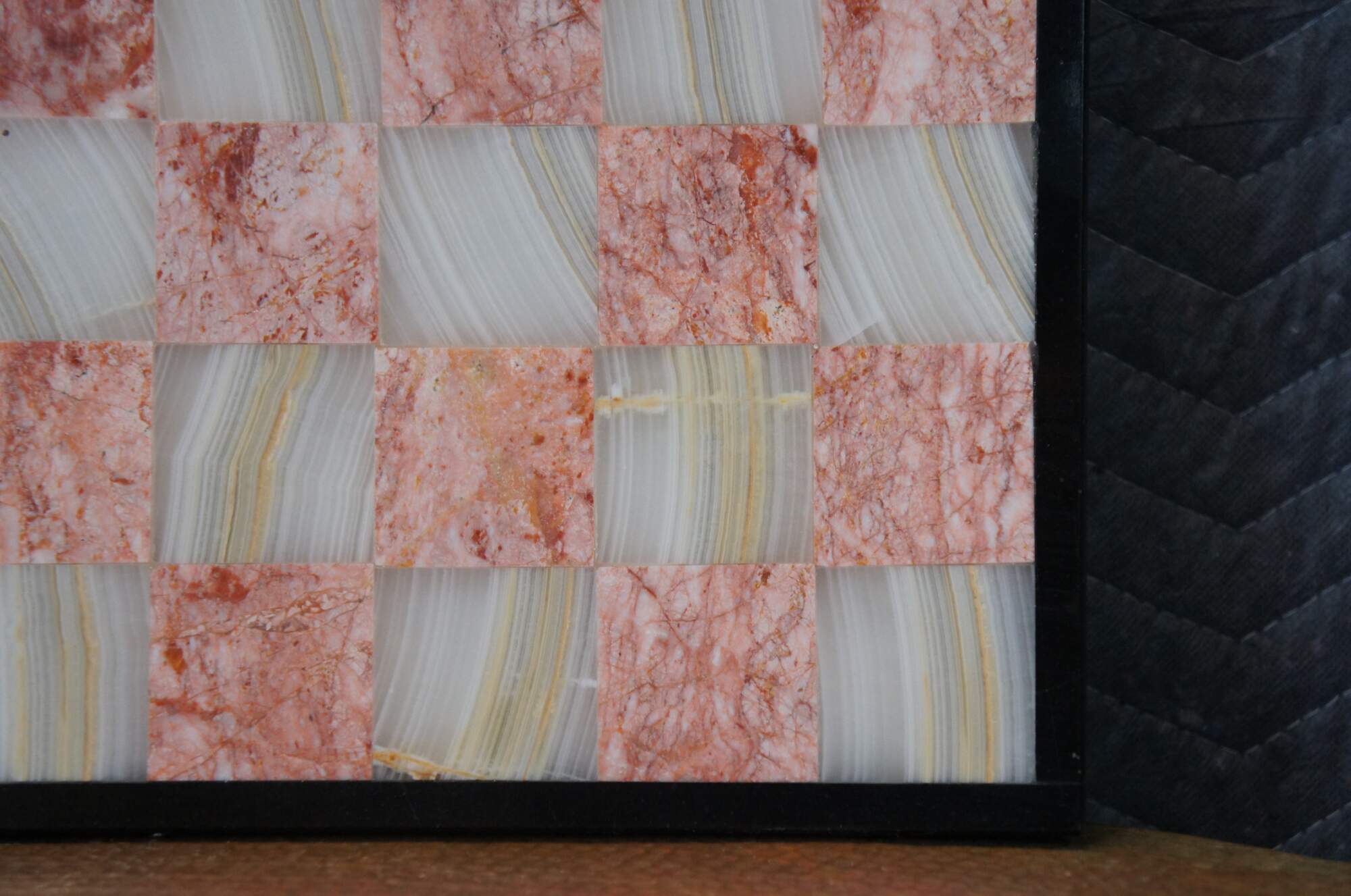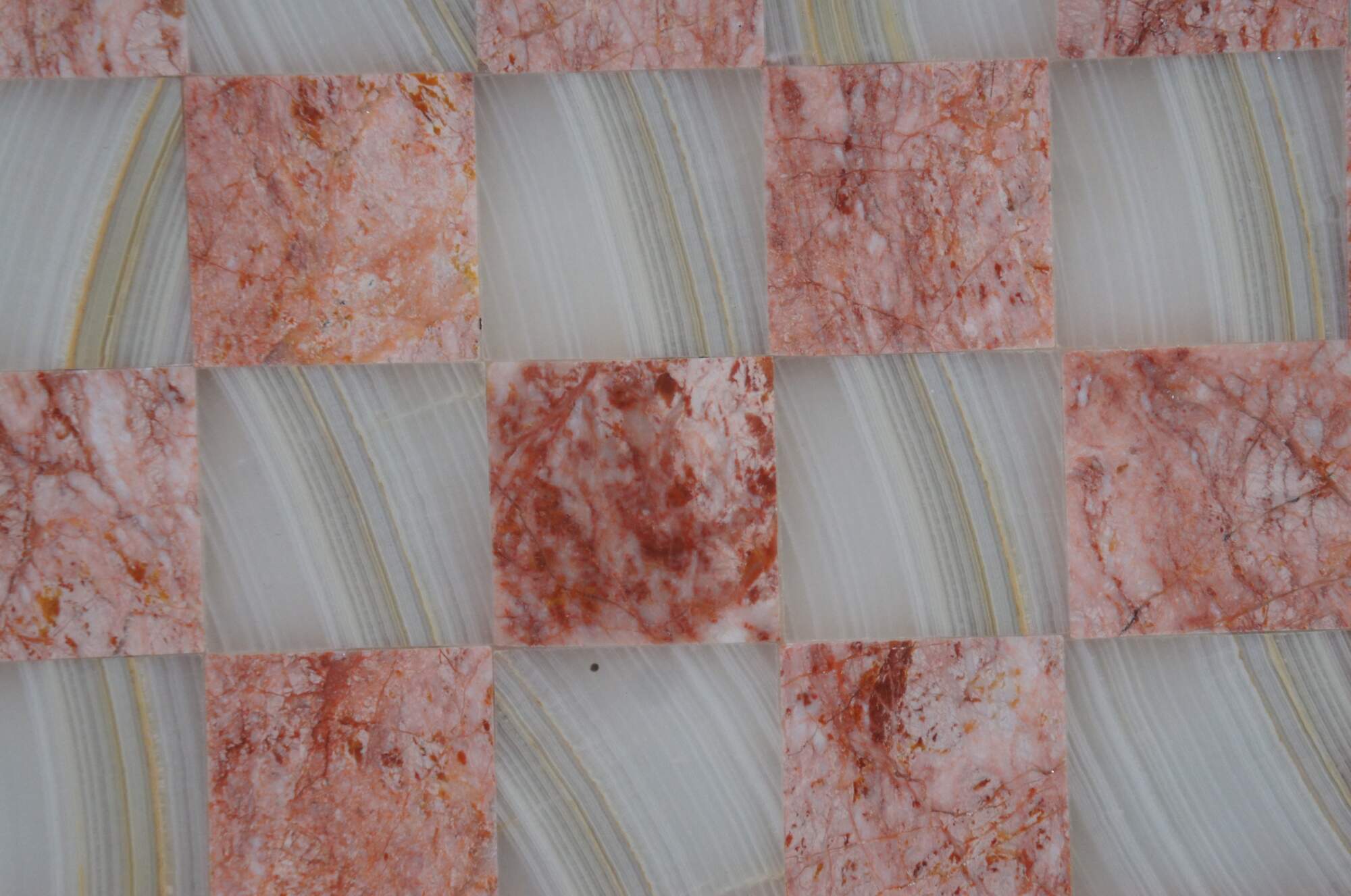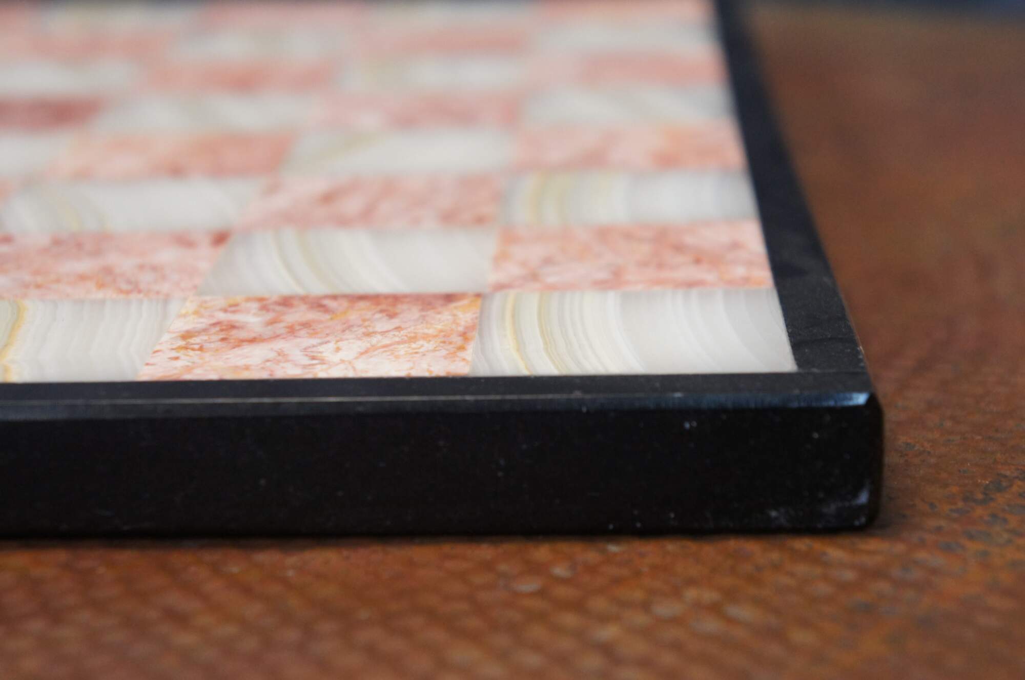 Late 20th century inlaid marble / onyx / quartz / granite chess / checker / game board. Rose pink and ivory white grid with black border.
