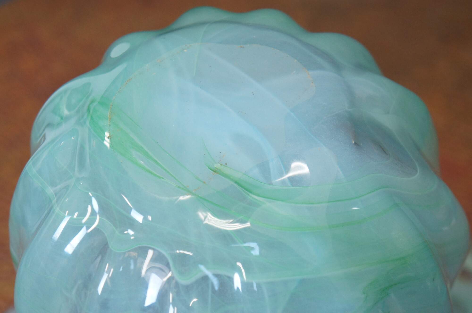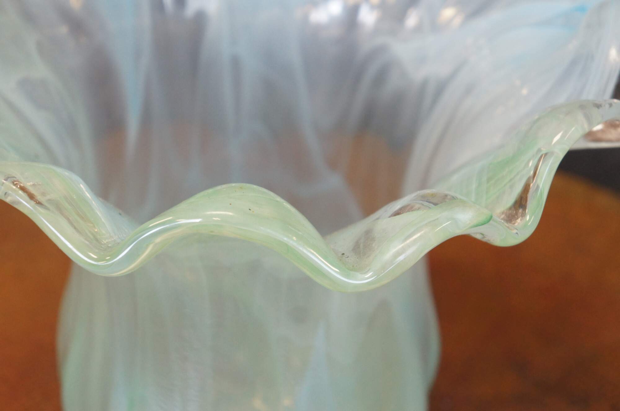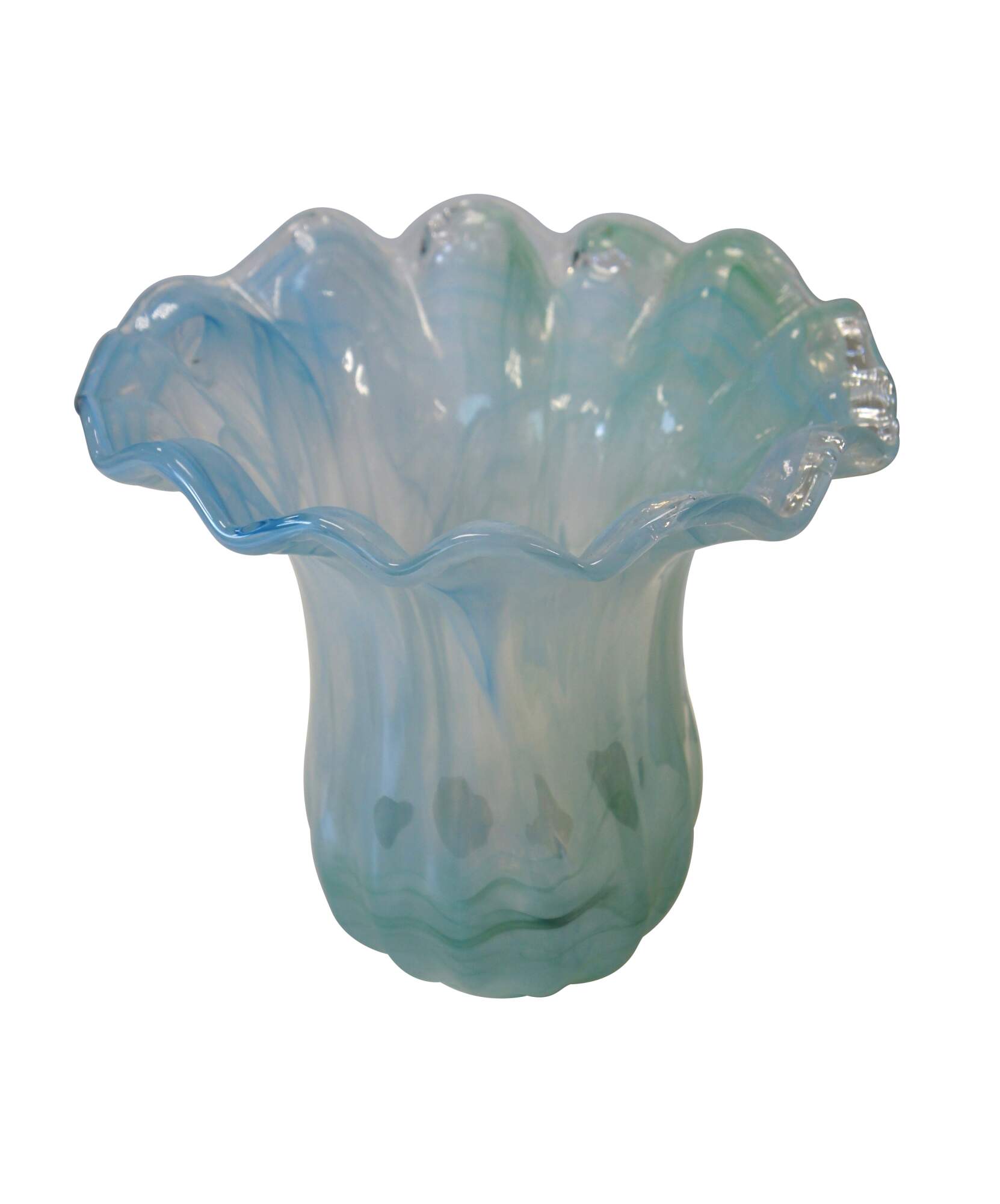 Mid to late 20th century Lavorazione Arte Murano hand blown art glass vase or centerpiece. Features a ridged / fluted surface and a wide ruffled rim; clear glass with translucent swrils of pale blue and green. Polished pontil.