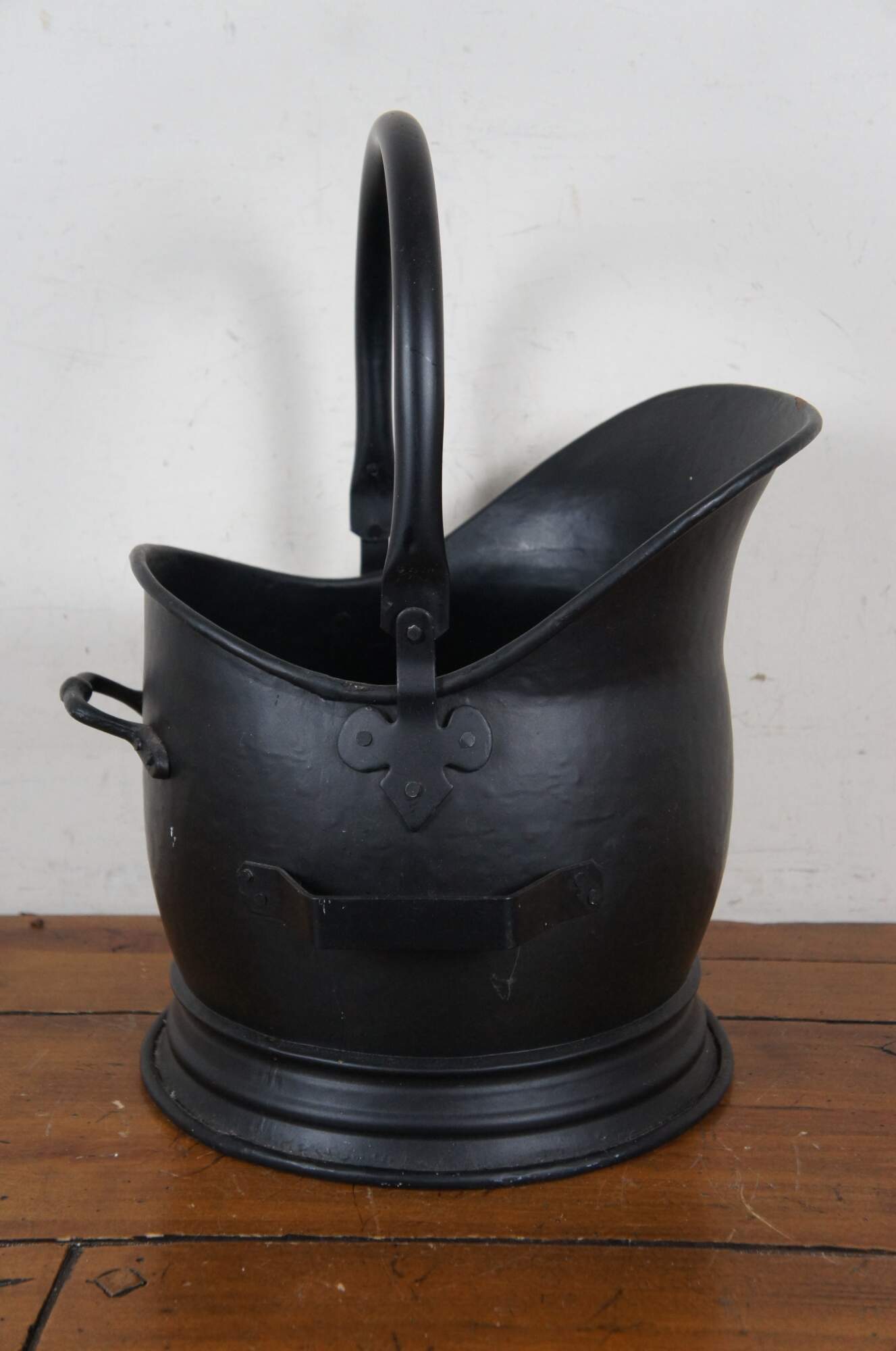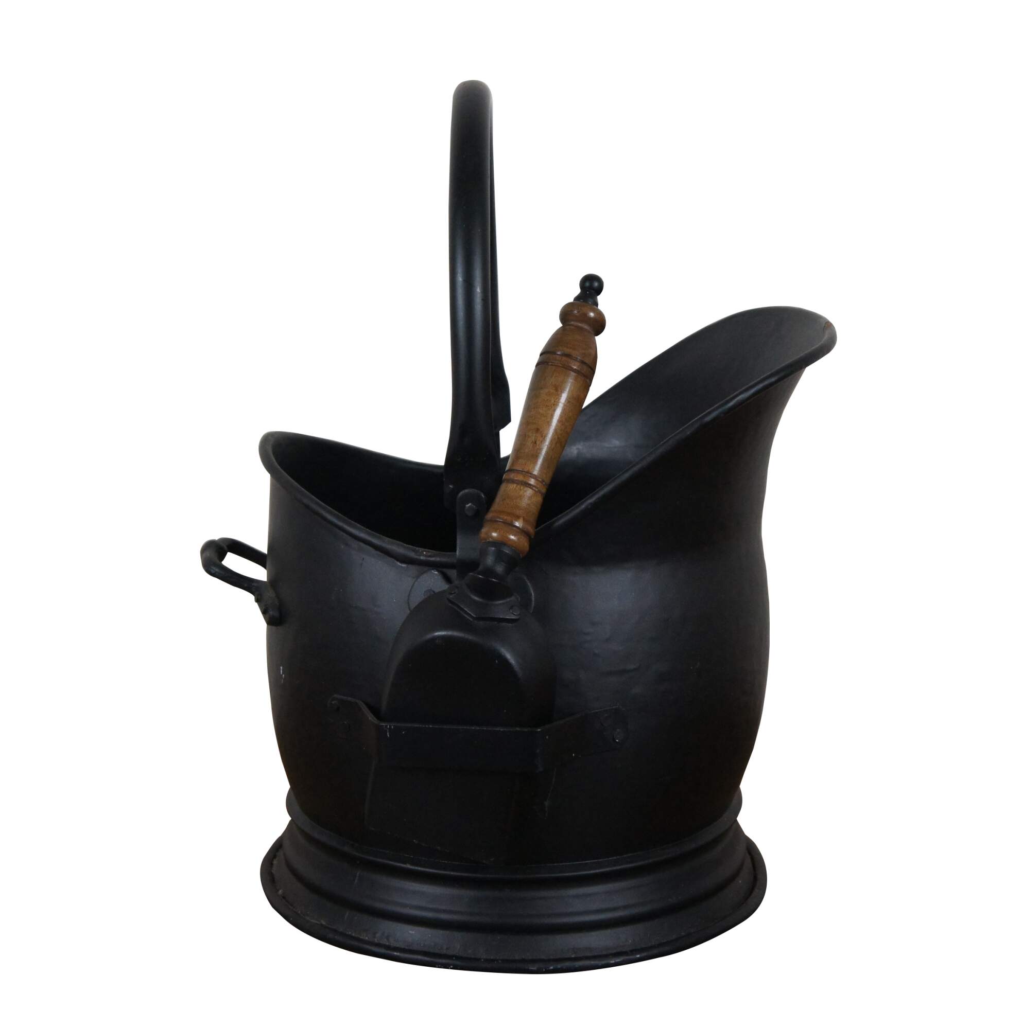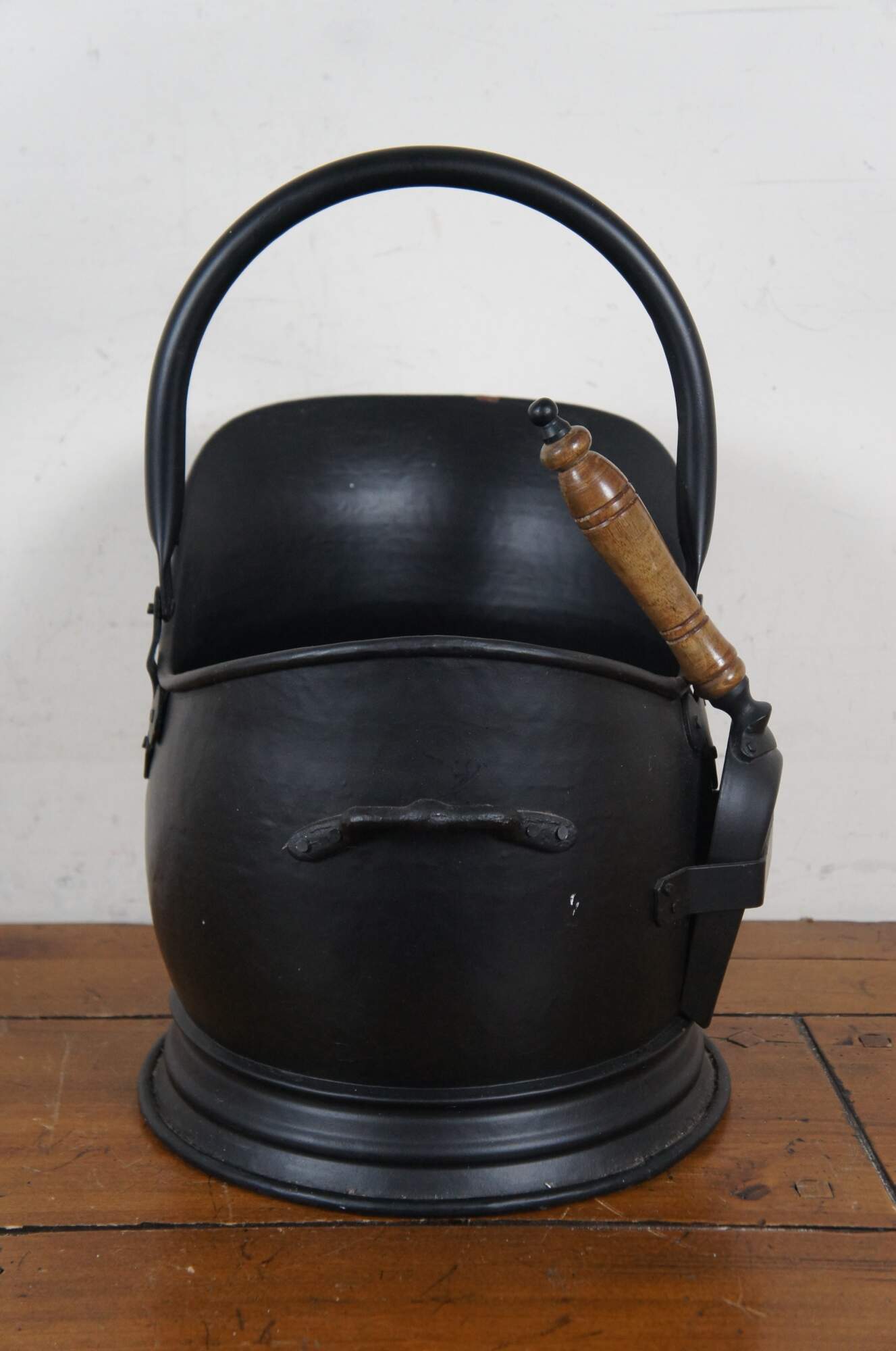 Vintage English Victorian style black steel fireplace hearthware coal scuttle / hod bucket with shovel.
