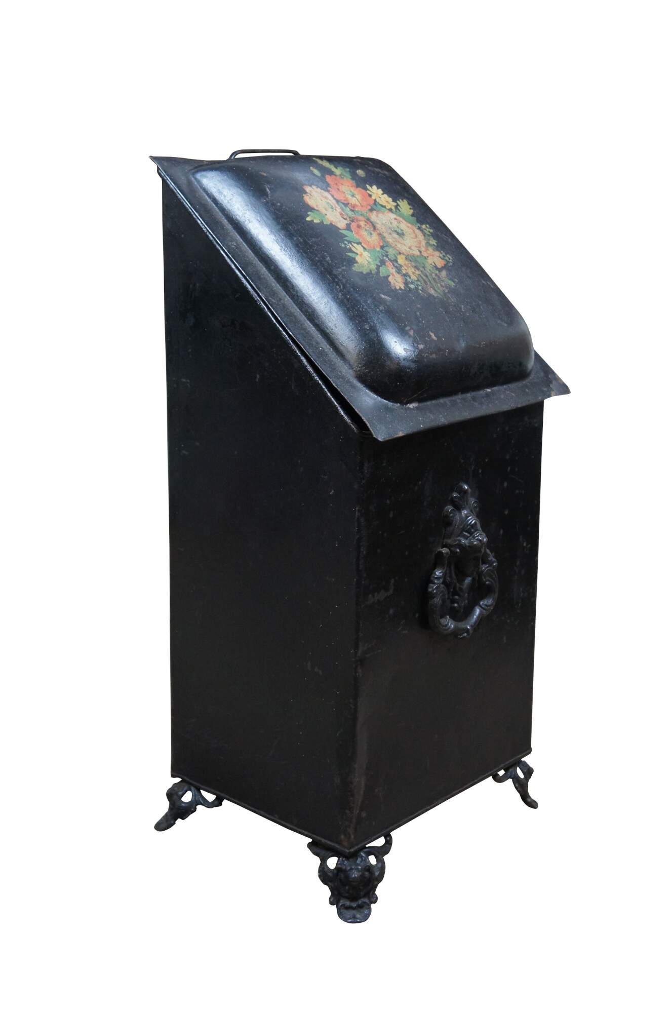 Early 20th century farmhouse black tin fireplace coal scuttle / hearthware bucket / bin. Rectangular form with slanted lid, embellished with applied orange and yellow flowers. Lions head feet; decorative ring on the front featuring an art nouveau female face. Includes black painted insert.