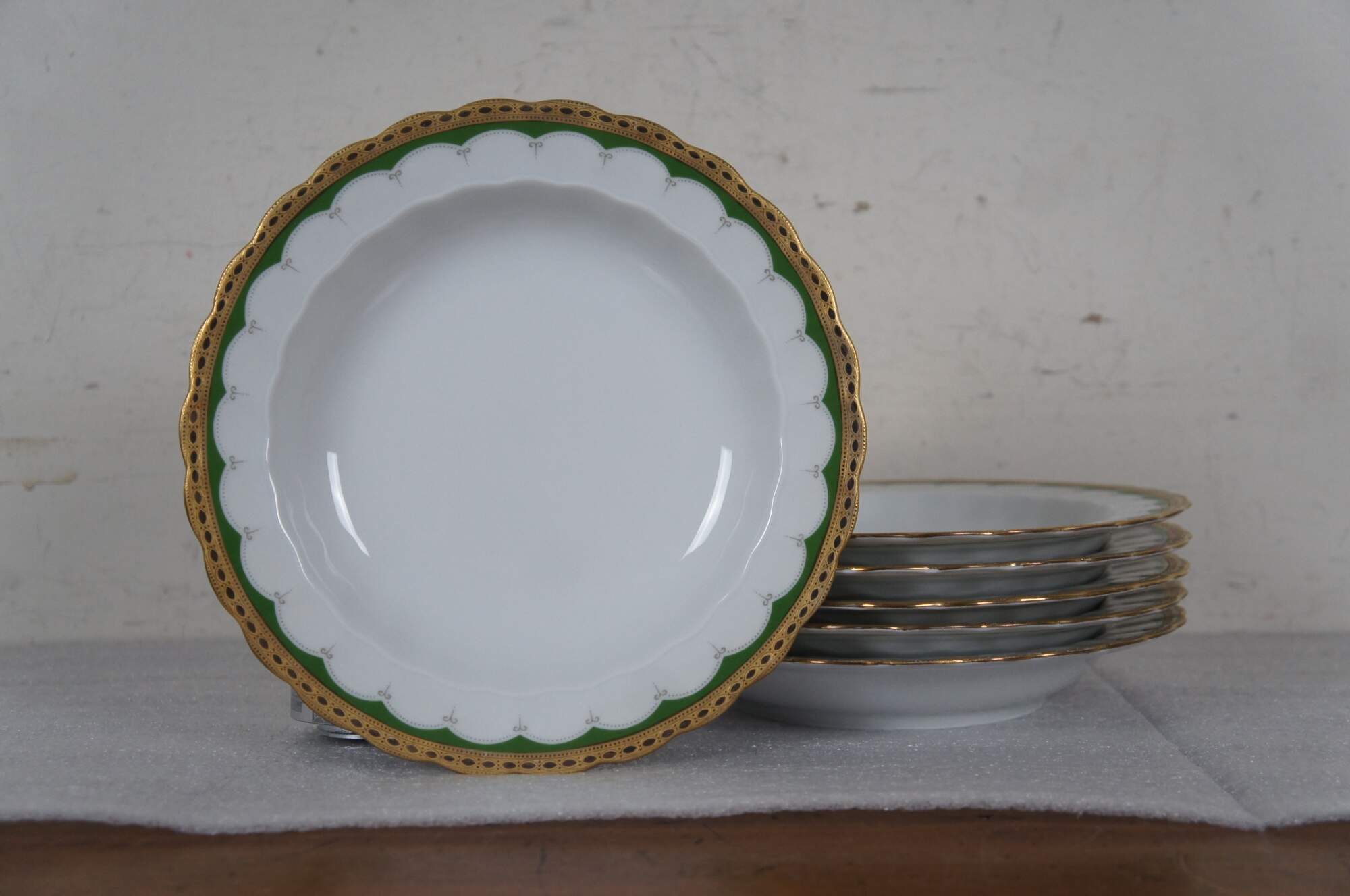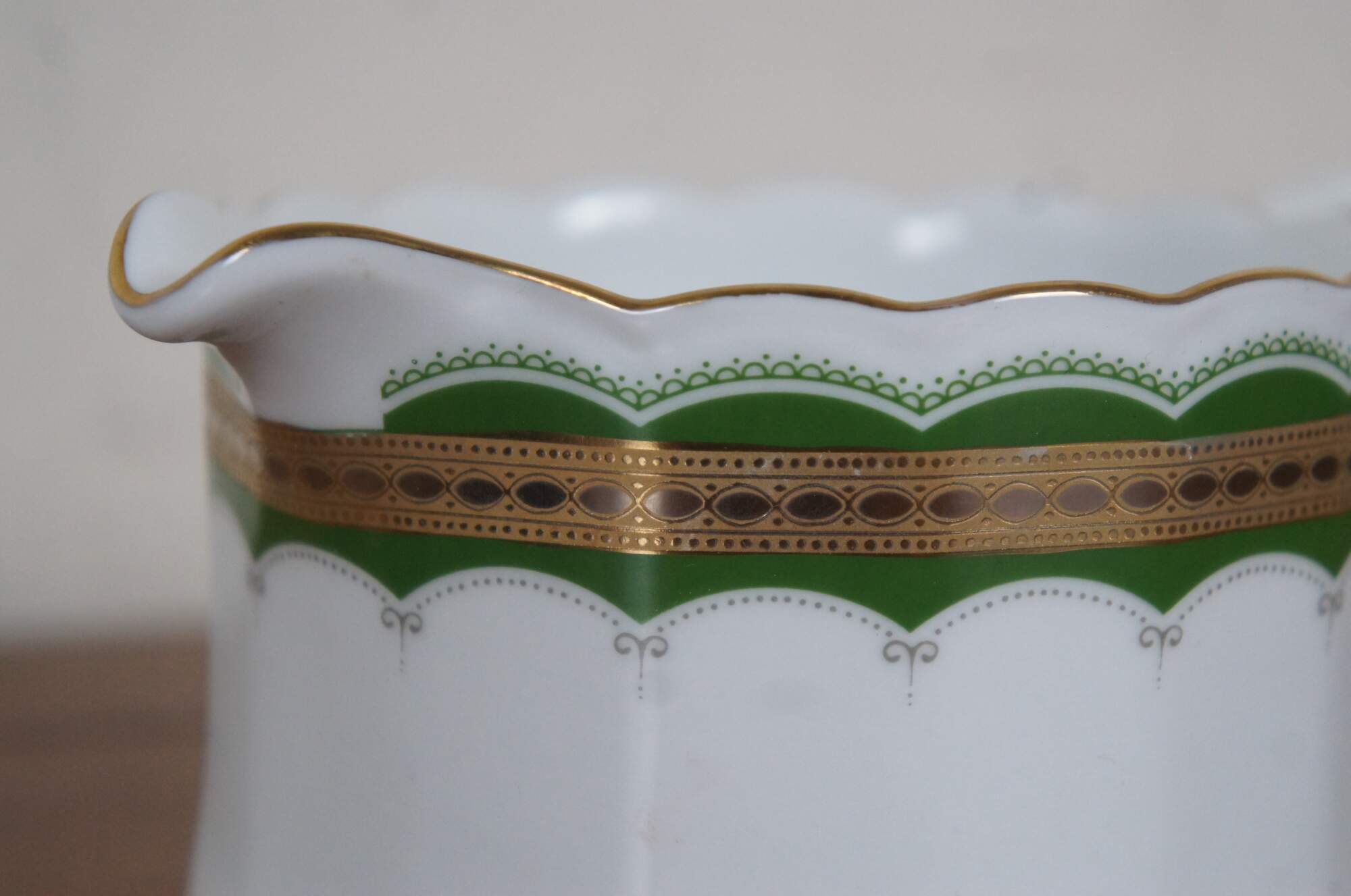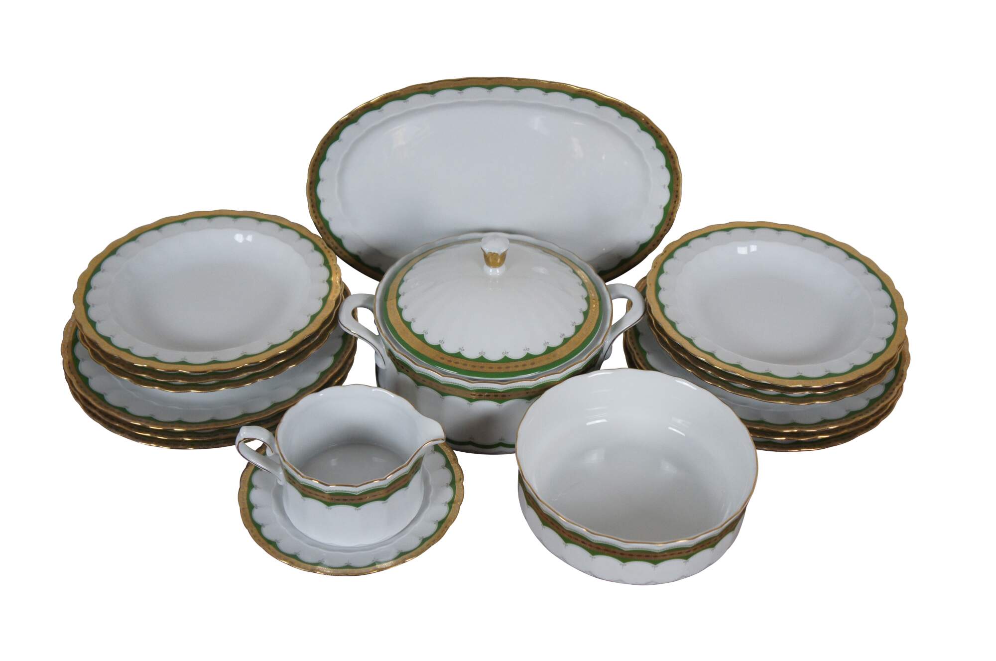 Mid to early 20th century set of Eschenbach china. Scalloped edges, decorated with a Neoclassical scalloped swag spearpoint motif in green, topped with gilt bands. Set includes: Oval Serving Platter, Round Lidded Serving Dish, Round Serving Bowl, Creamer/Gravy Boat, Under Plate, 6 Salad Plates, 6 Bowls