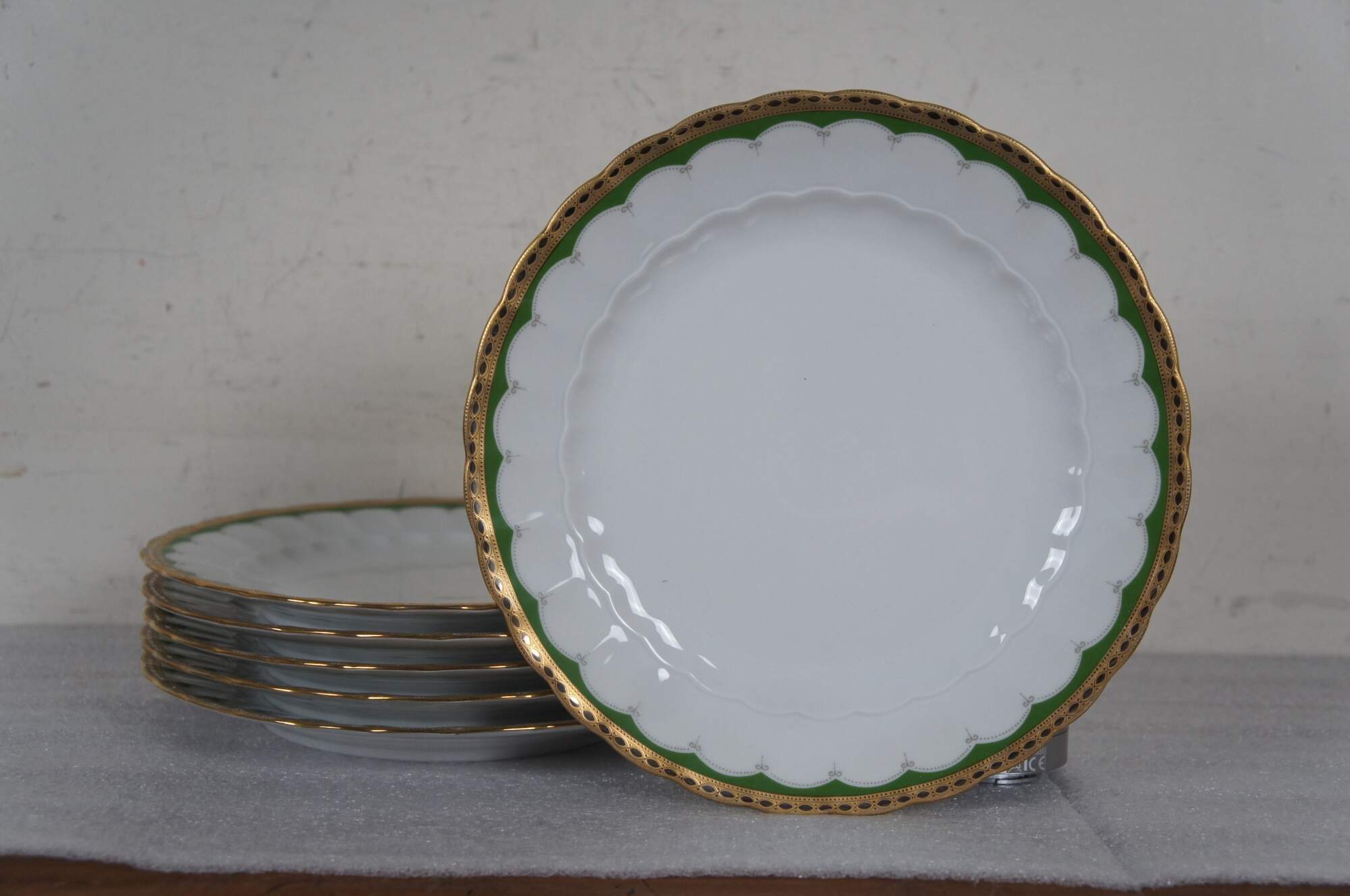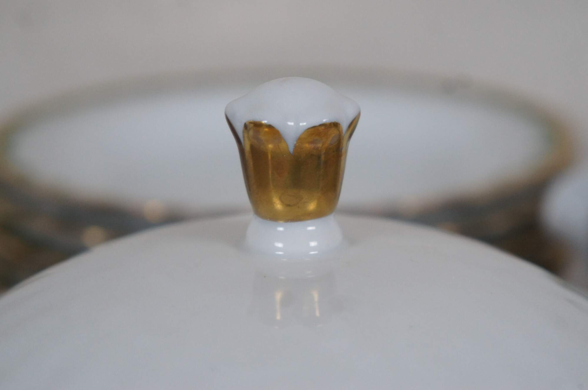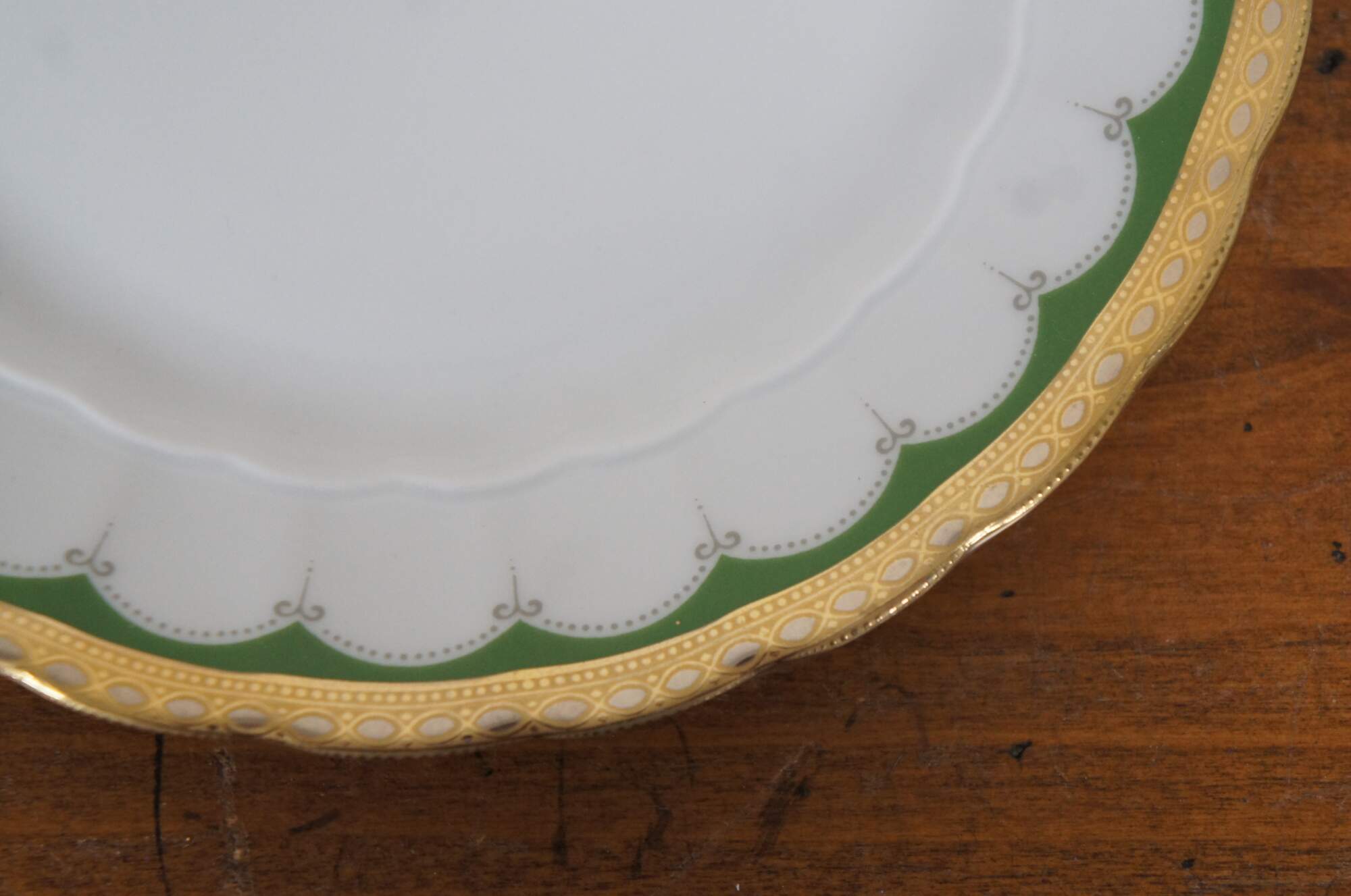Mid to early 20th century set of Eschenbach china. Scalloped edges, decorated with a Neoclassical scalloped swag spearpoint motif in green, topped with gilt bands. Set includes: Oval Serving Platter, Round Lidded Serving Dish, Round Serving Bowl, Creamer/Gravy Boat, Under Plate, 6 Salad Plates, 6 Bowls